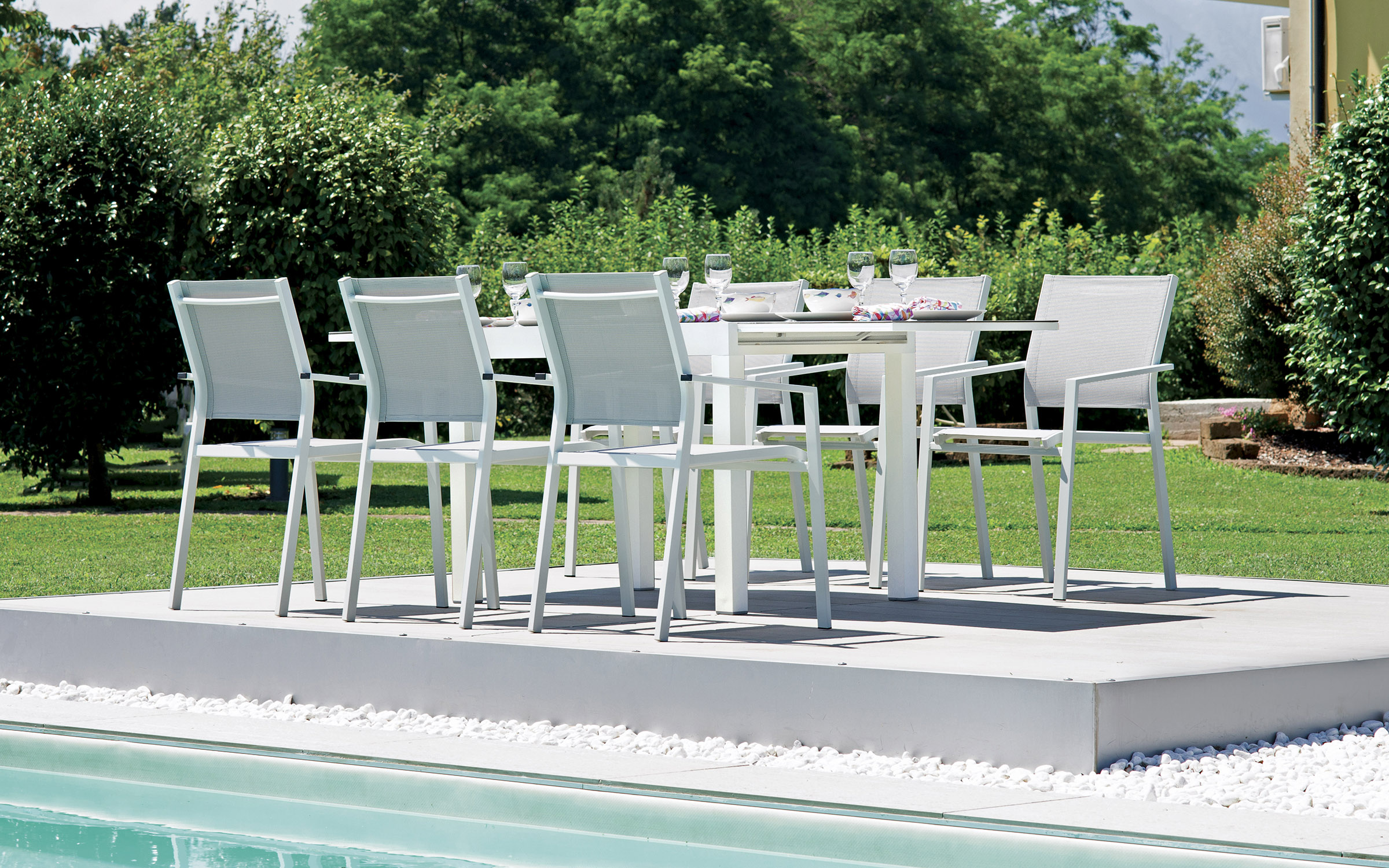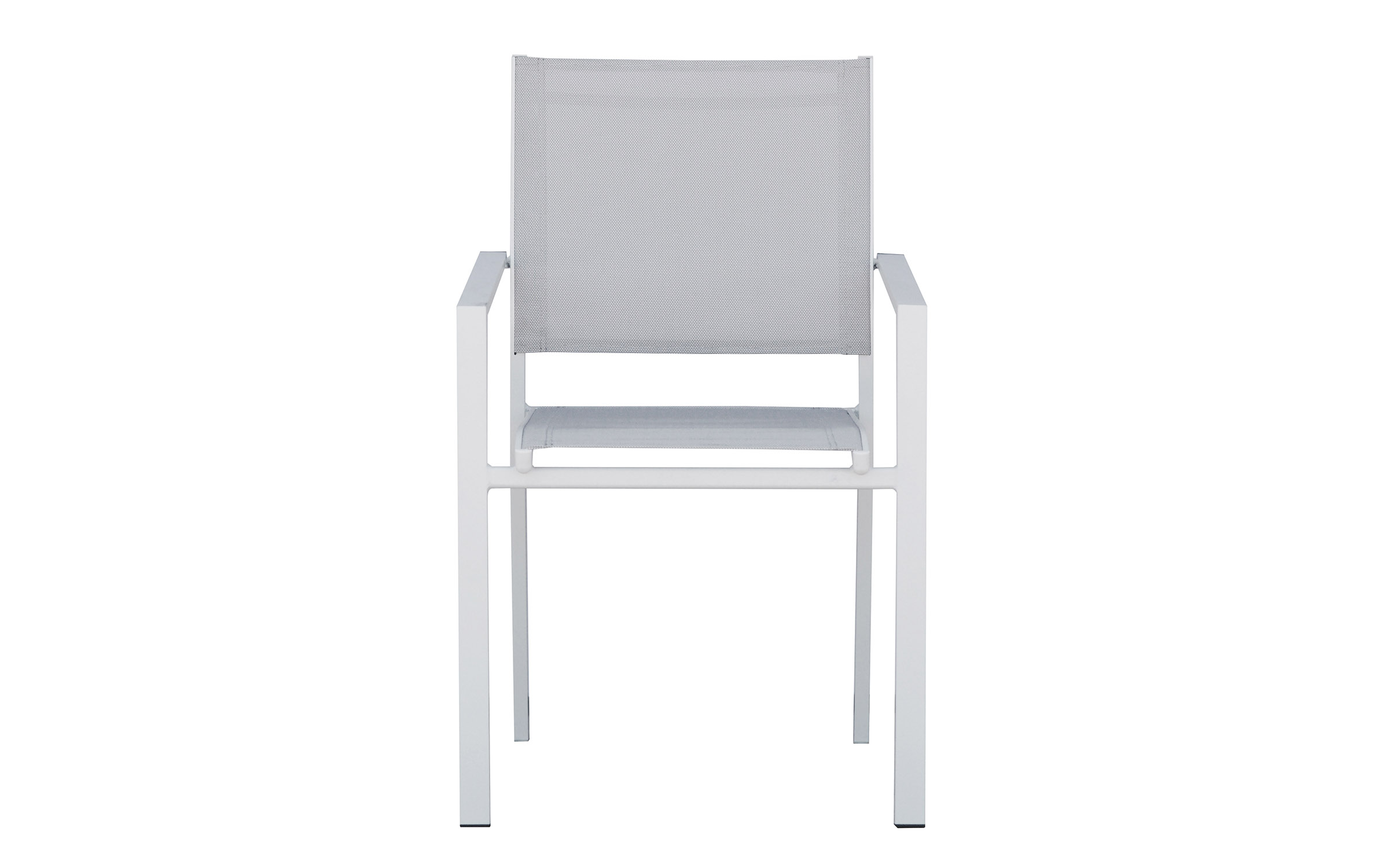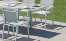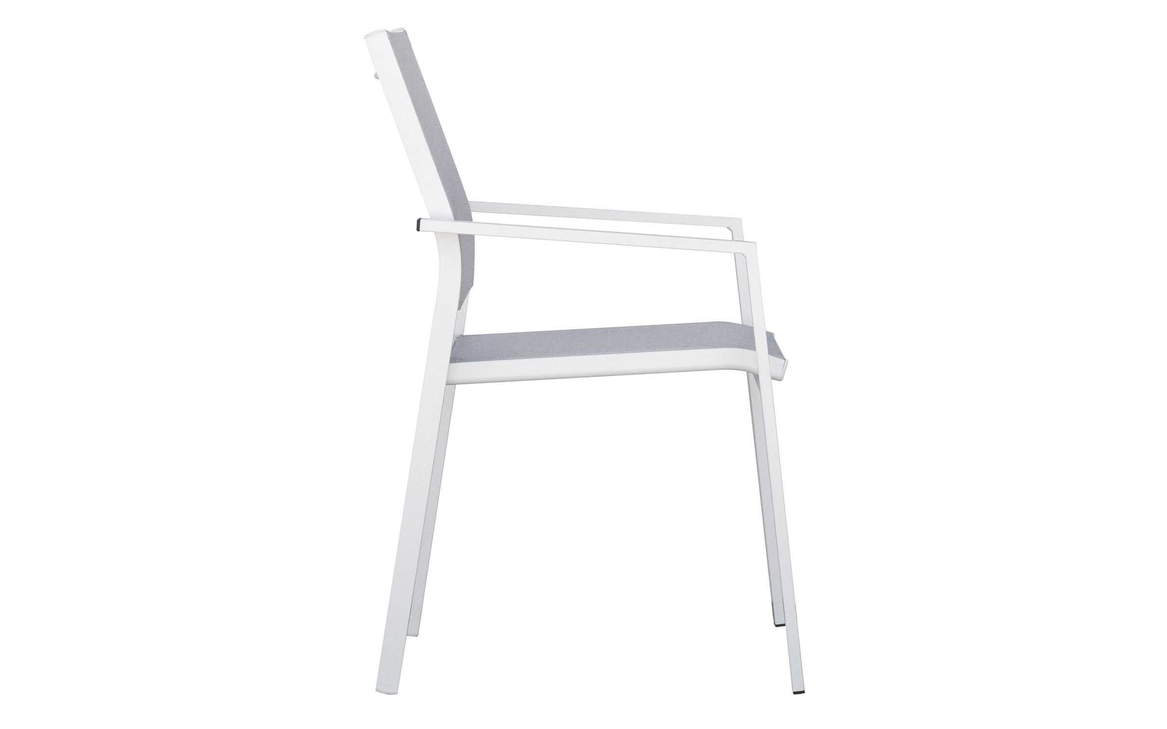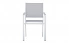 Nowoczesne krzesło ogrodowe z podłokietnikami, wykonane z aluminium malowanego proszkowo oraz tekstyliny odpornej na warunki atmosferyczne. Konstrukcja sztaplowana pozwala na wygodne przechowywanie. Idealne do zestawów jadalnianych na tarasie lub balkonie. Dostępne w dwóch wersjach kolorystycznych: