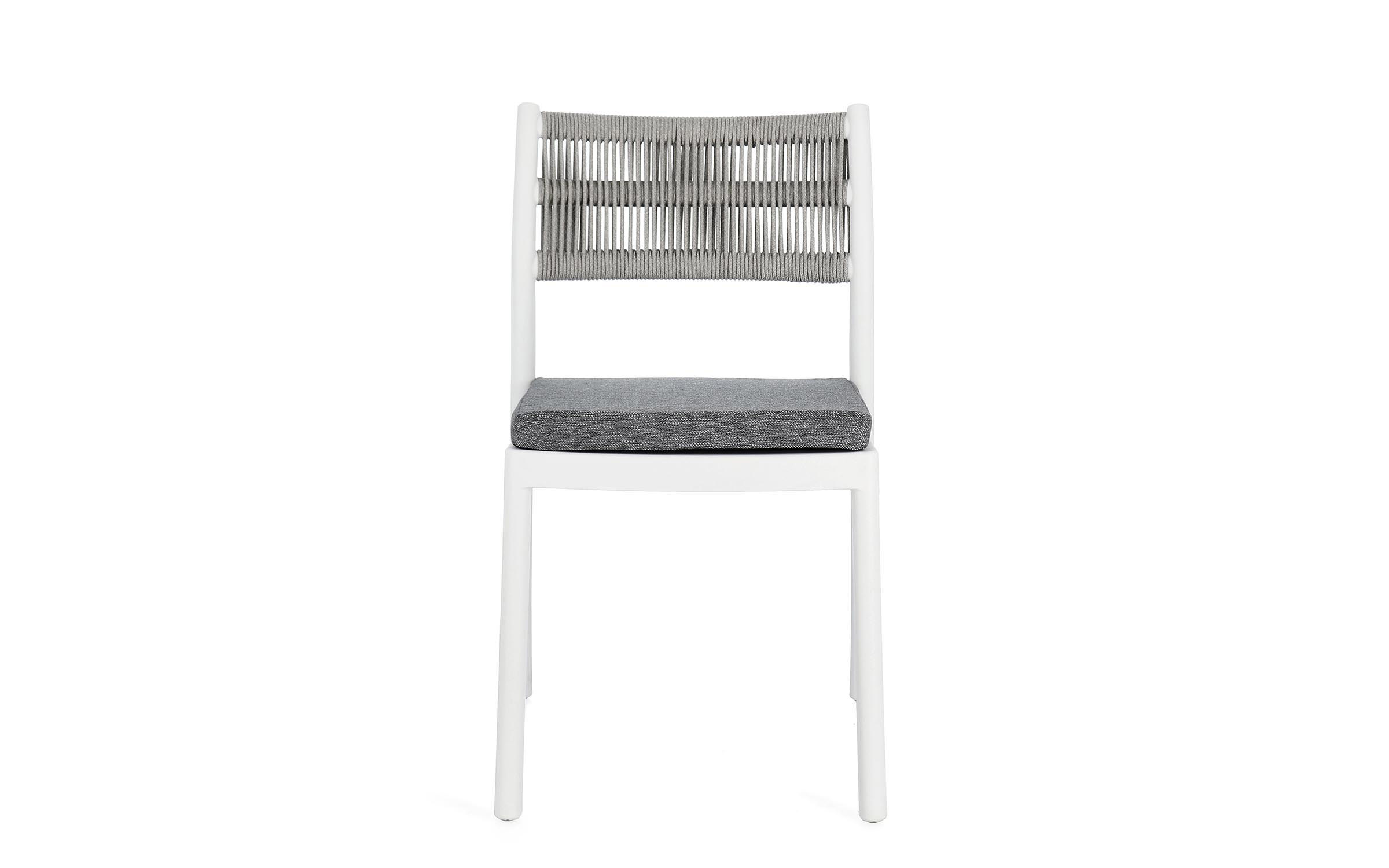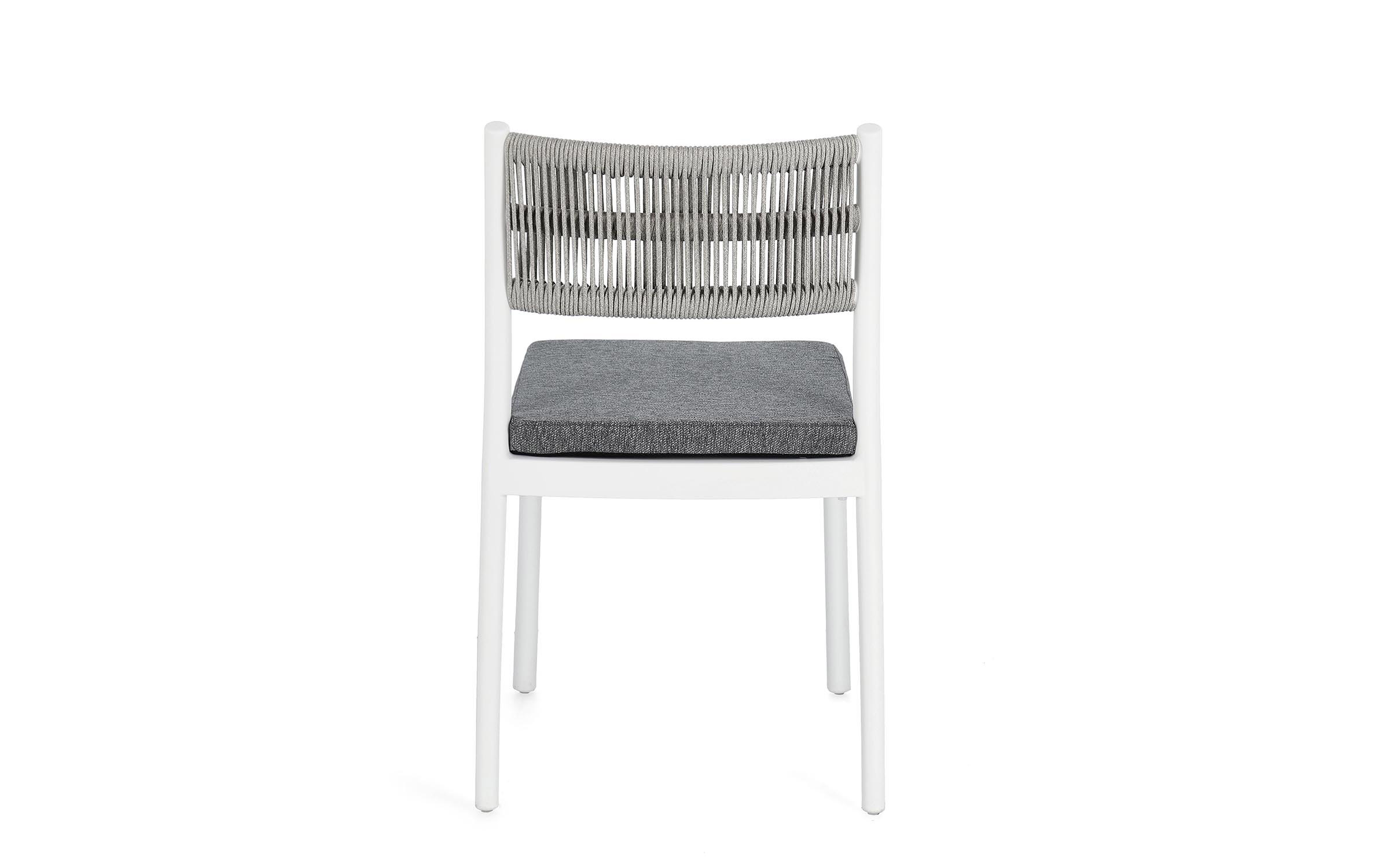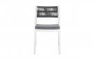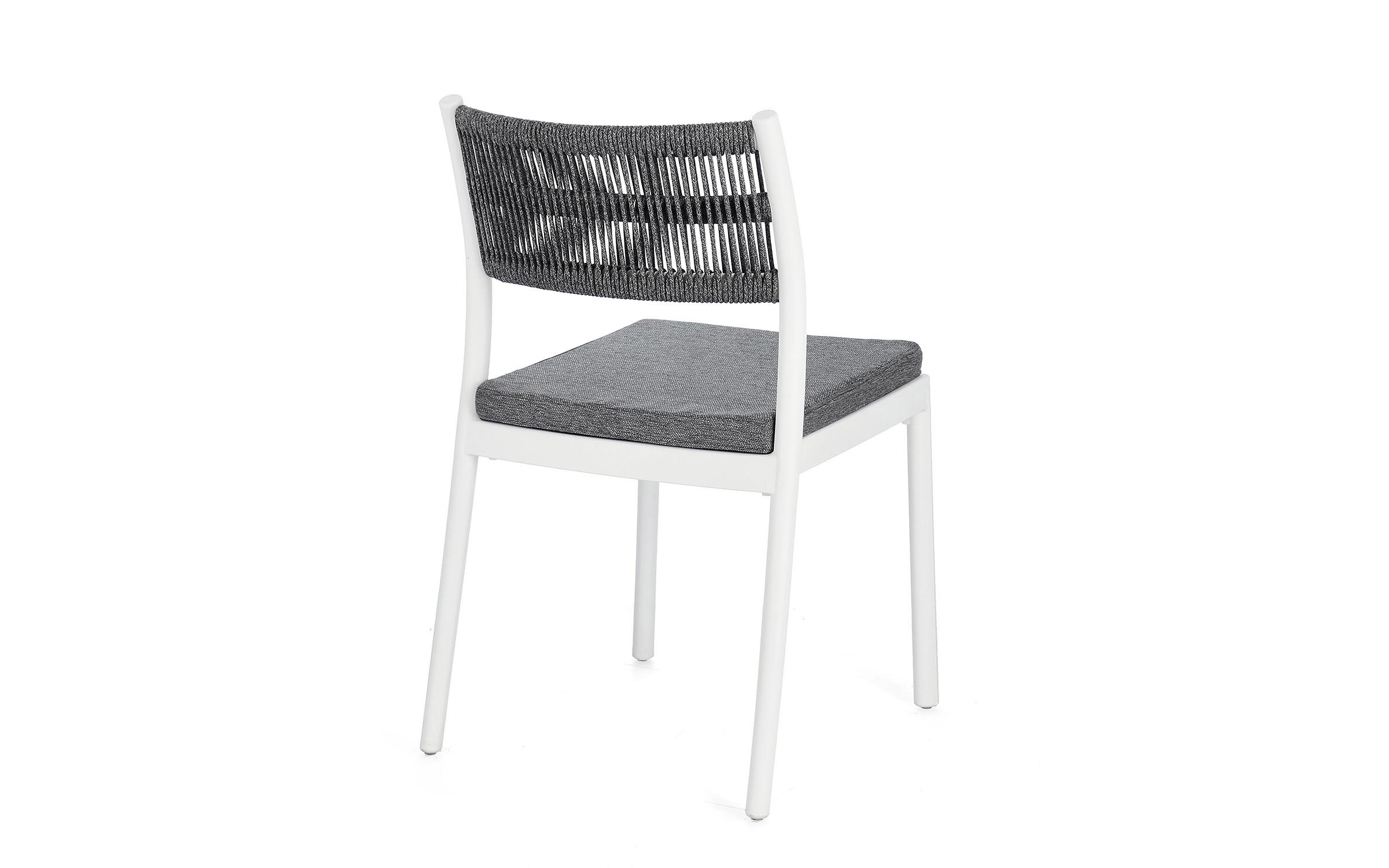 Aluminiowe krzesło na taras w kolorze białym z możliwością sztaplowania. Oparcie oplecione liną.