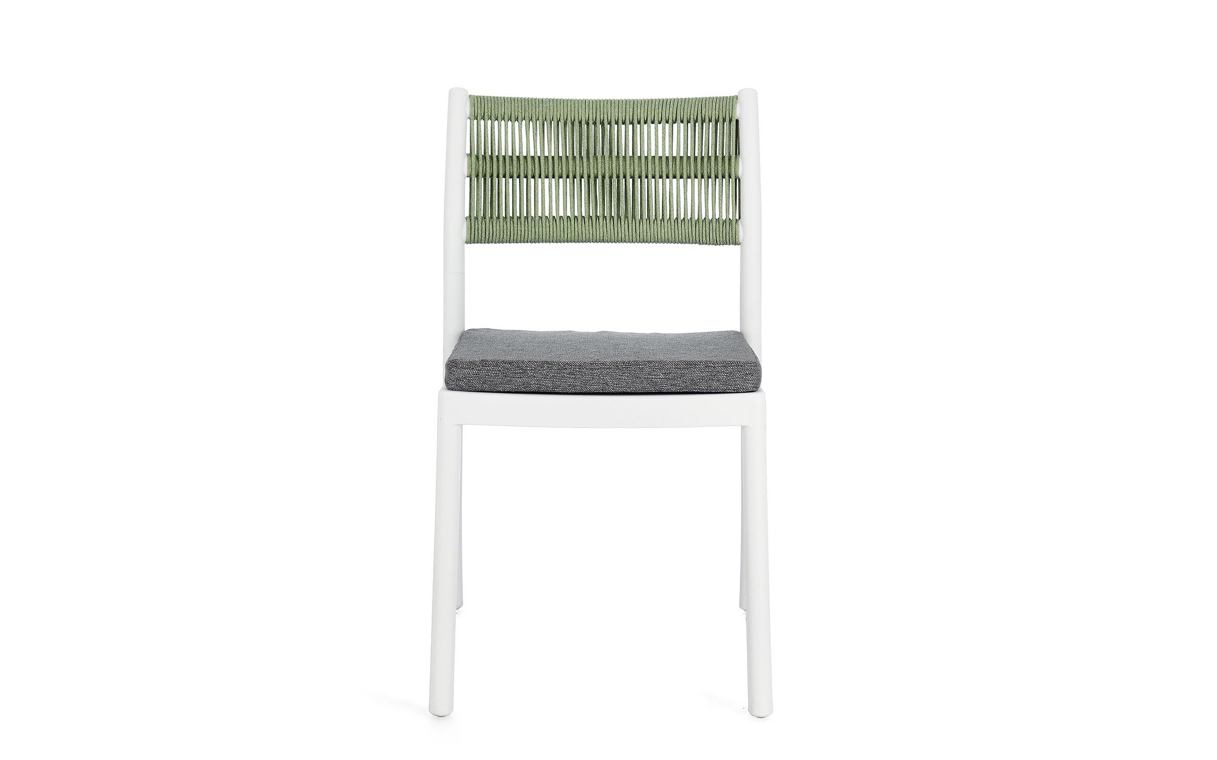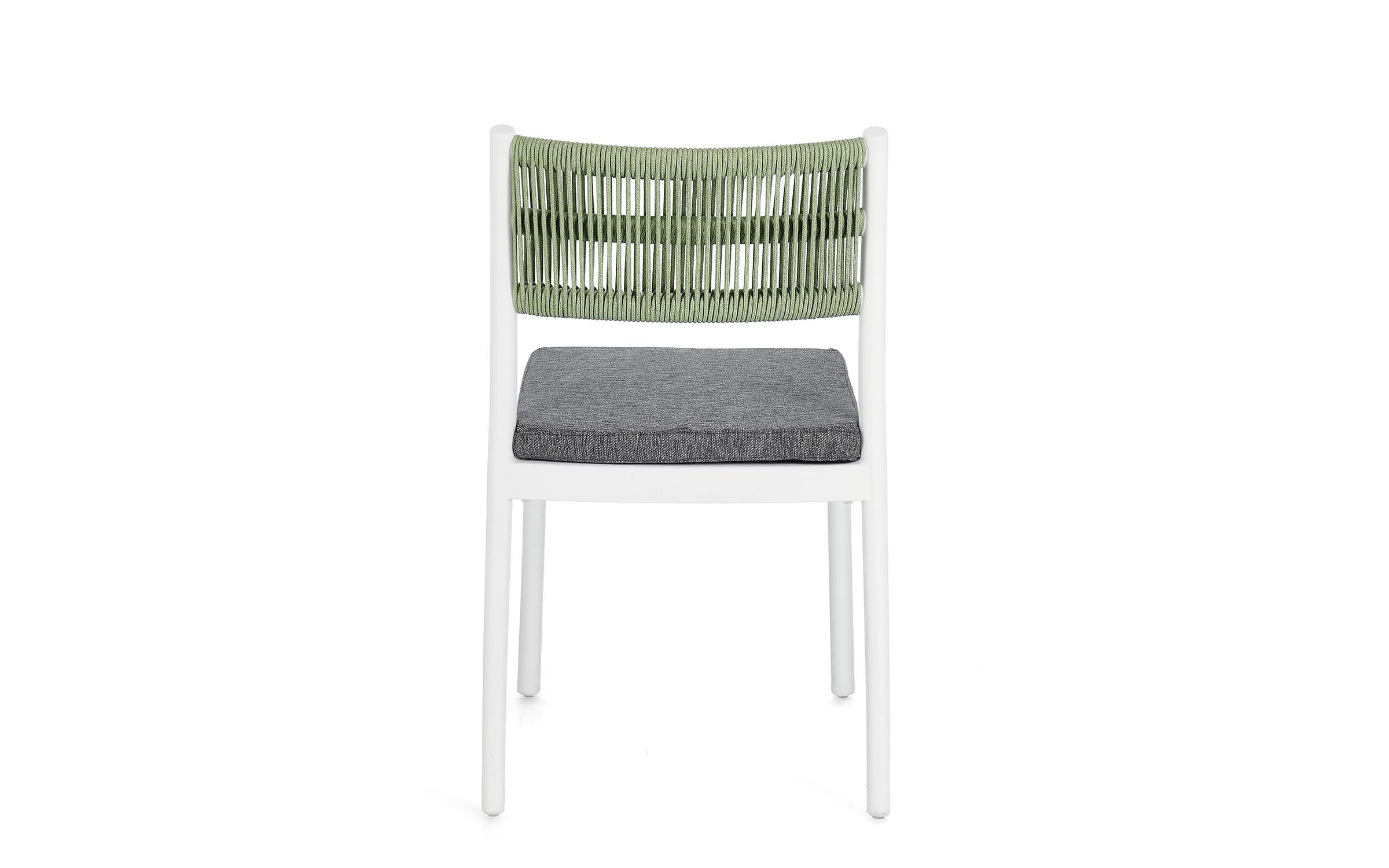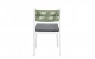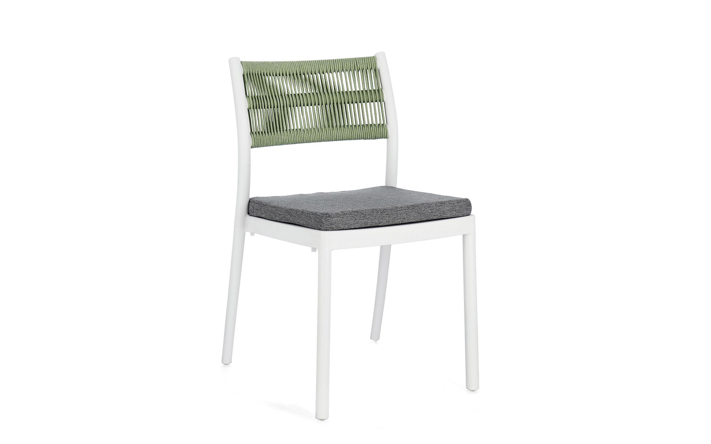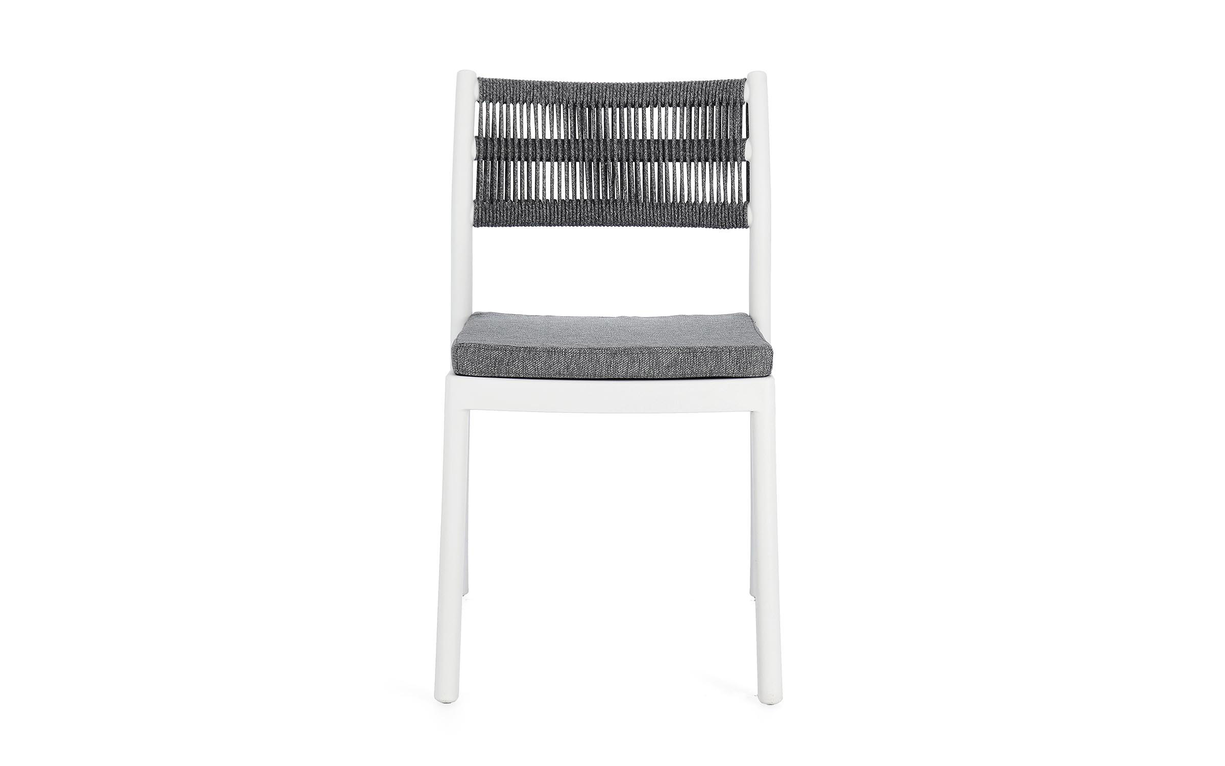 Aluminiowe krzesło na taras w kolorze białym z możliwością sztaplowania. Oparcie oplecione liną.