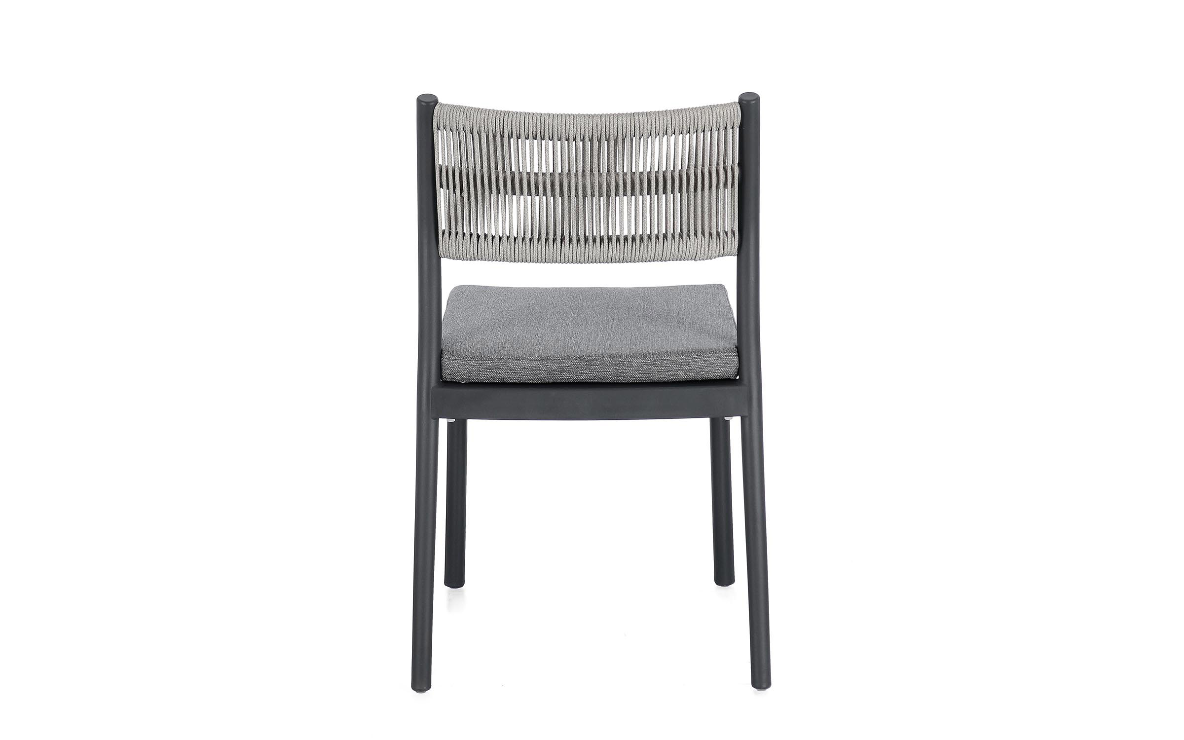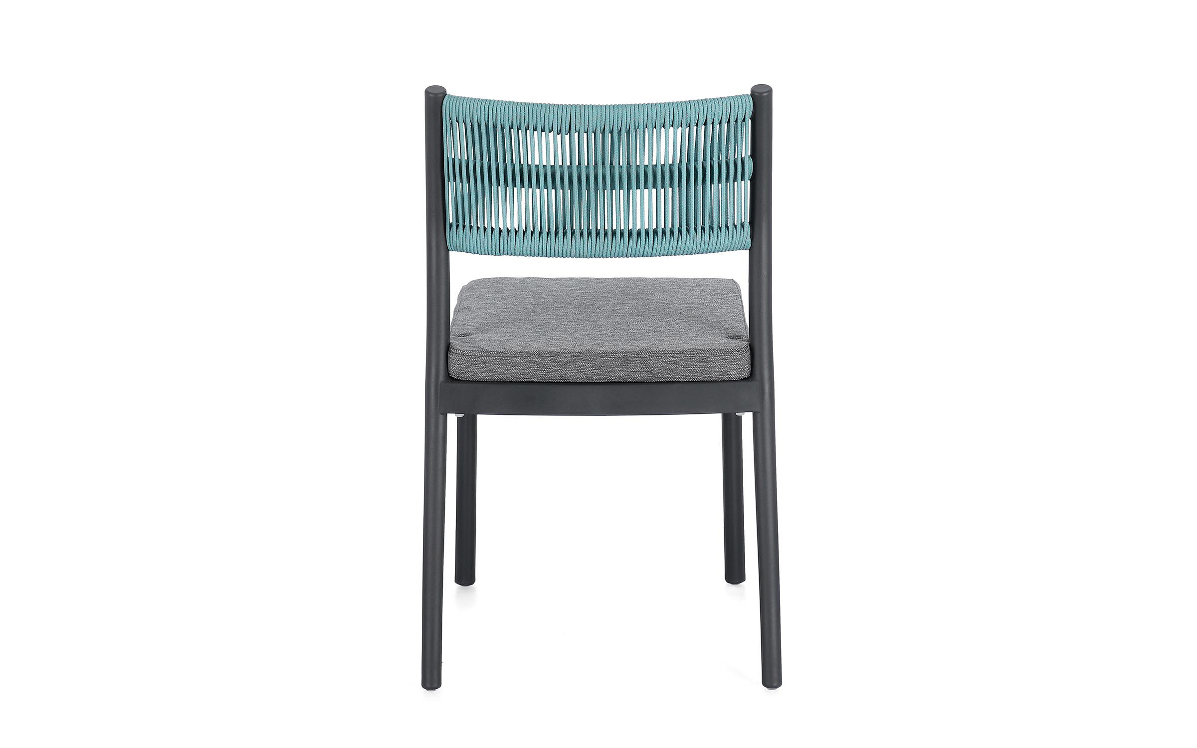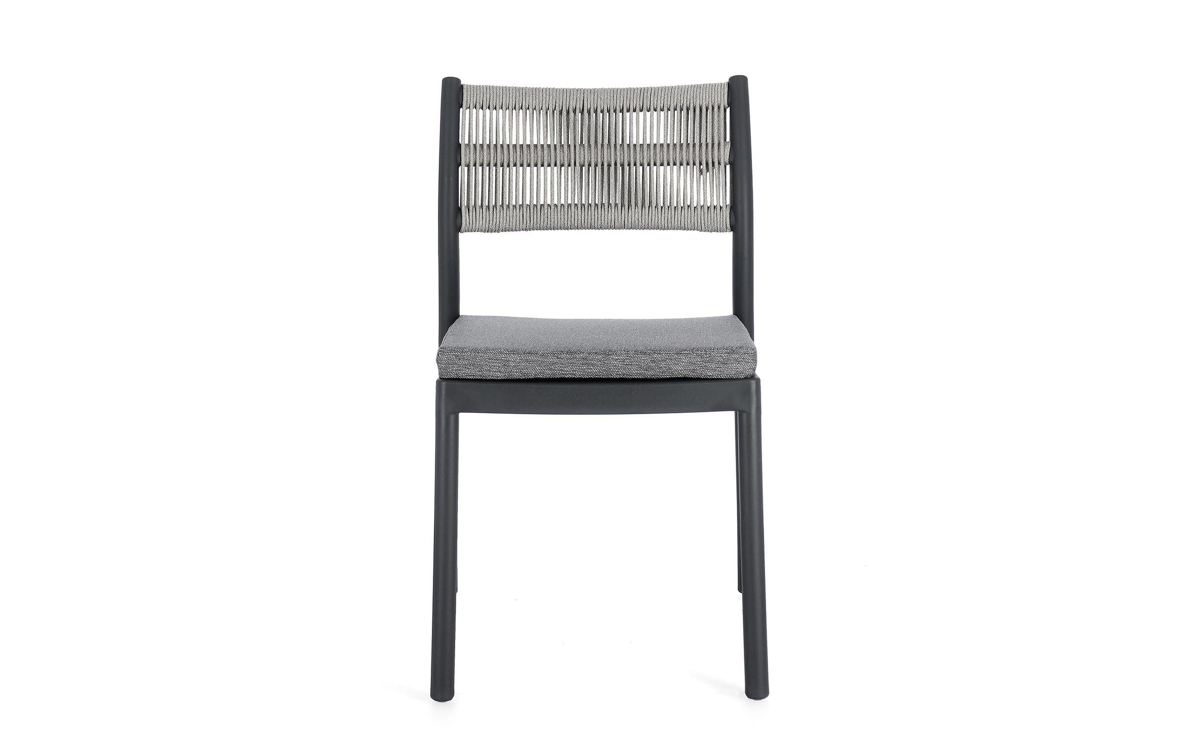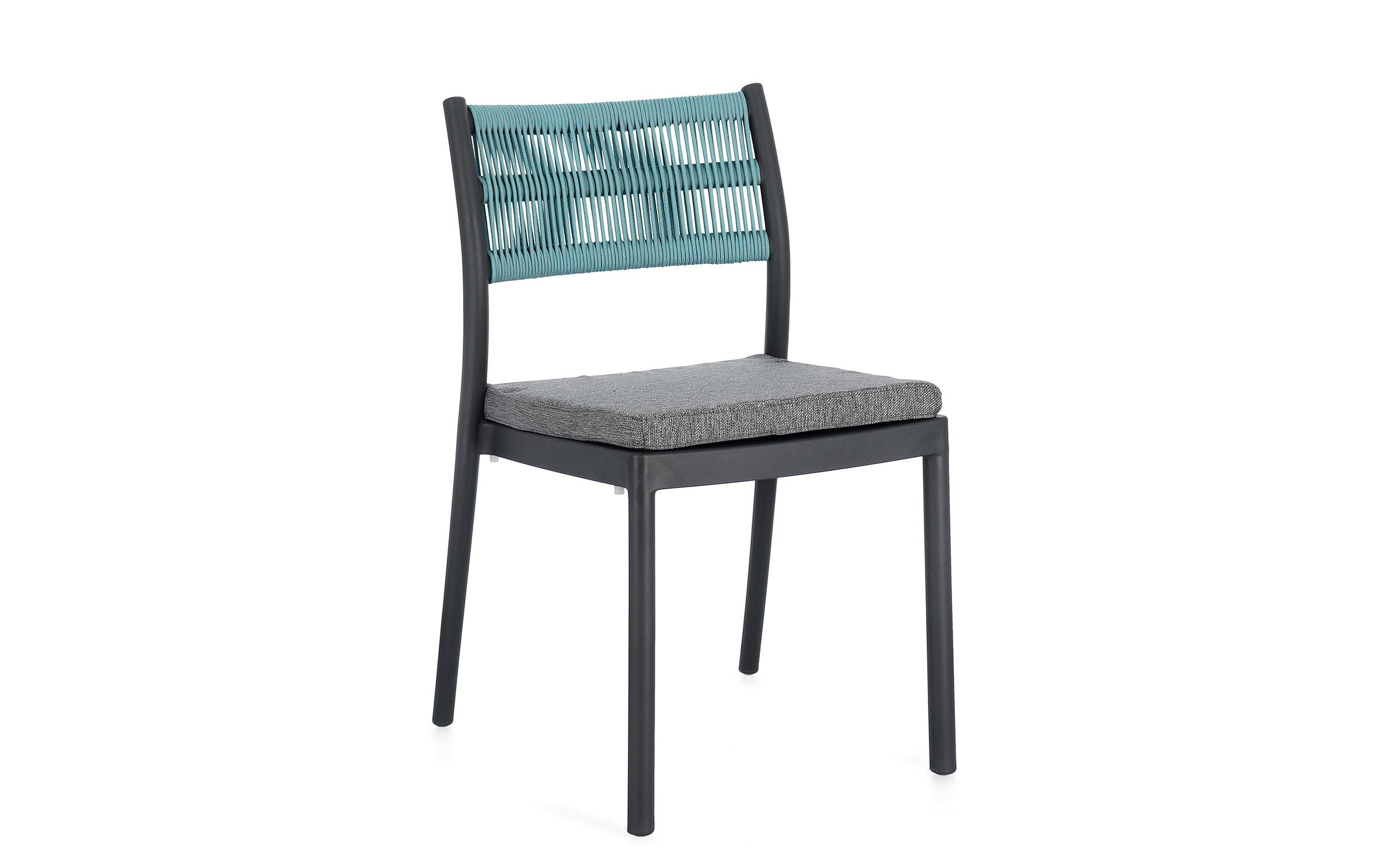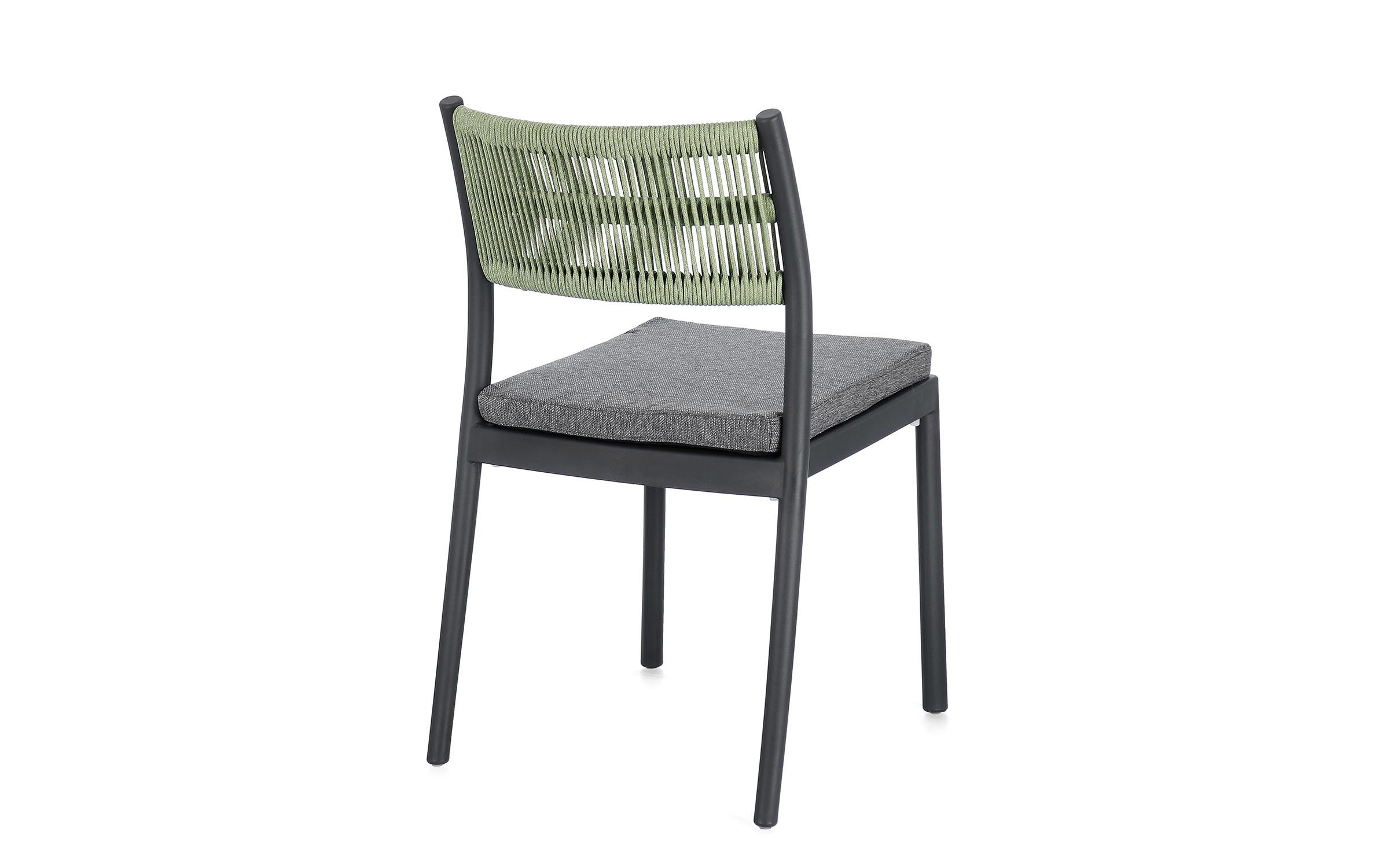 Aluminiowe krzesło na taras w kolorze białym z możliwością sztaplowania. Oparcie oplecione liną.
