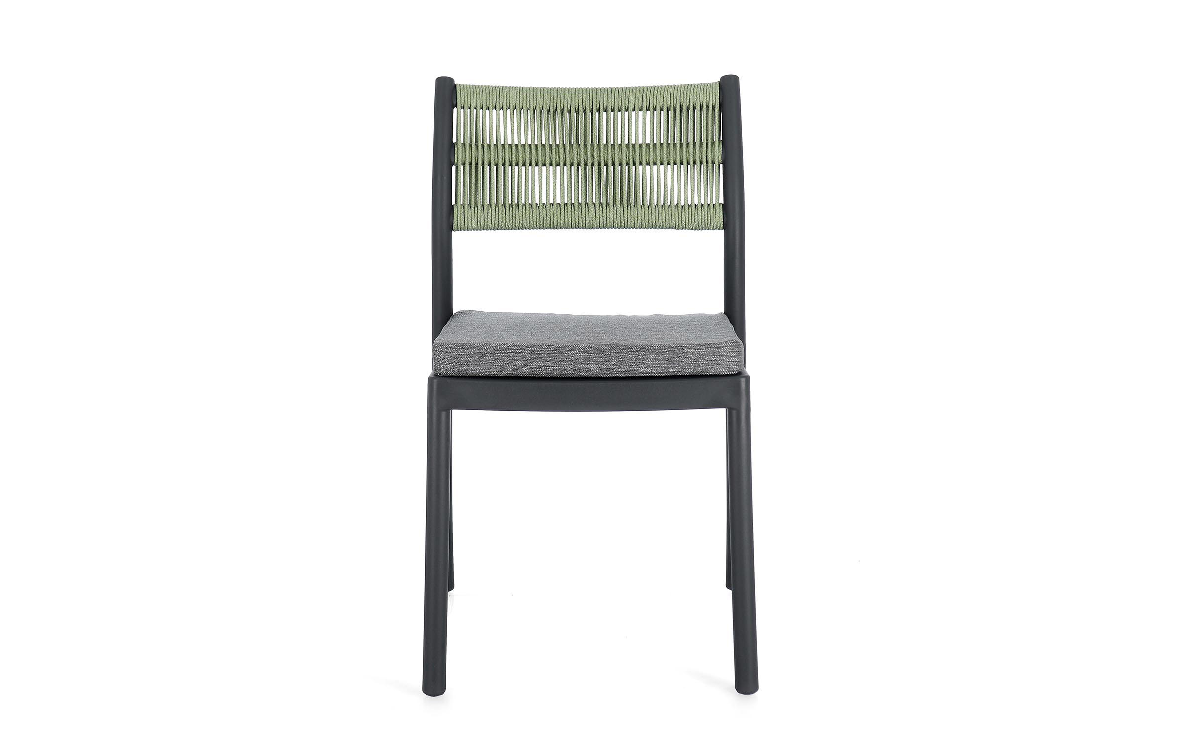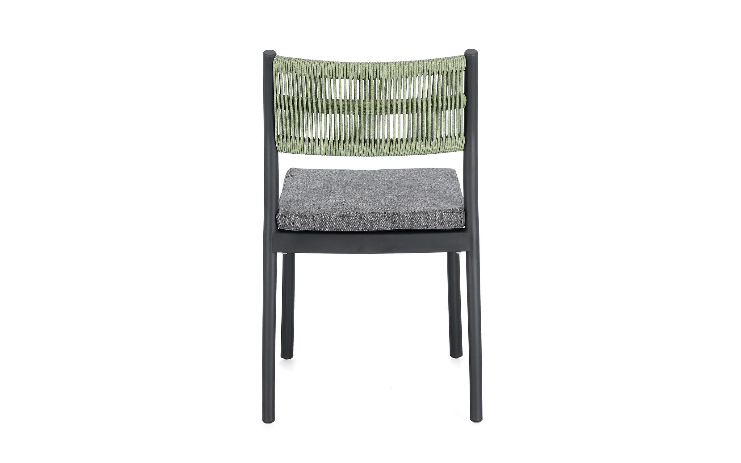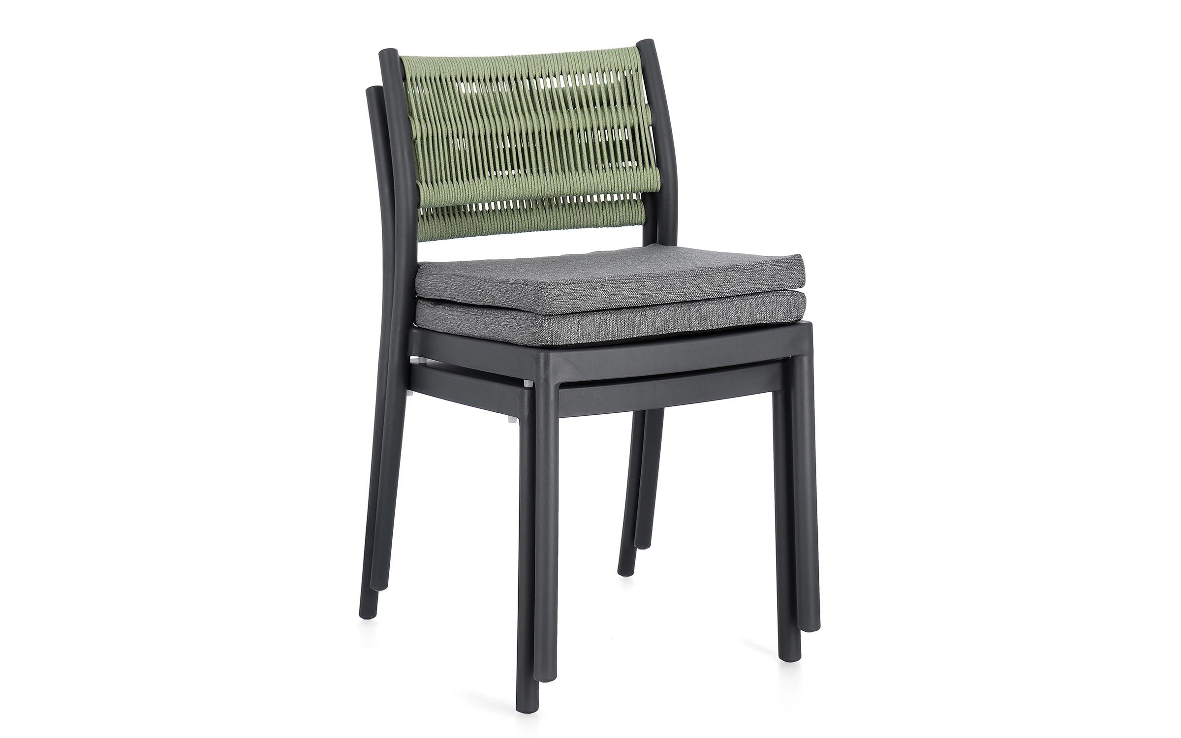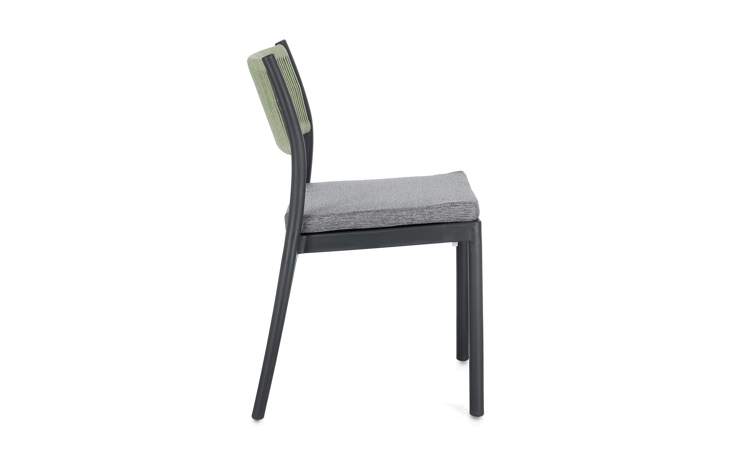 Aluminiowe krzesło na taras w kolorze białym z możliwością sztaplowania. Oparcie oplecione liną.