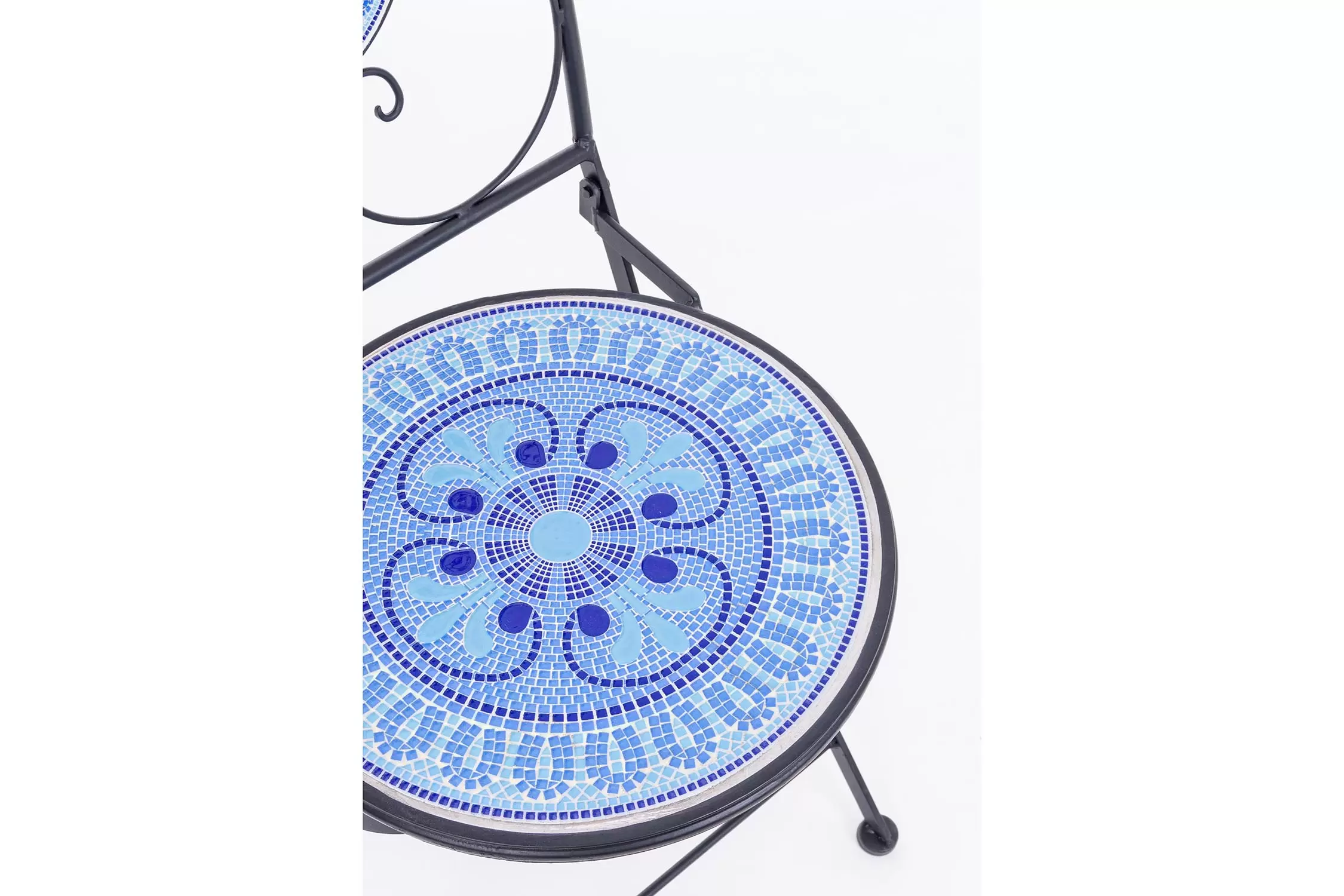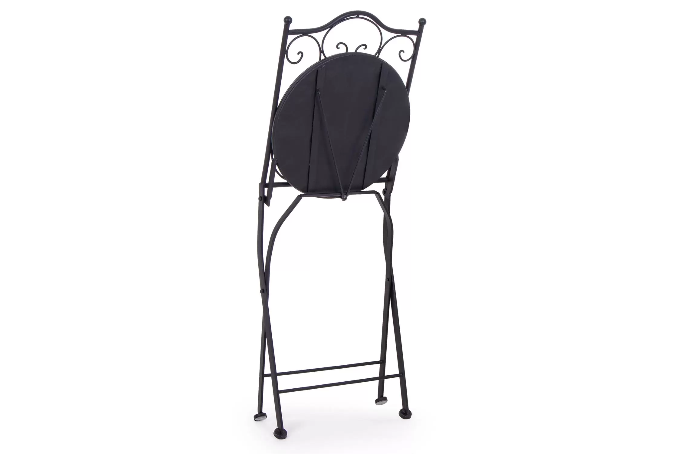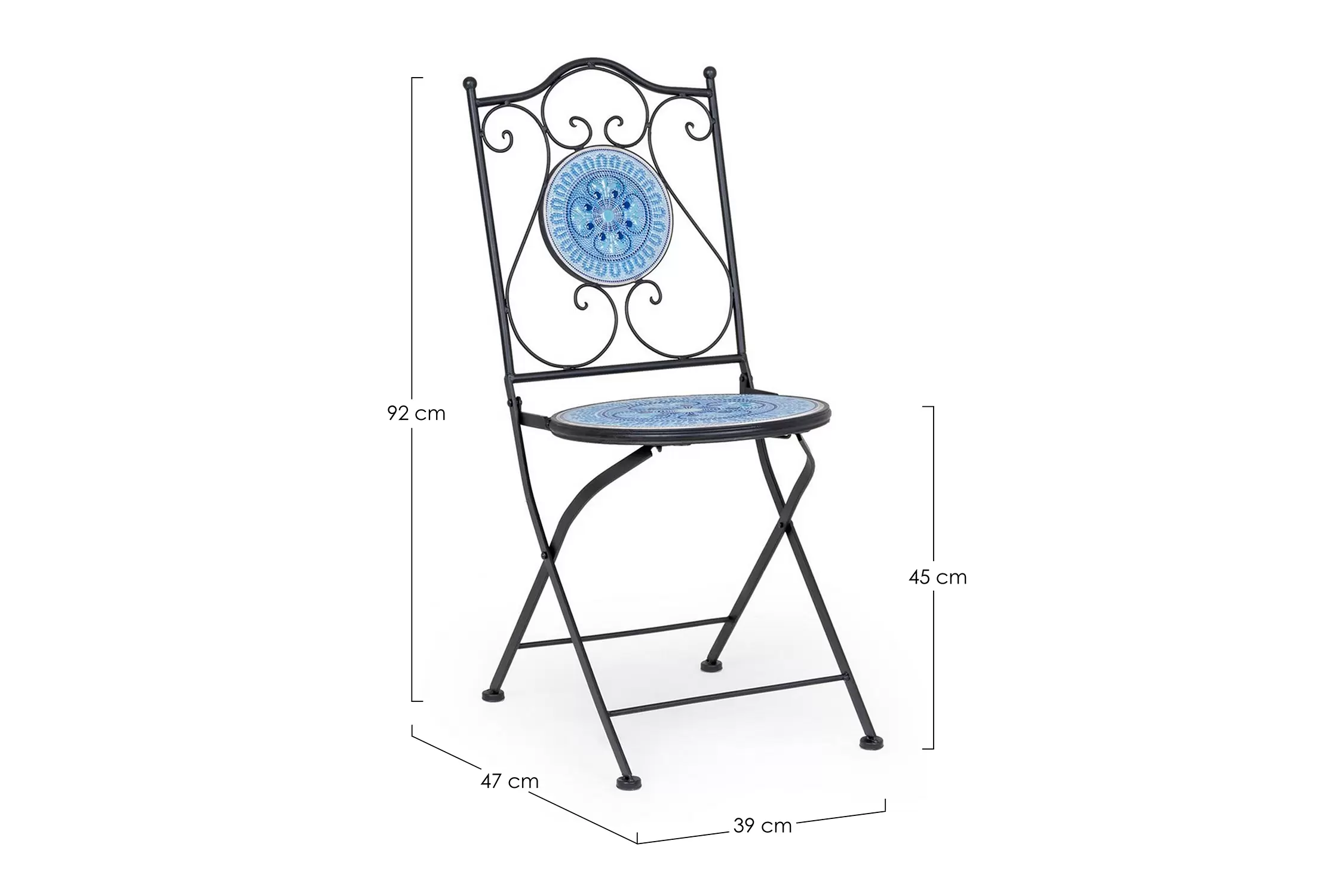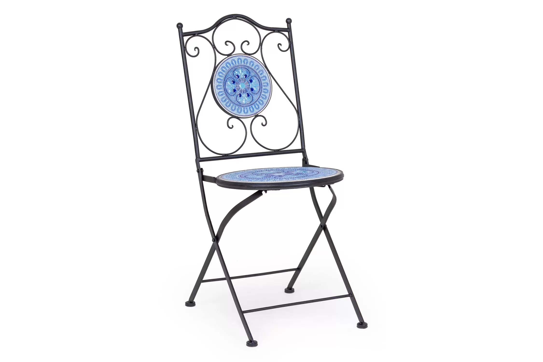 Składane krzesło w stylu retro z ceramicznym siedziskiem i ceramicznym wzorem na oparciu. Idealne do ogródków restauracyjnych.