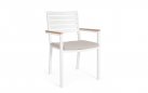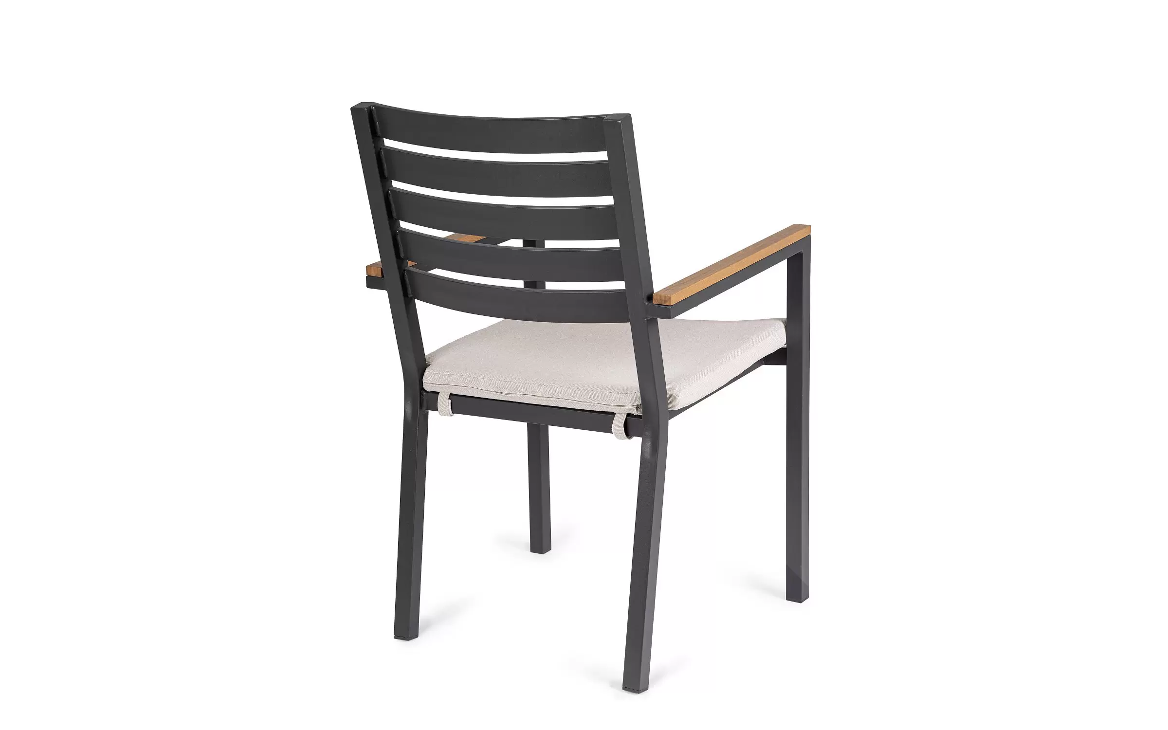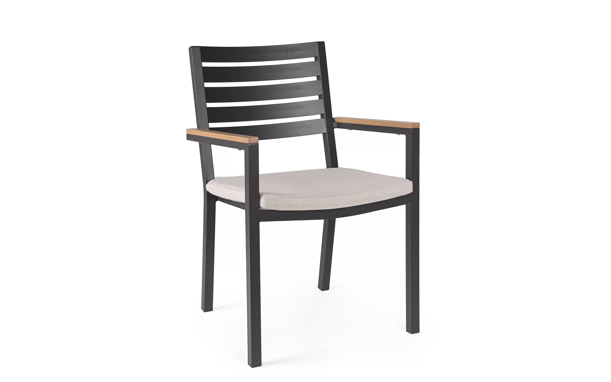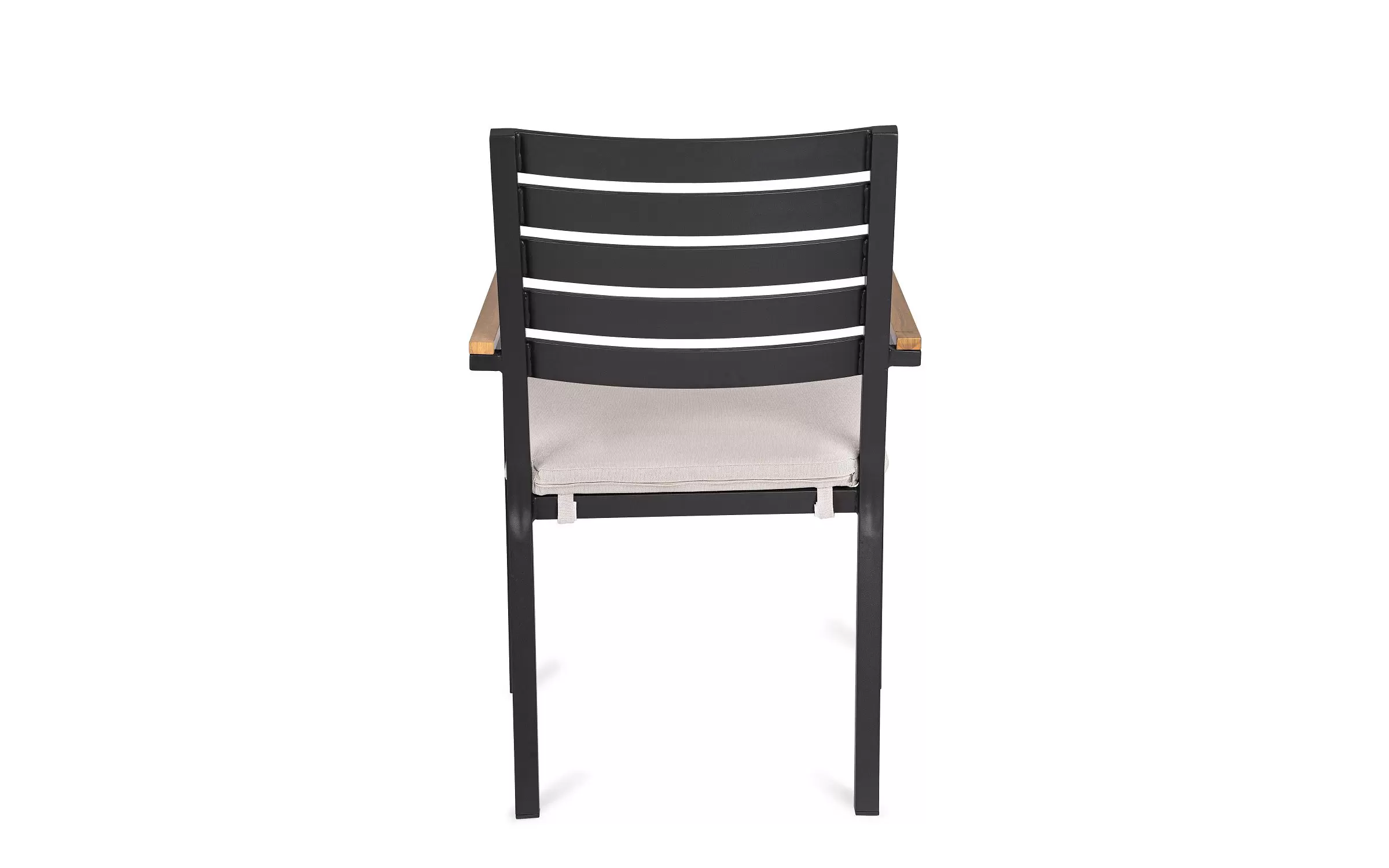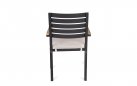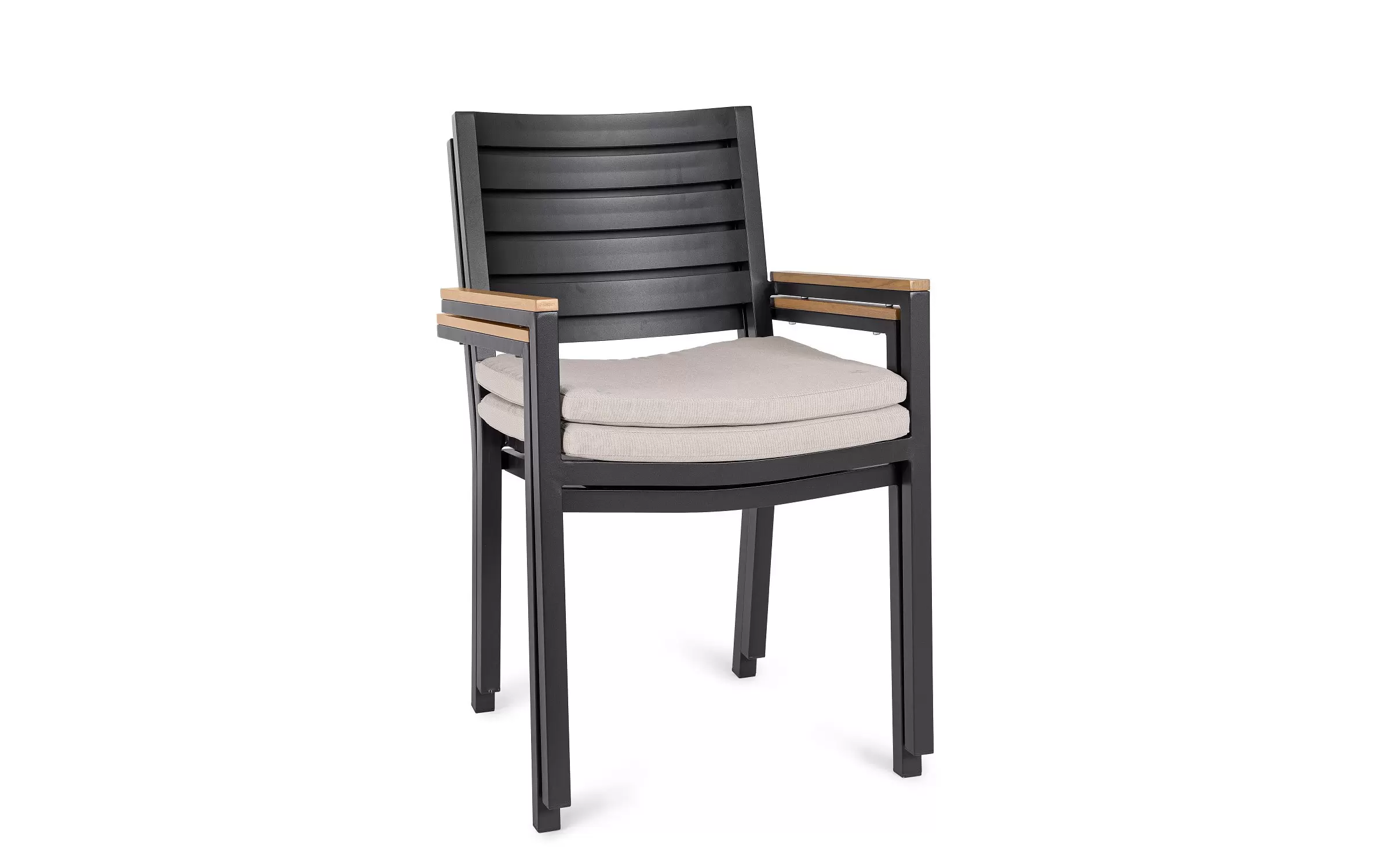 Aluminiowe niskie krzesło ogrodowe z poduszką z podłokietnikami pokrytymi powłoką imitującą drewno. Można układać w stos w celu łatwiejszego przechowywania.