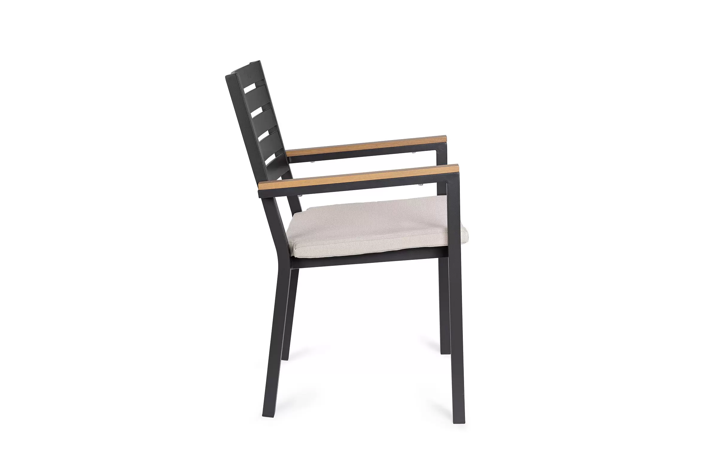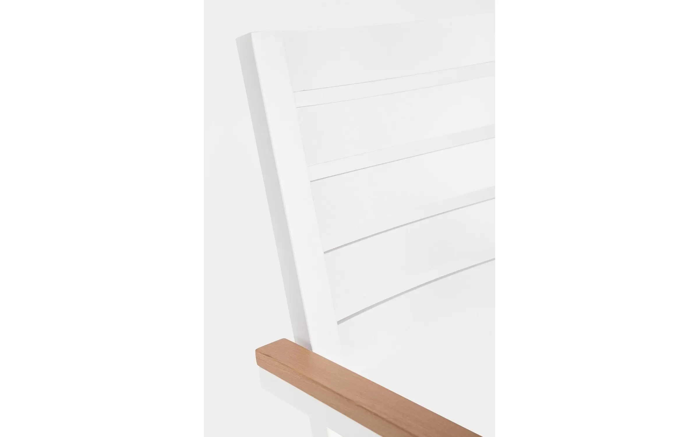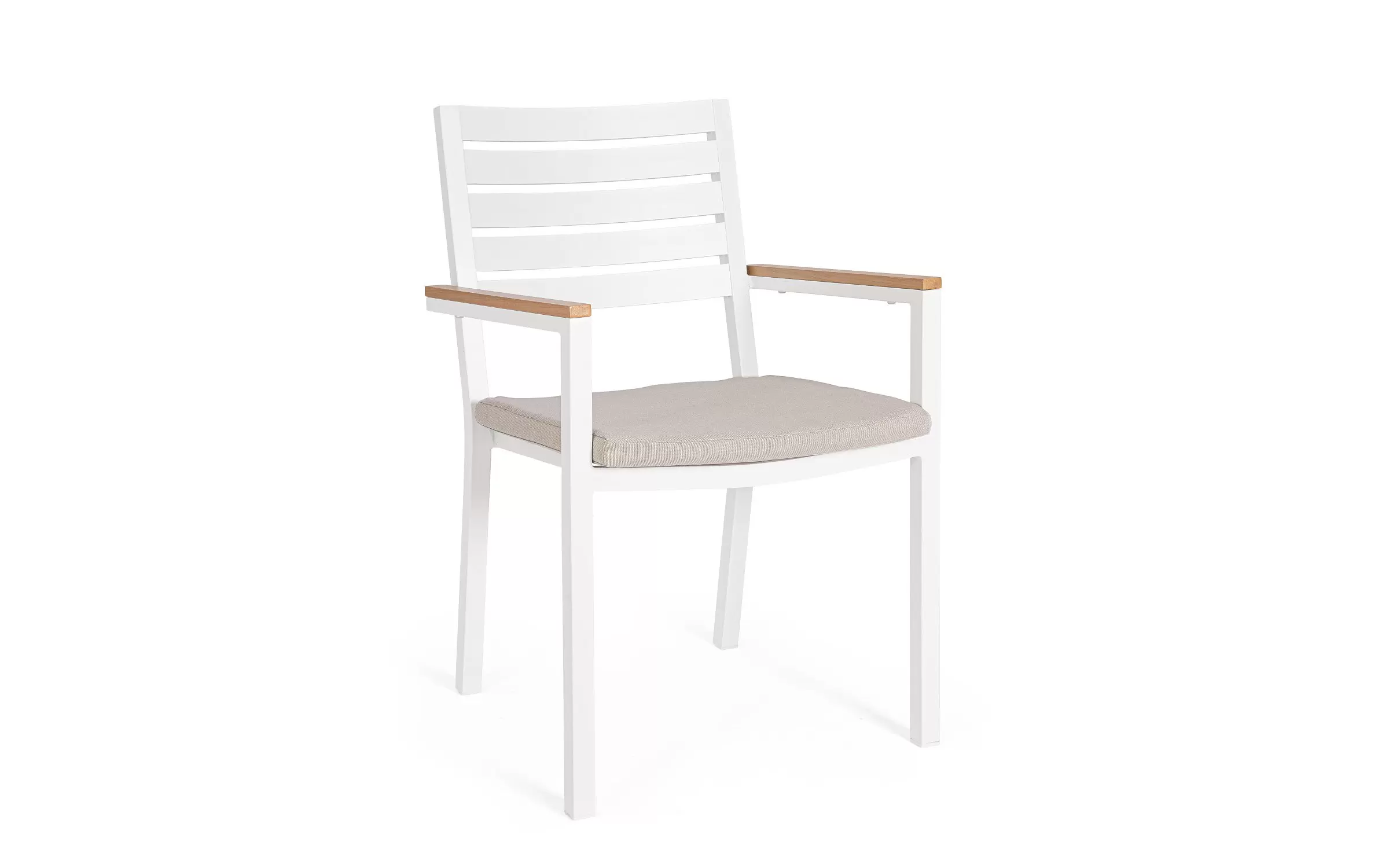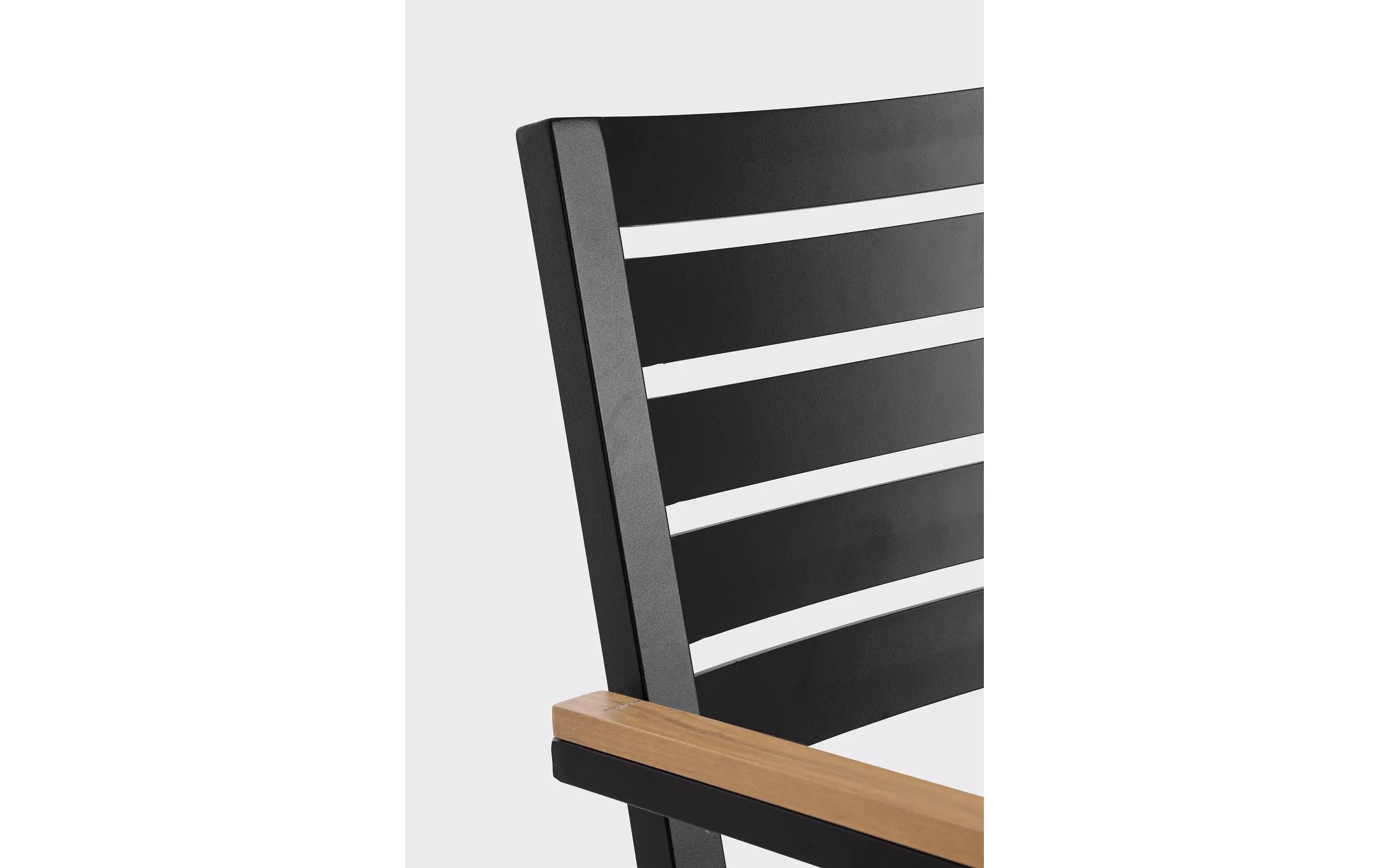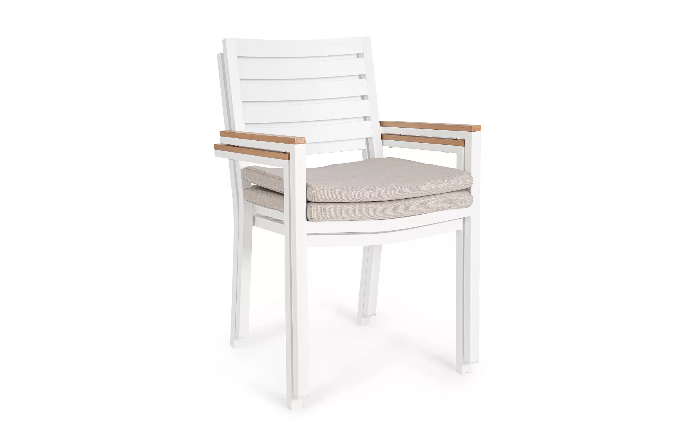 Aluminiowe niskie krzesło ogrodowe z poduszką z podłokietnikami pokrytymi powłoką imitującą drewno. Można układać w stos w celu łatwiejszego przechowywania.