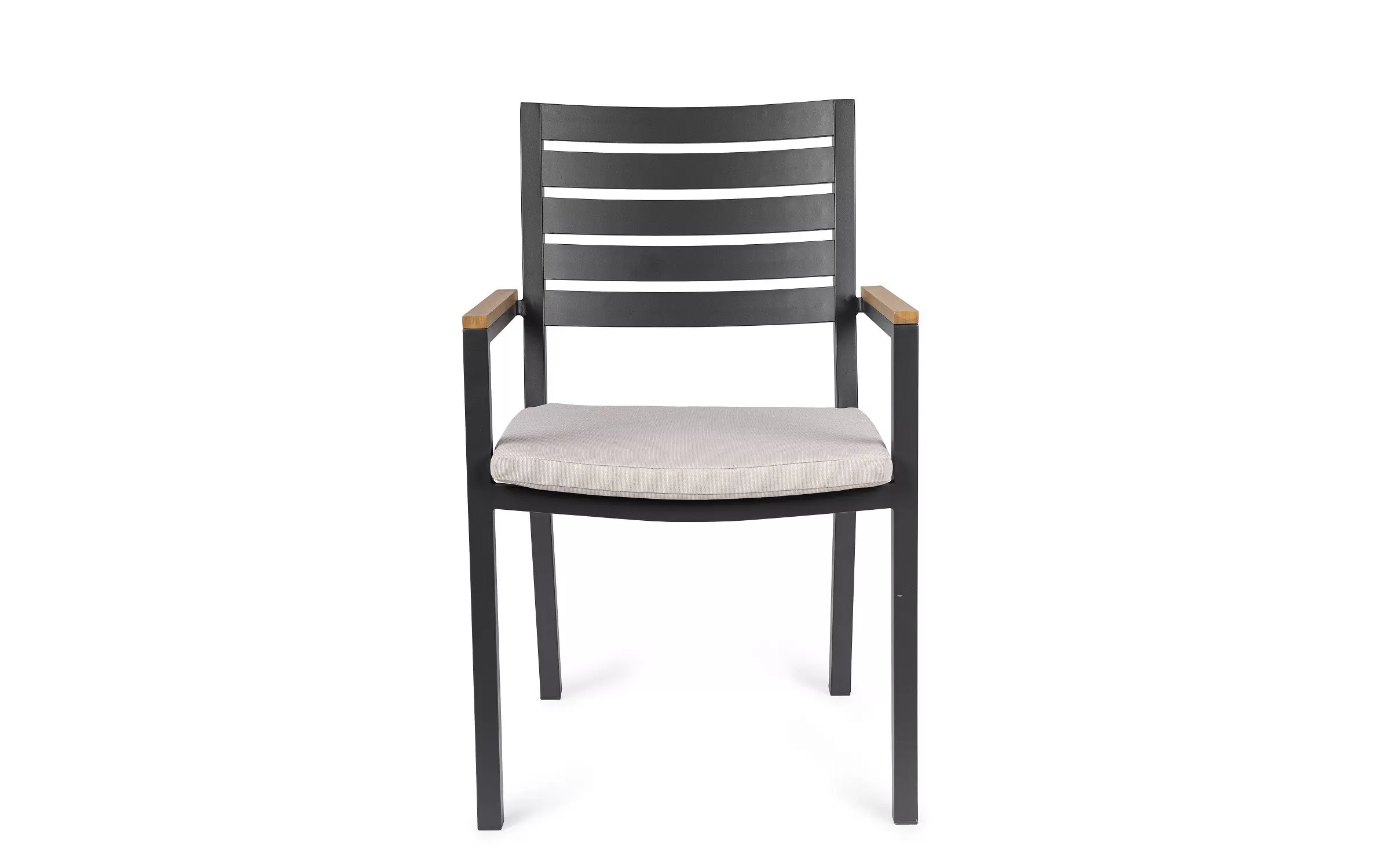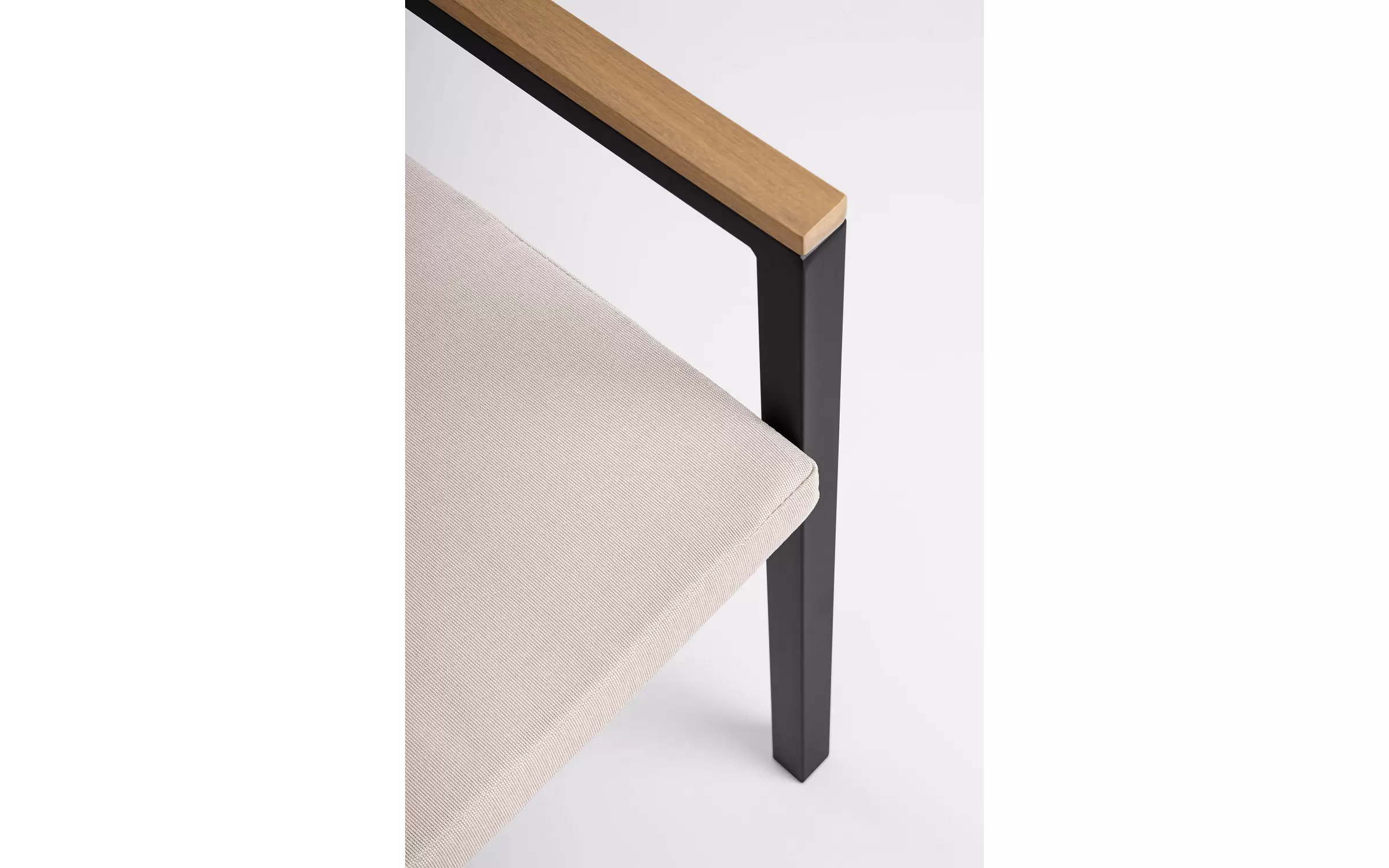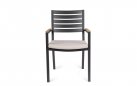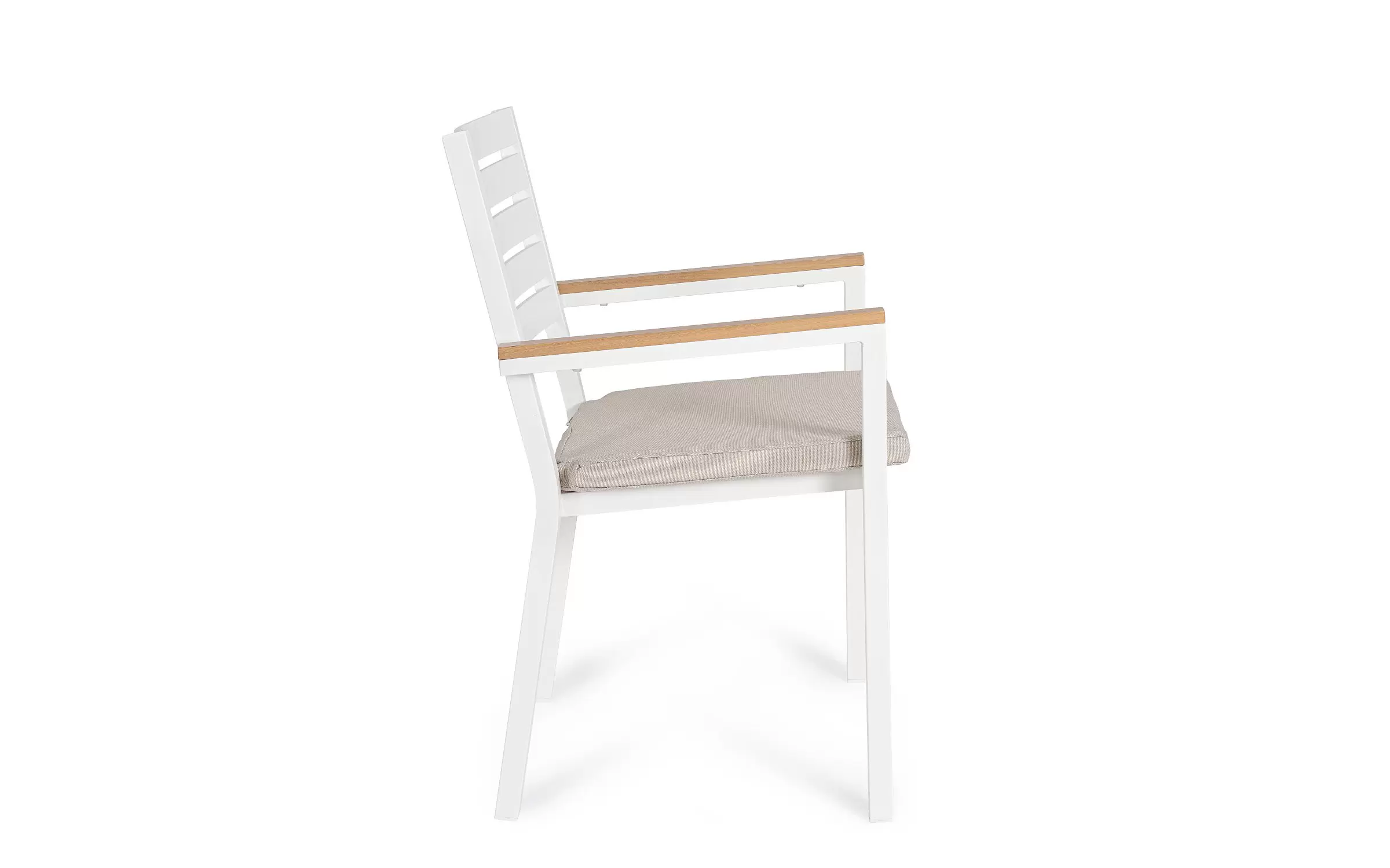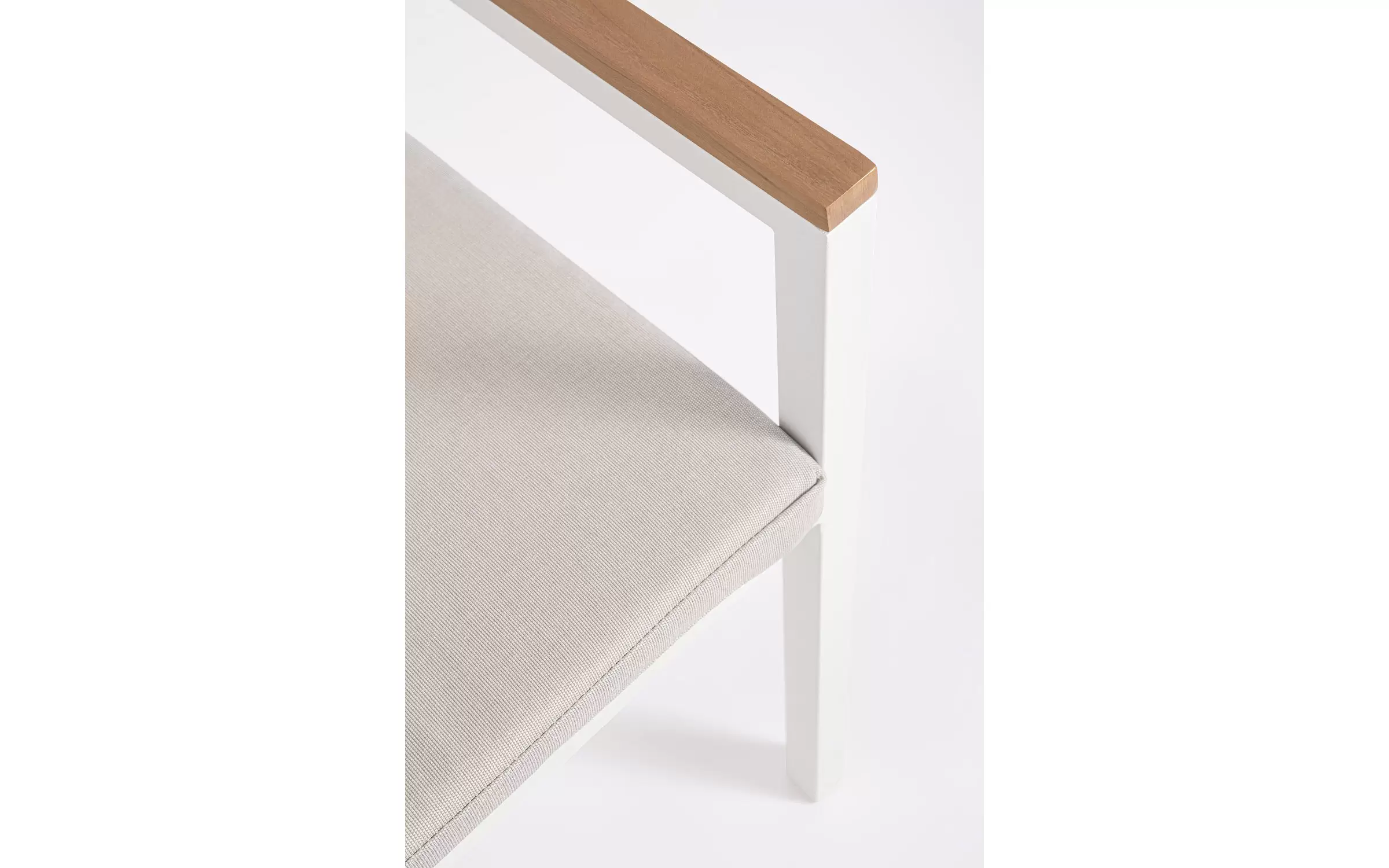 Aluminiowe niskie krzesło ogrodowe z poduszką z podłokietnikami pokrytymi powłoką imitującą drewno. Można układać w stos w celu łatwiejszego przechowywania.