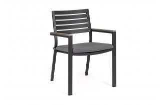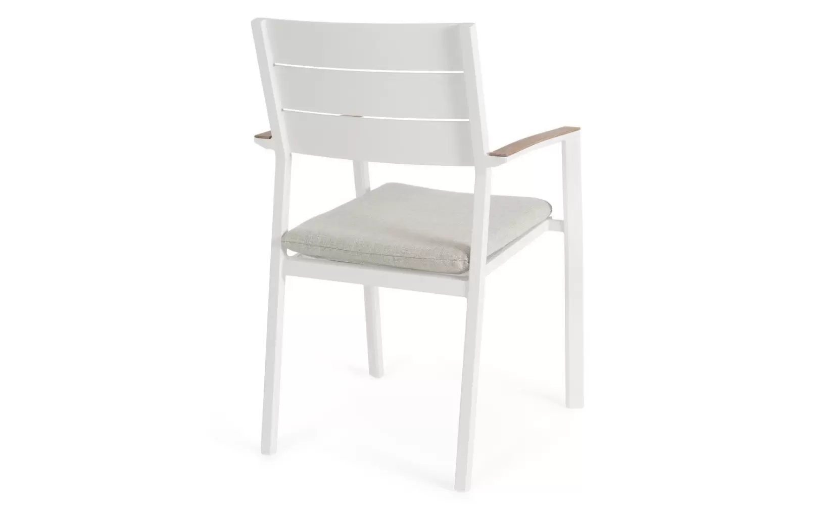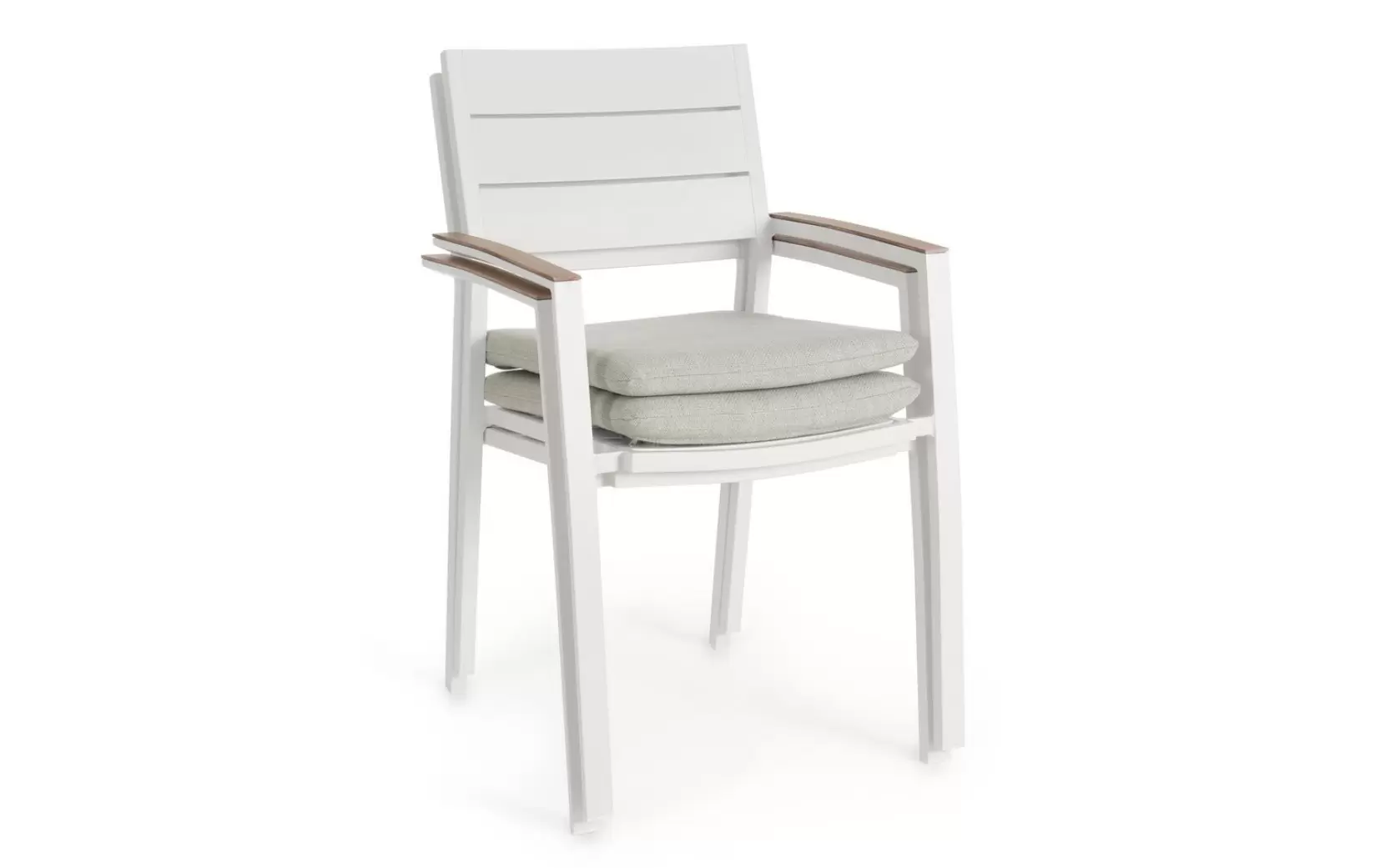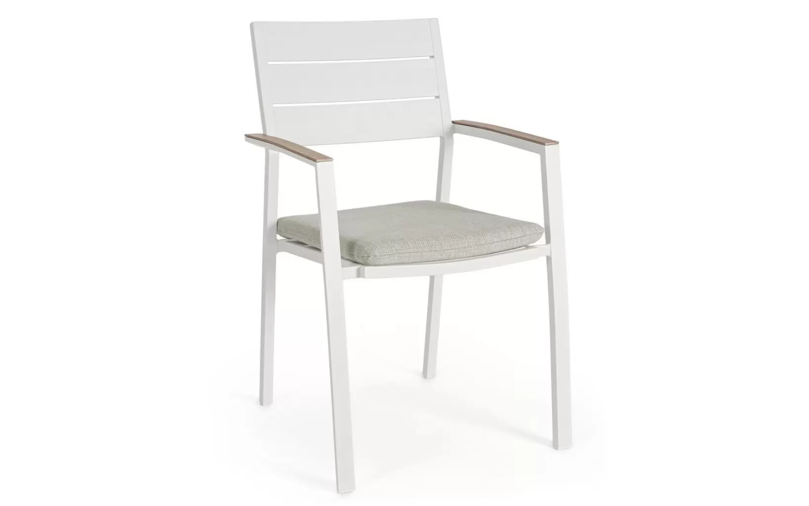 Aluminiowe krzesło ogrodowe z poduszką z podłokietnikami pokrytymi powłoką imitującą drewno. Można układać w stos w celu łatwiejszego przechowywania.