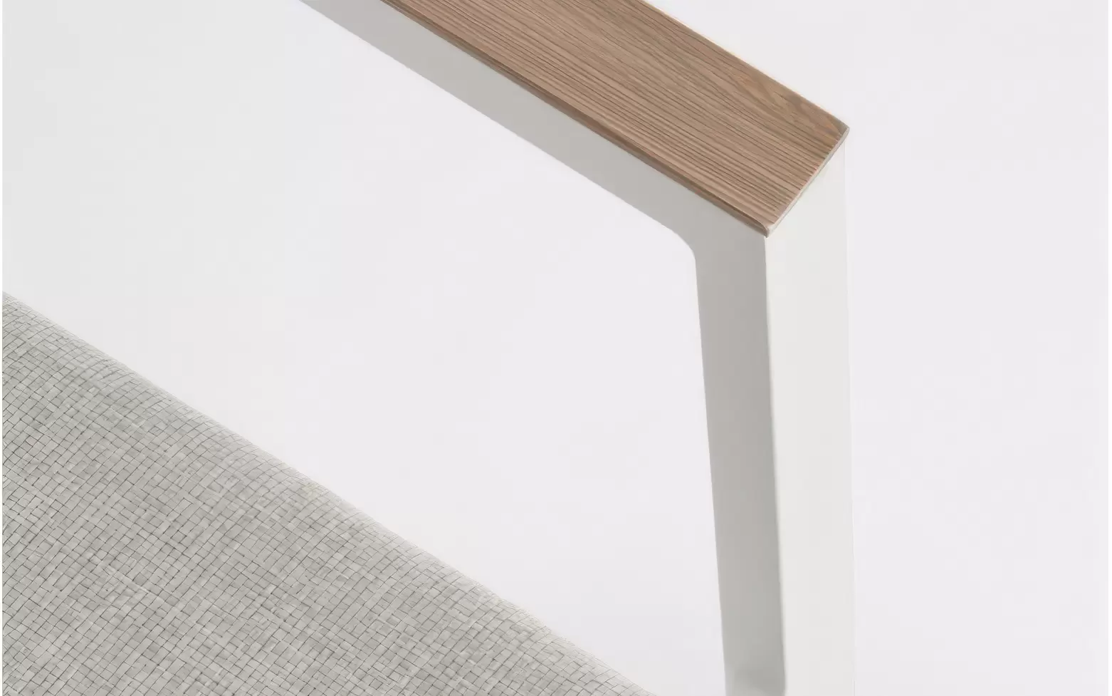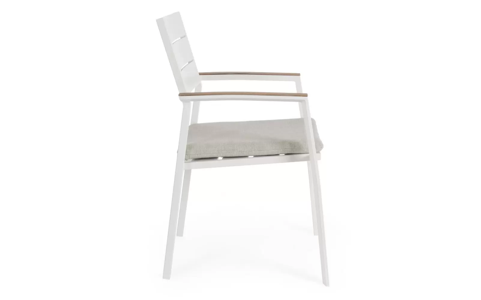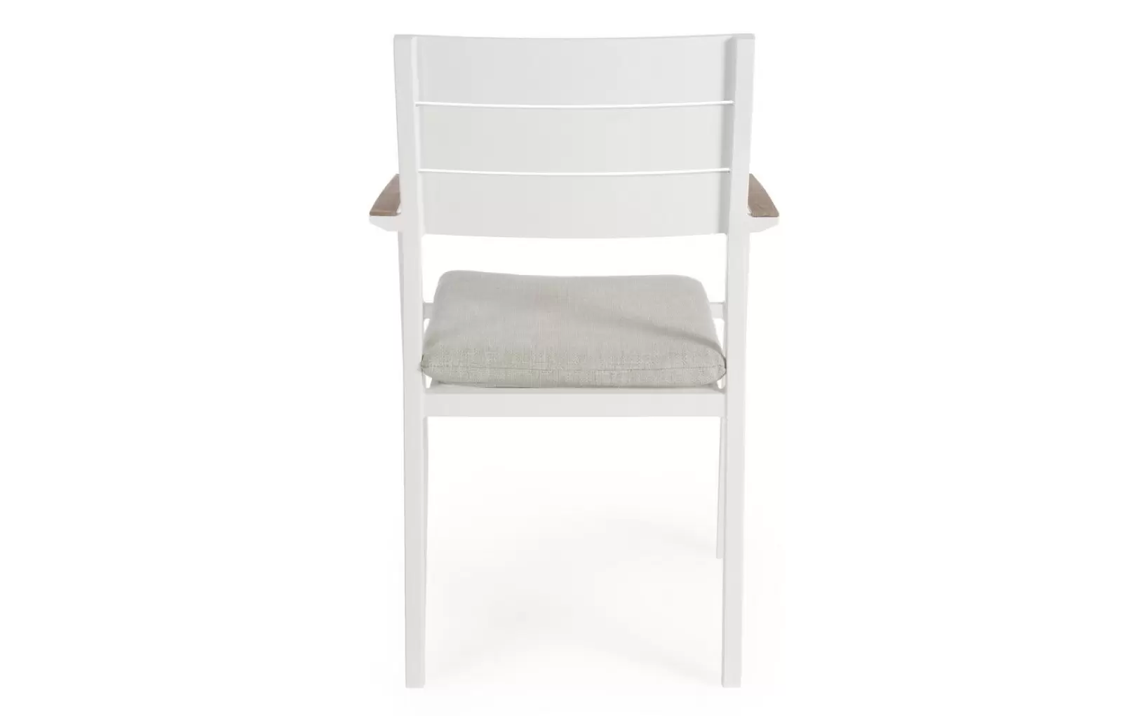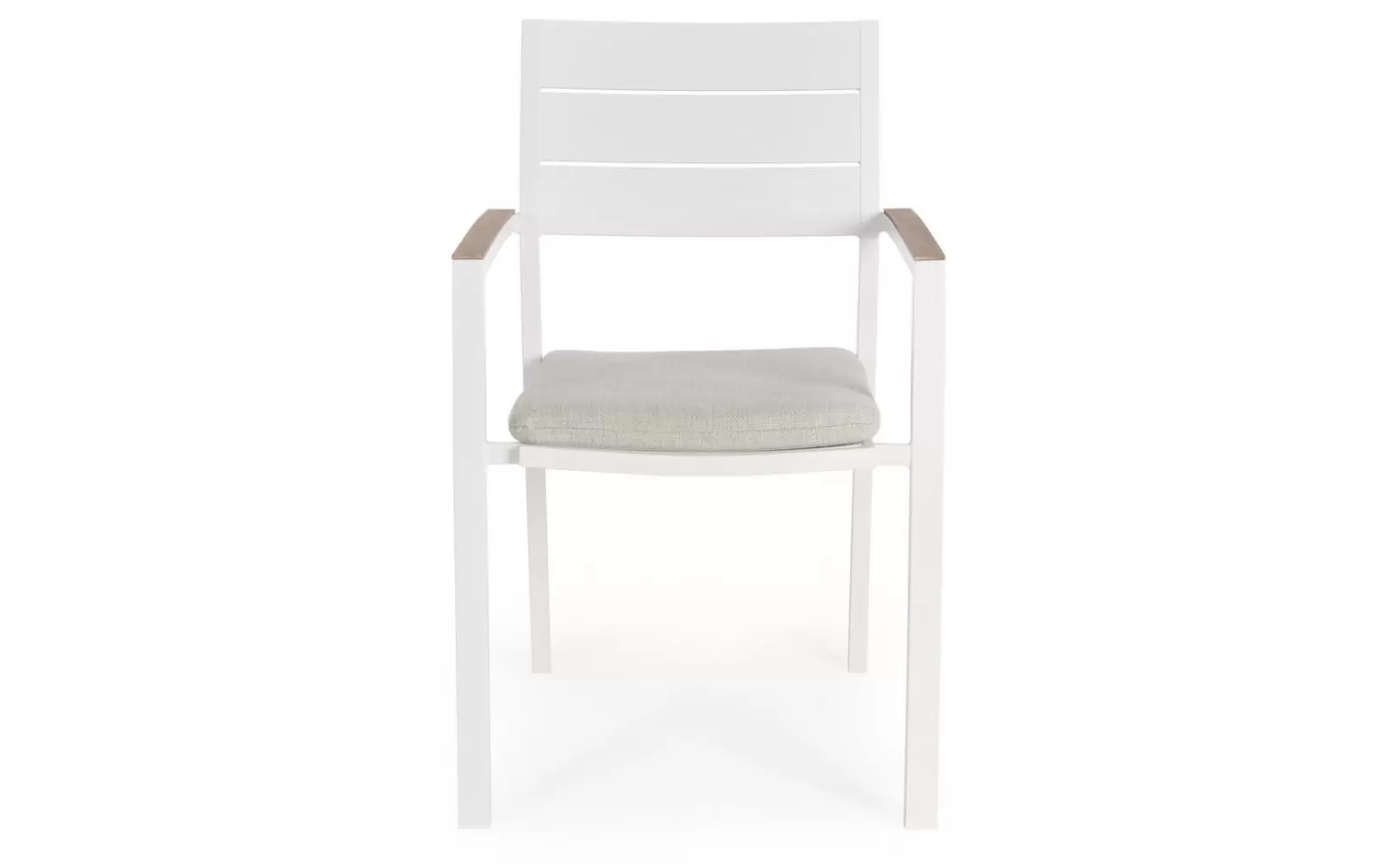 Aluminiowe krzesło ogrodowe z poduszką z podłokietnikami pokrytymi powłoką imitującą drewno. Można układać w stos w celu łatwiejszego przechowywania.