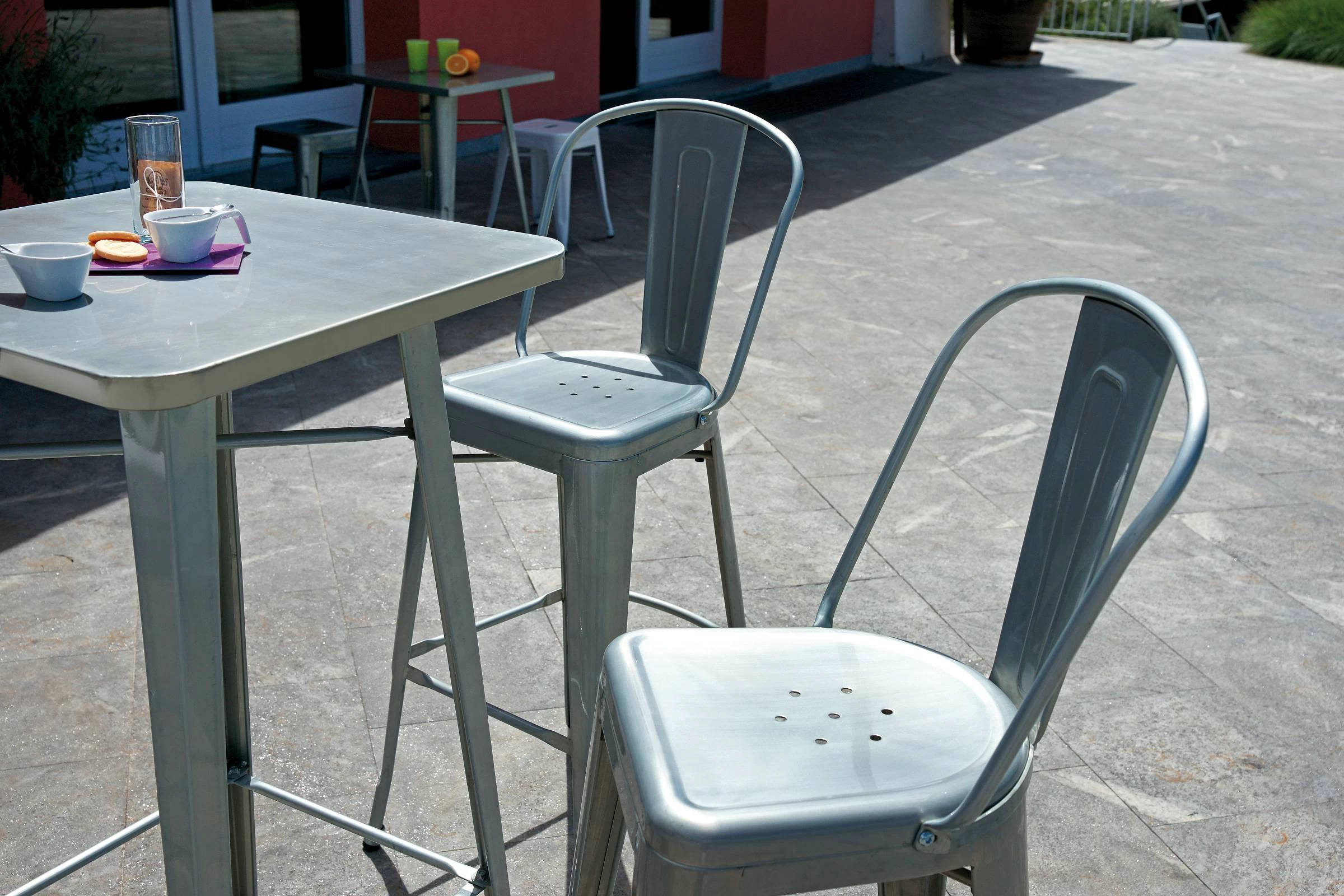 Metalowy hoker z oparciem w stylu loft wykonane z blachy ocynkowanej zapewniając odporność na rdzę podczas użytkowania na zewnątrz.