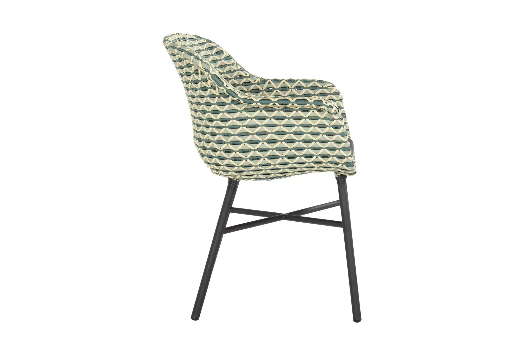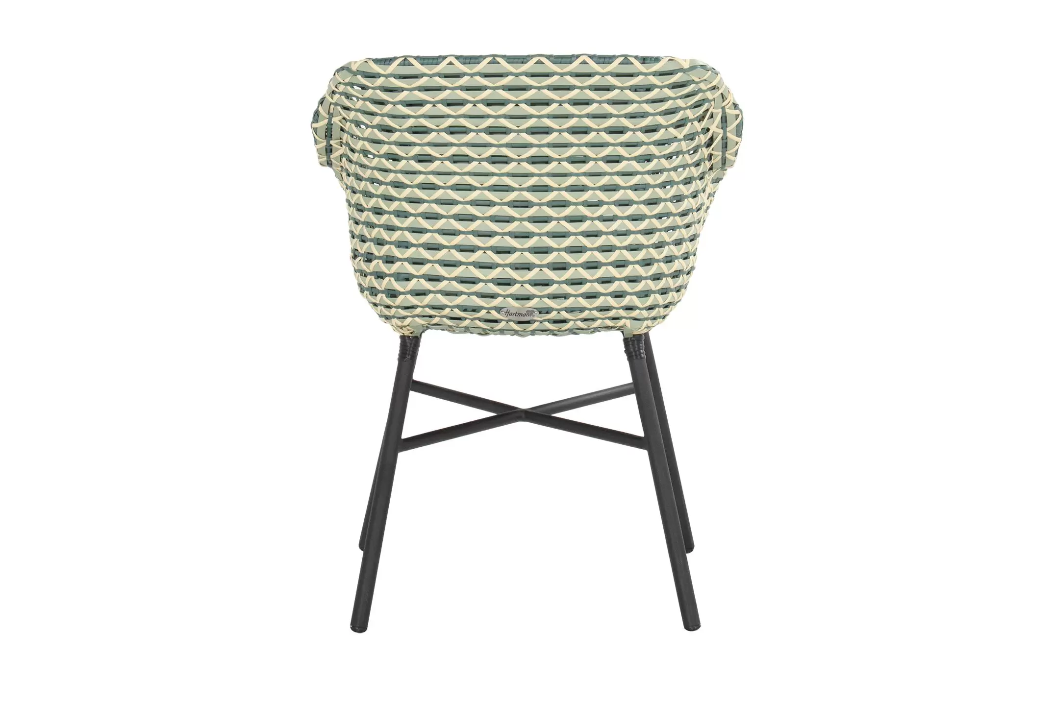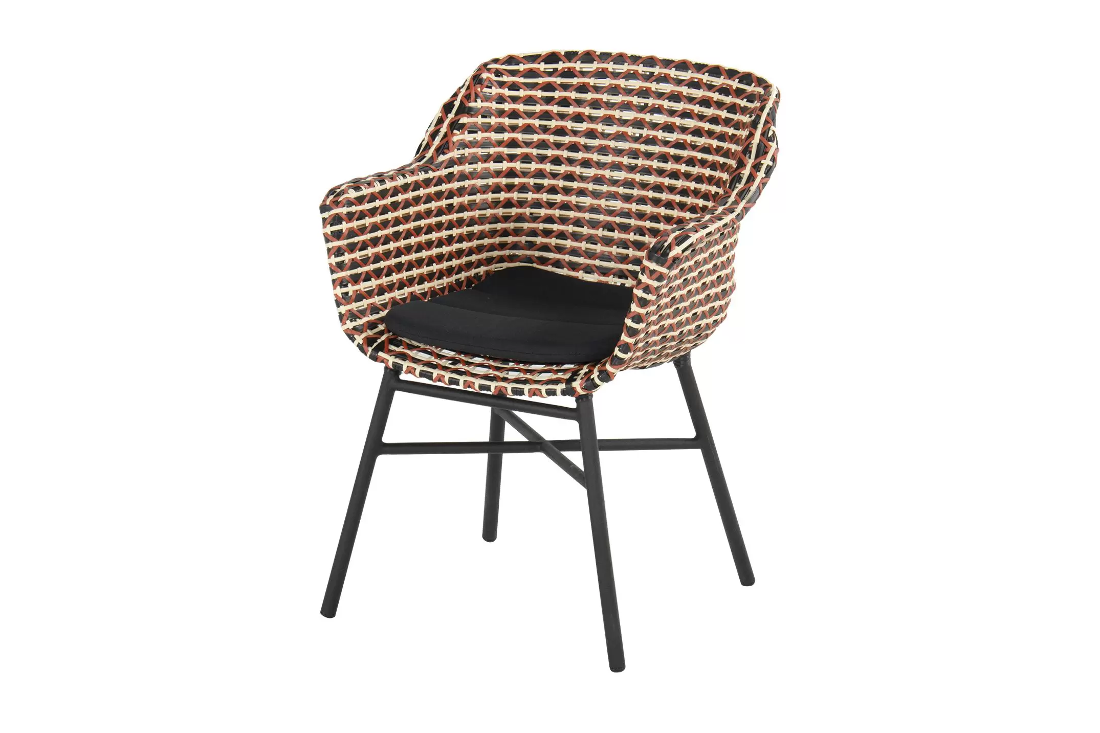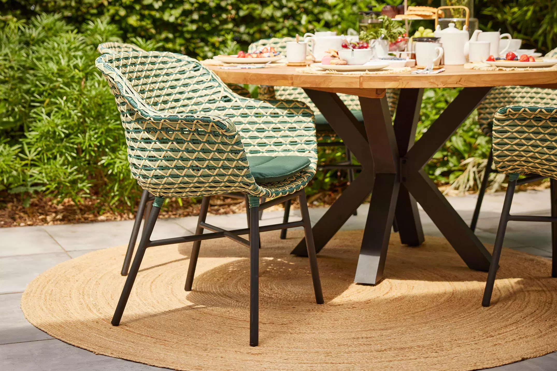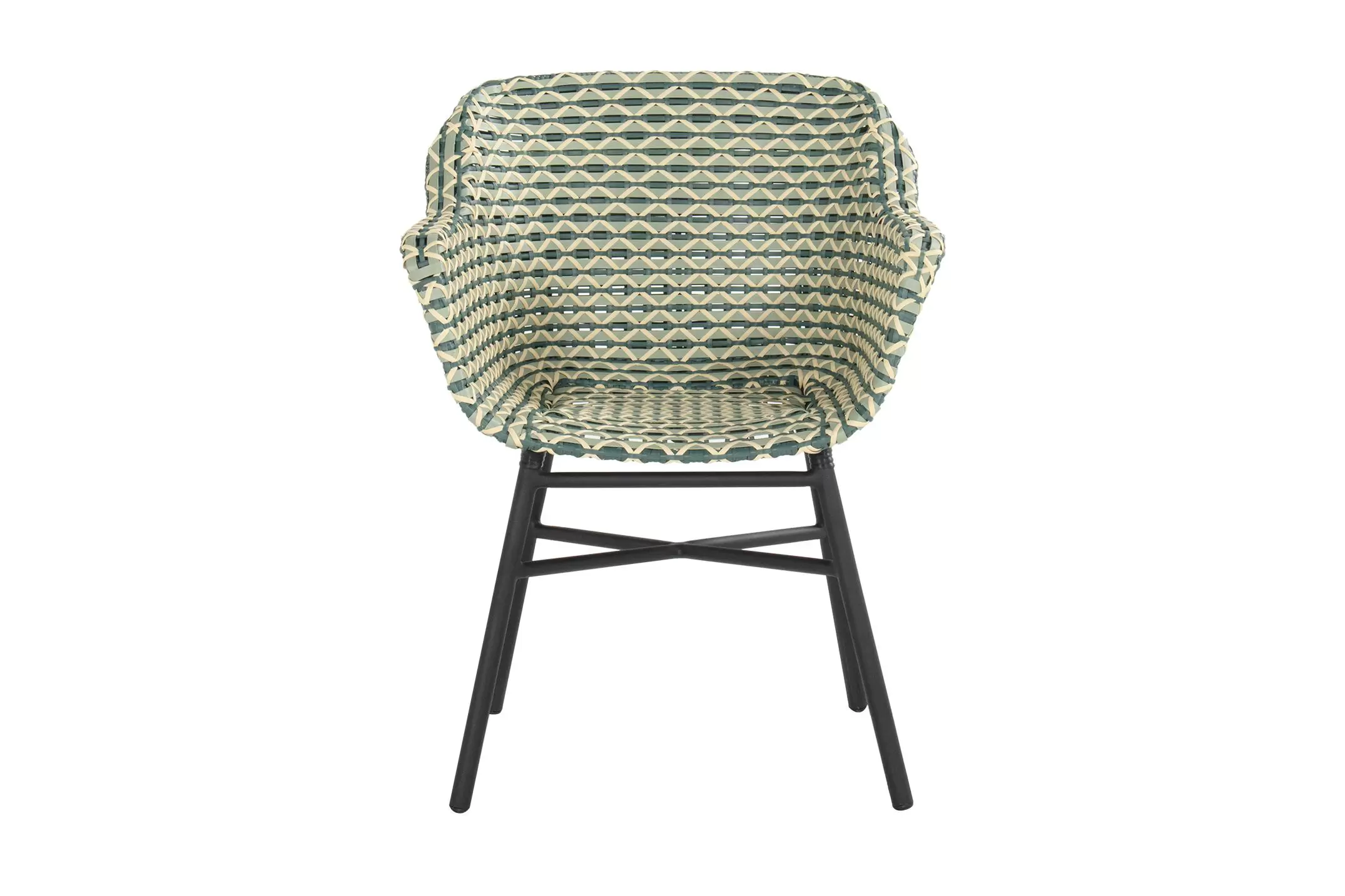 Krzesło ogrodowe Delphine przyciąga wzrok w ogrodzie. Starannie tkana trójkolorowy technorattan nadaje temu krzesłu luksusowy wygląd. Sprężysta plecionka technorattanowa krzesła i podłokietników jest wygodna do siedzienia.