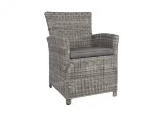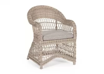 Stylowe i piękne w swoim klasycznym kształcie krzesło do ogrodowej jadalni. Mebel wykonany z technorattanu o okrągłym przekroju w kolorze beżu. Poduszki wodoodporne ze zdejmowanymi poszewkami z materiału Olefin.