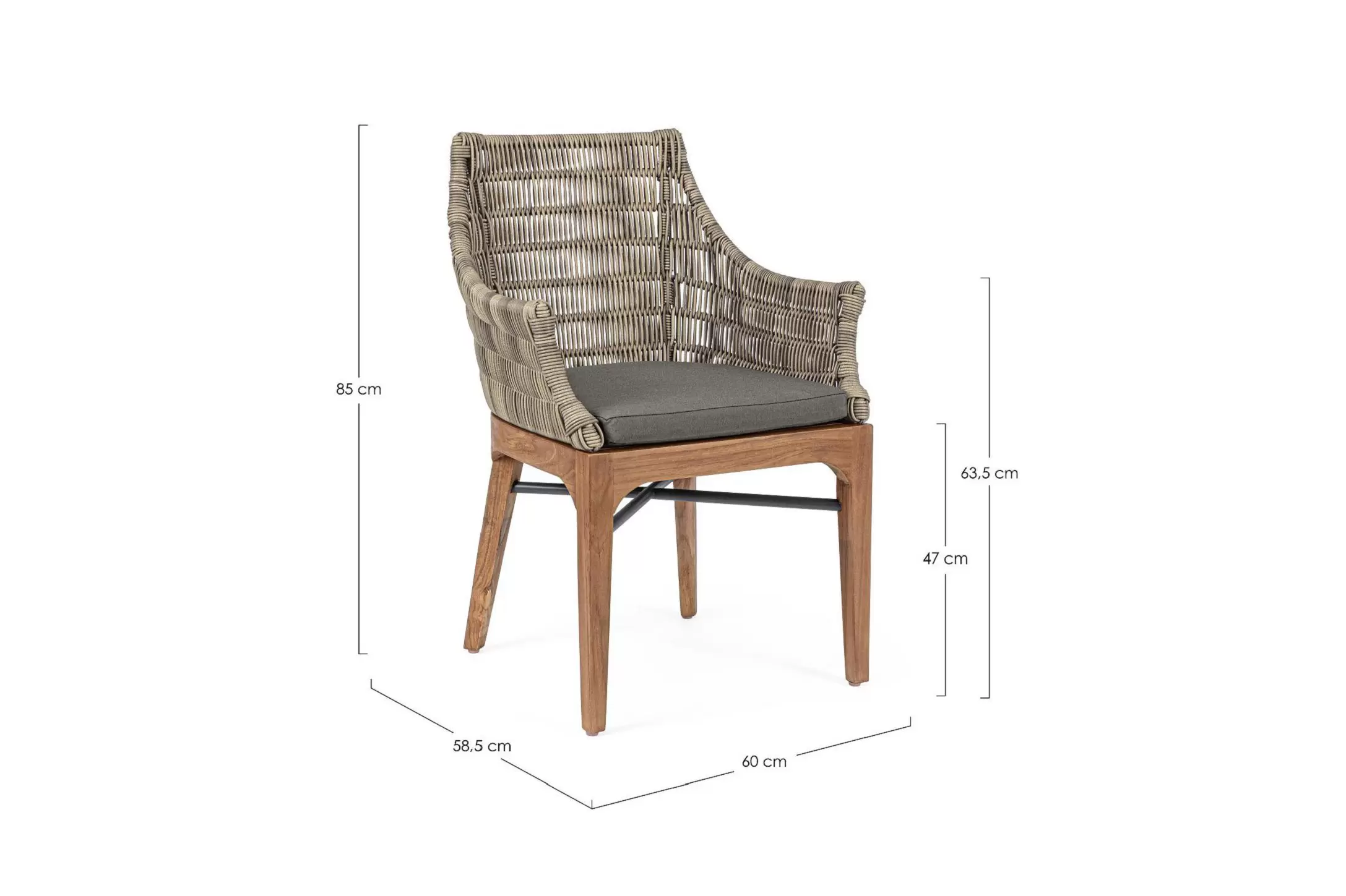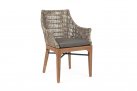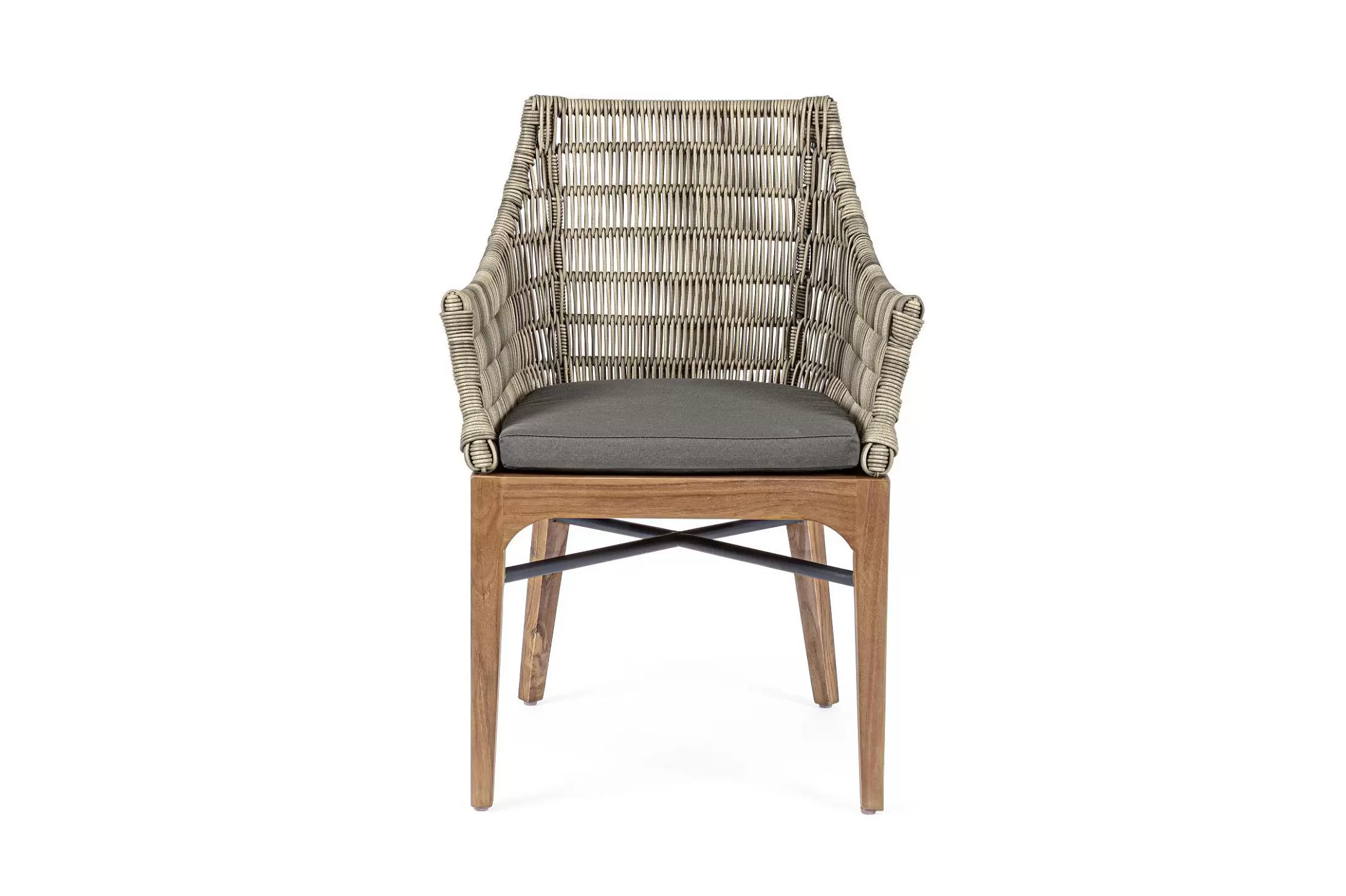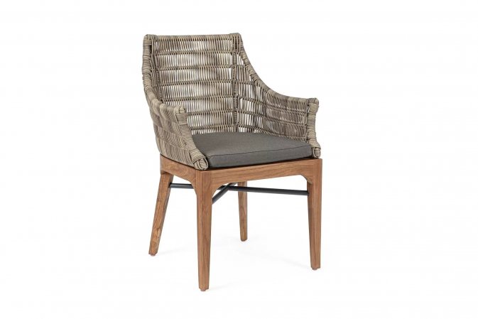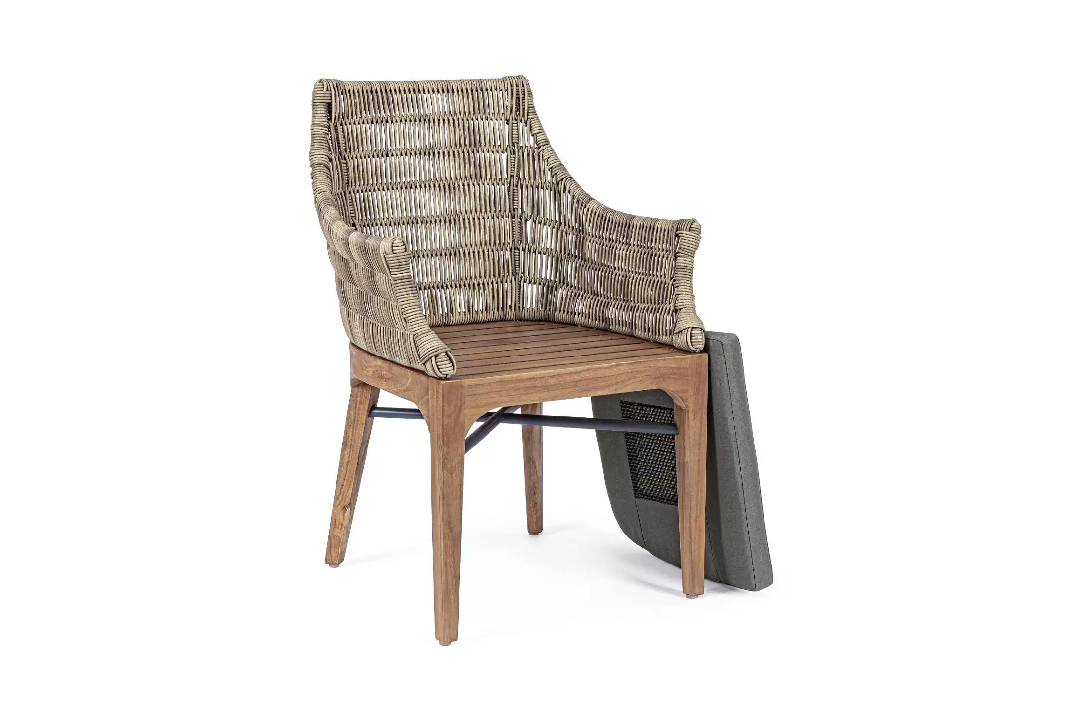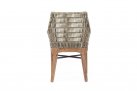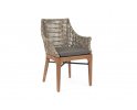 Krzesło do ogrodowej jadalni nowoczesne z wodoodpornymi poduszkami o teakowej podstawie i aluminiowej ramie siedzisk oplecionej technorattanem.