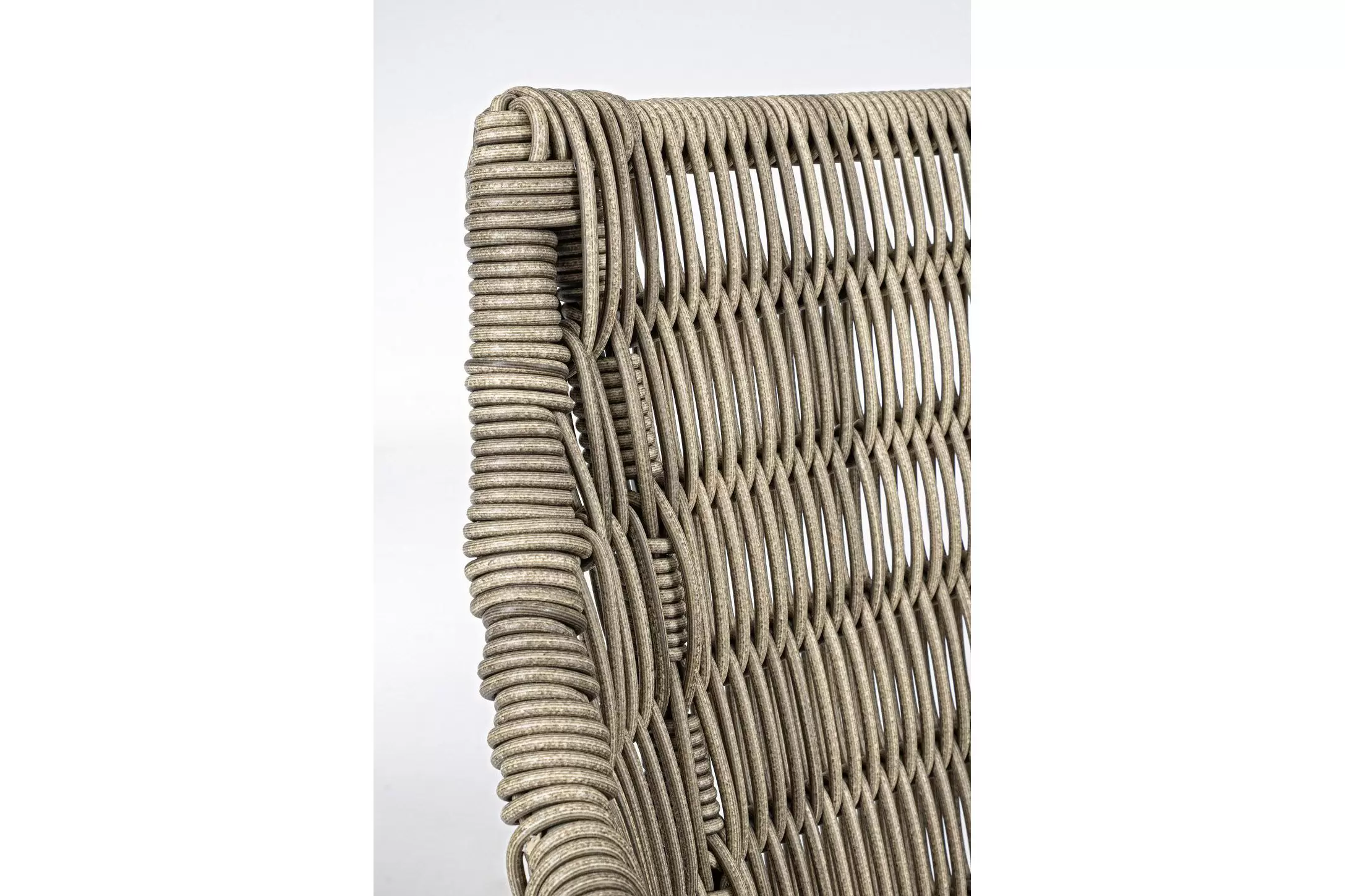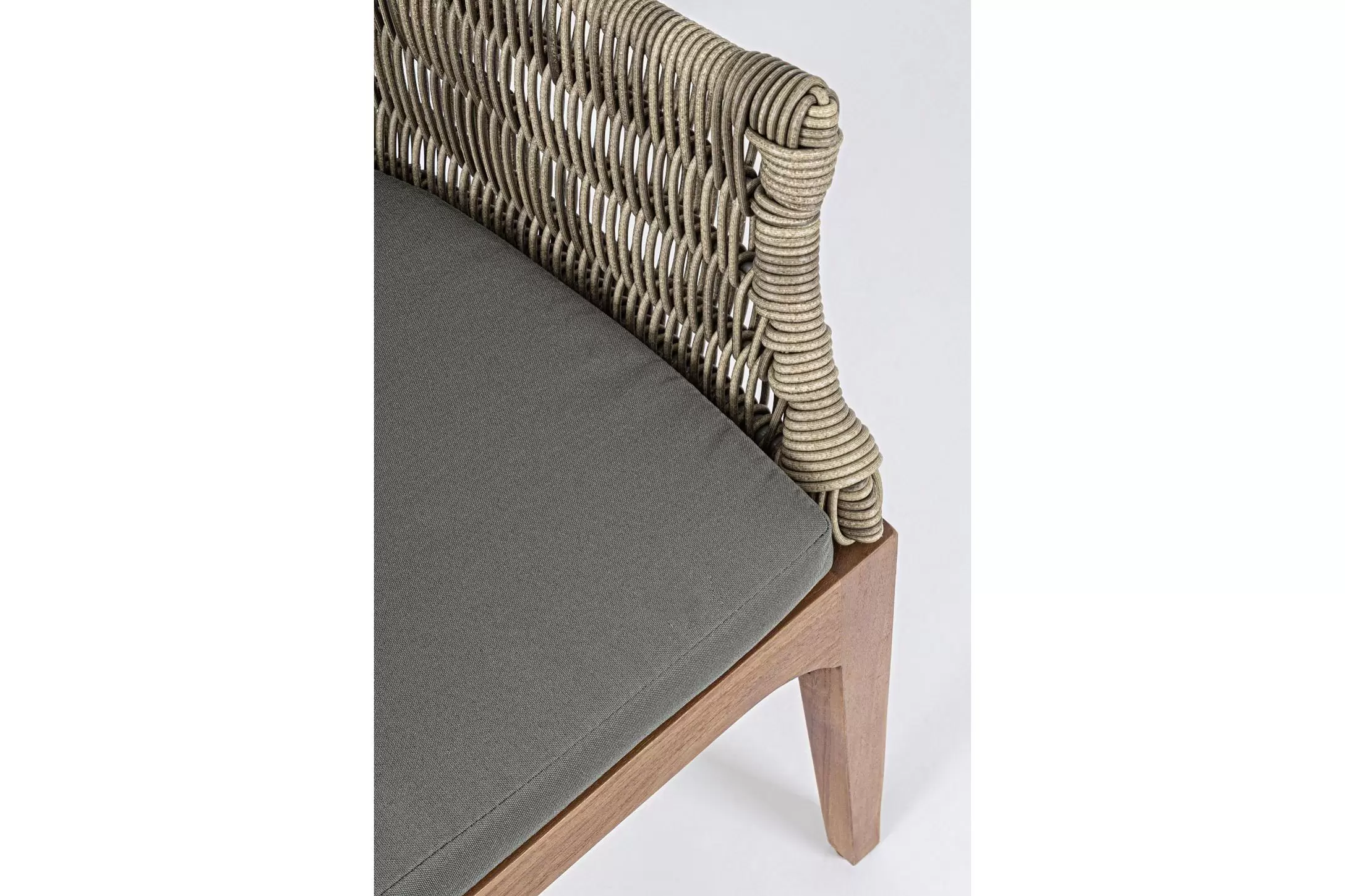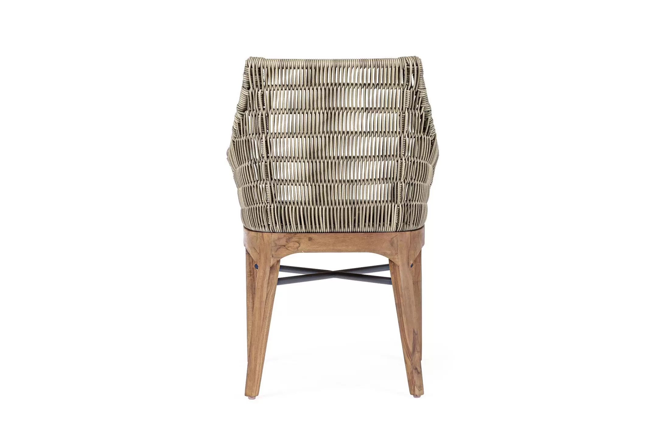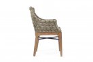 Krzesło do ogrodowej jadalni nowoczesne z wodoodpornymi poduszkami o teakowej podstawie i aluminiowej ramie siedzisk oplecionej technorattanem.