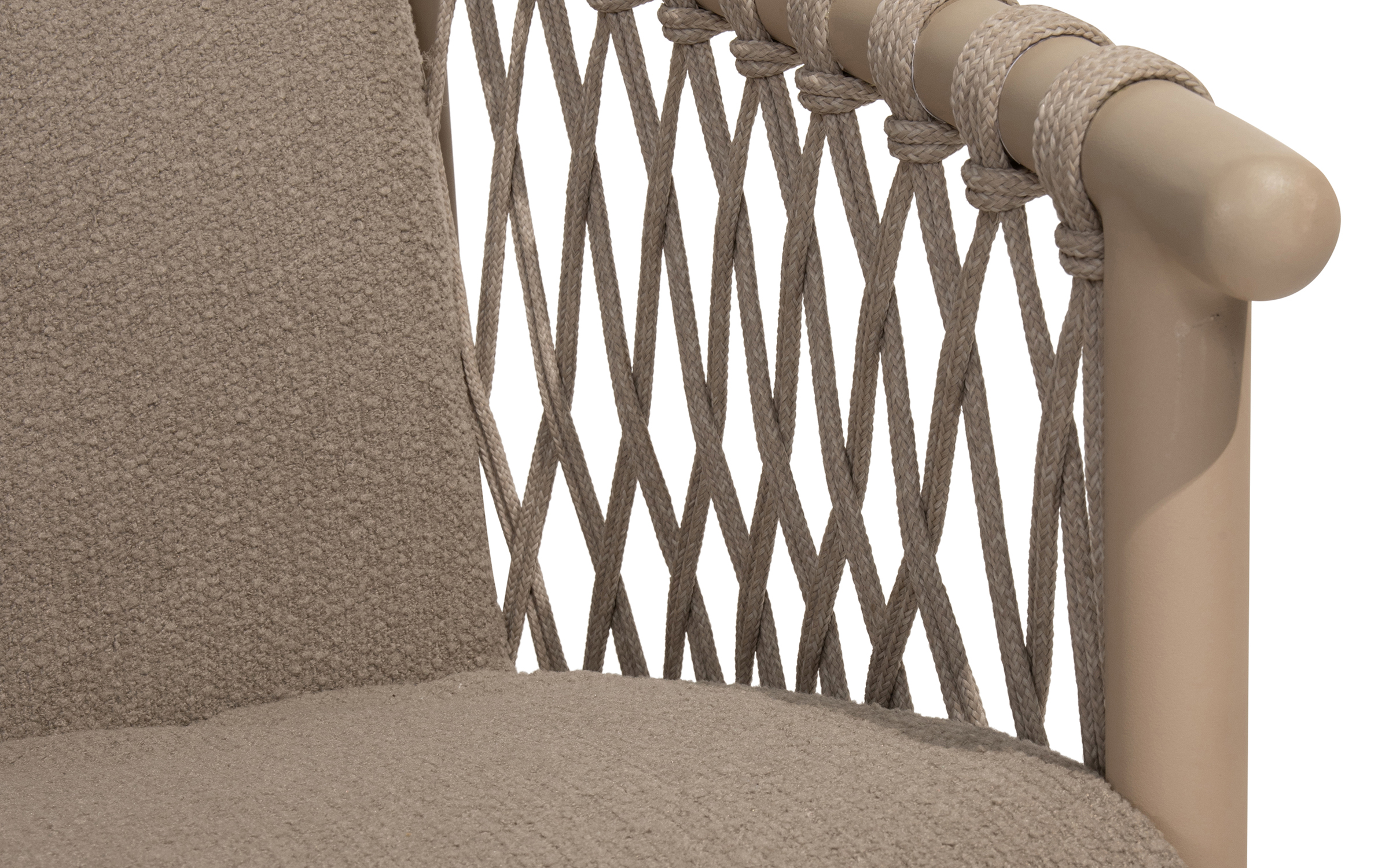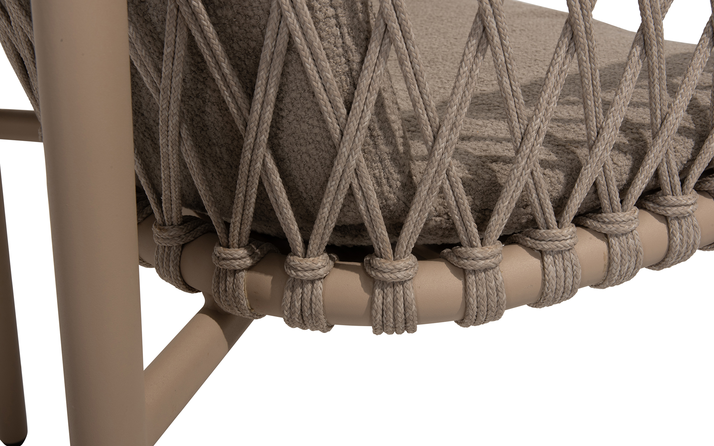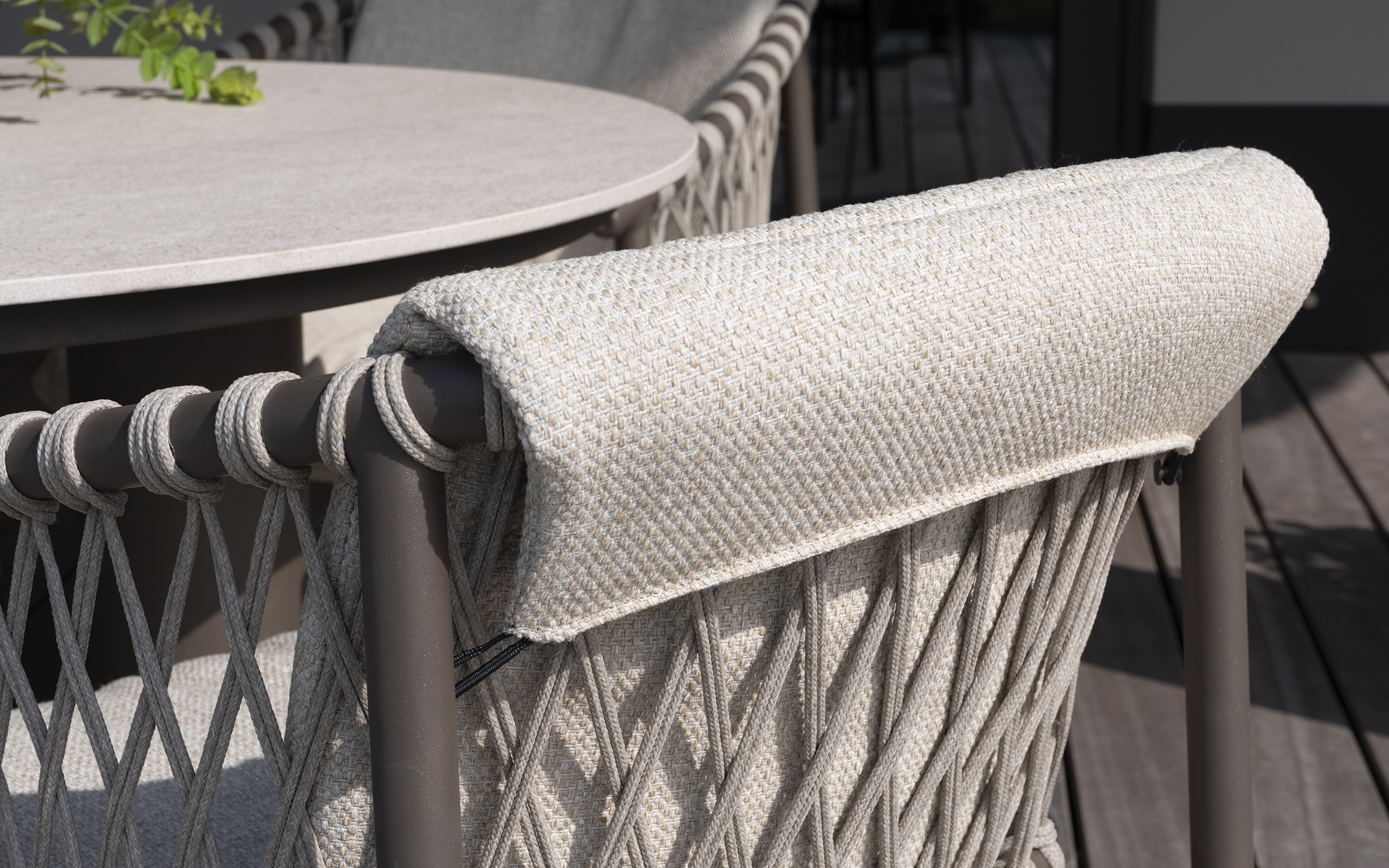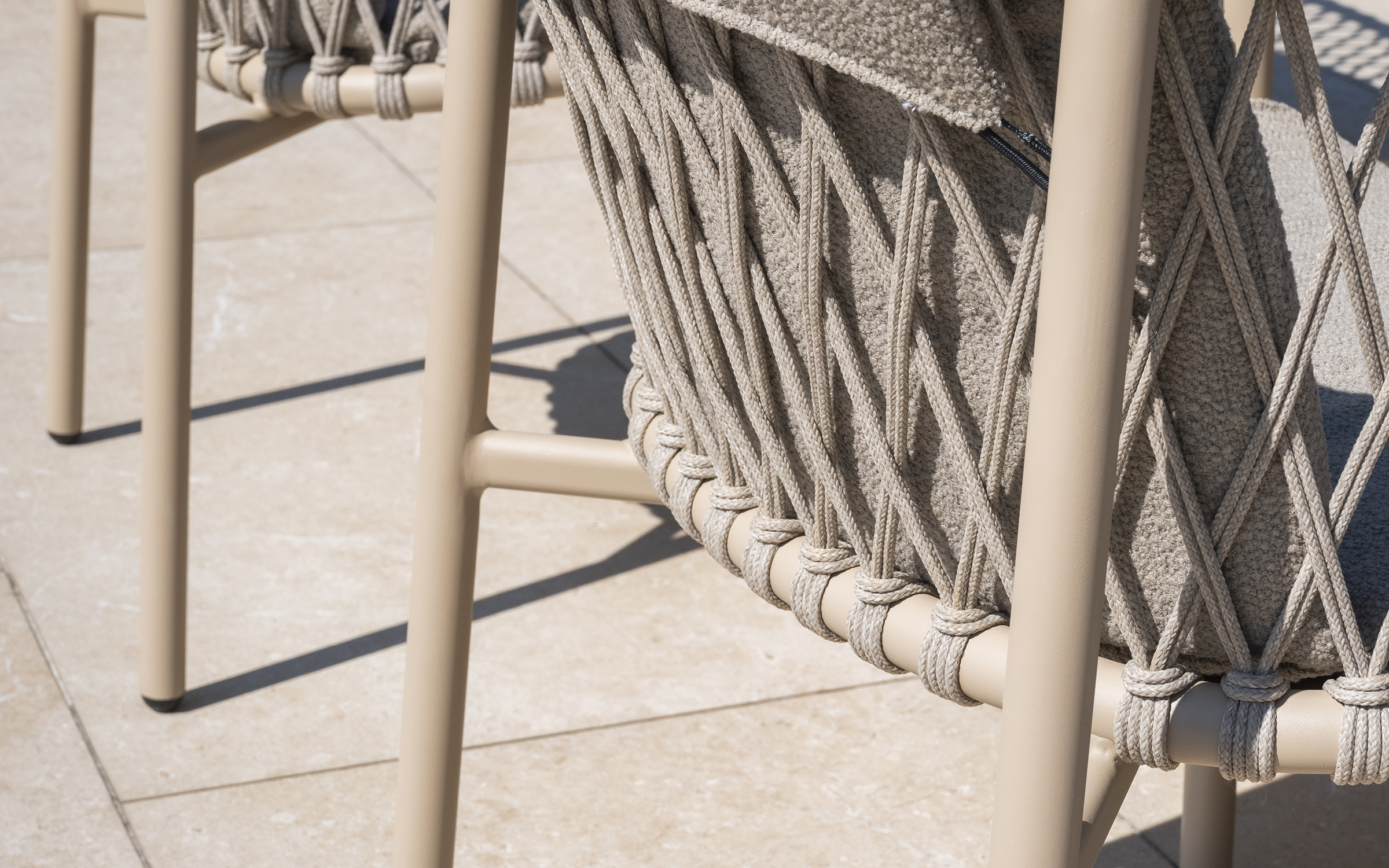 Konstrukcja aluminiowa i tkanina bouclé płynnie wtapiają się w Twój ogród, tworząc zachęcającą i nastrojową jadalnię.