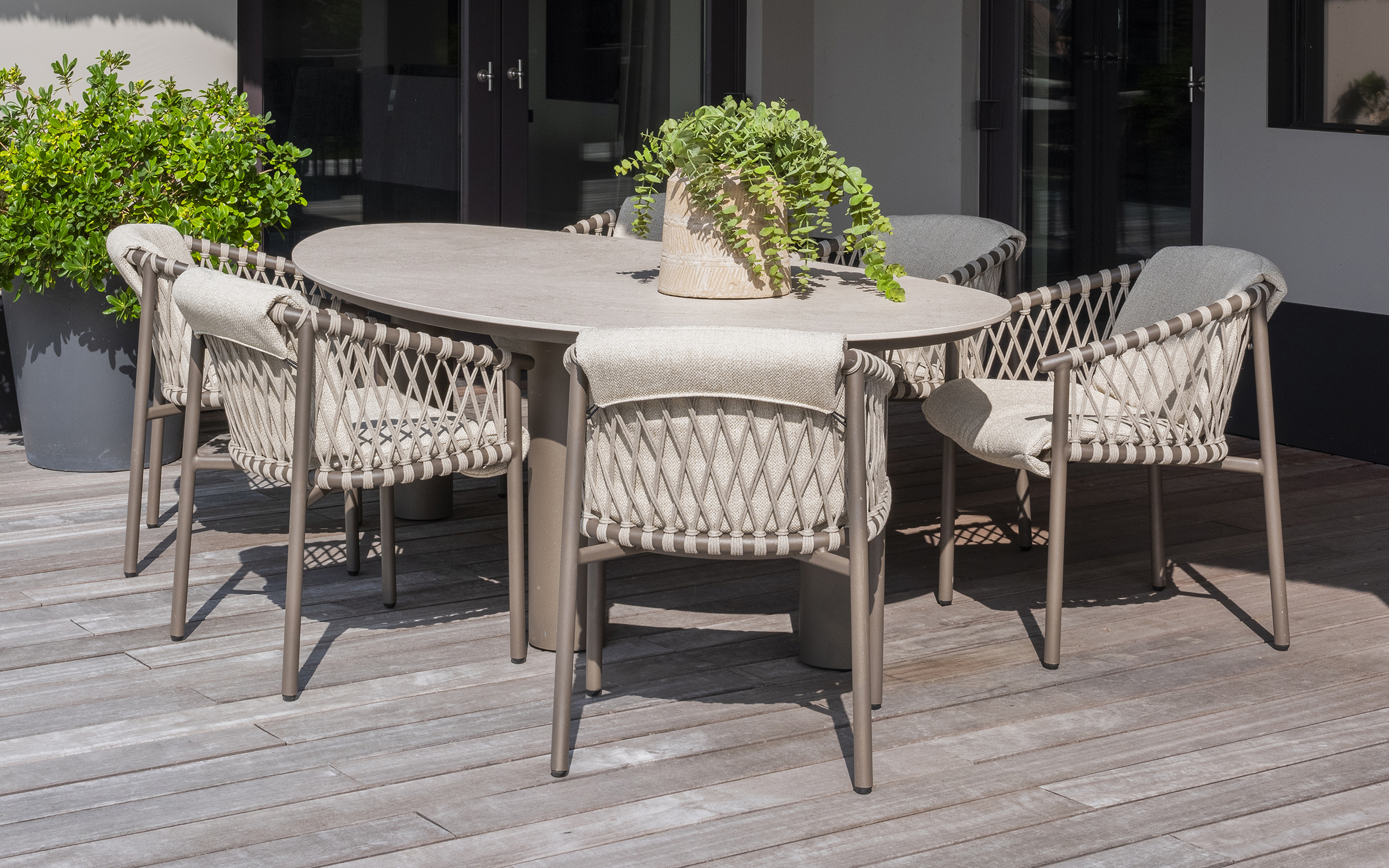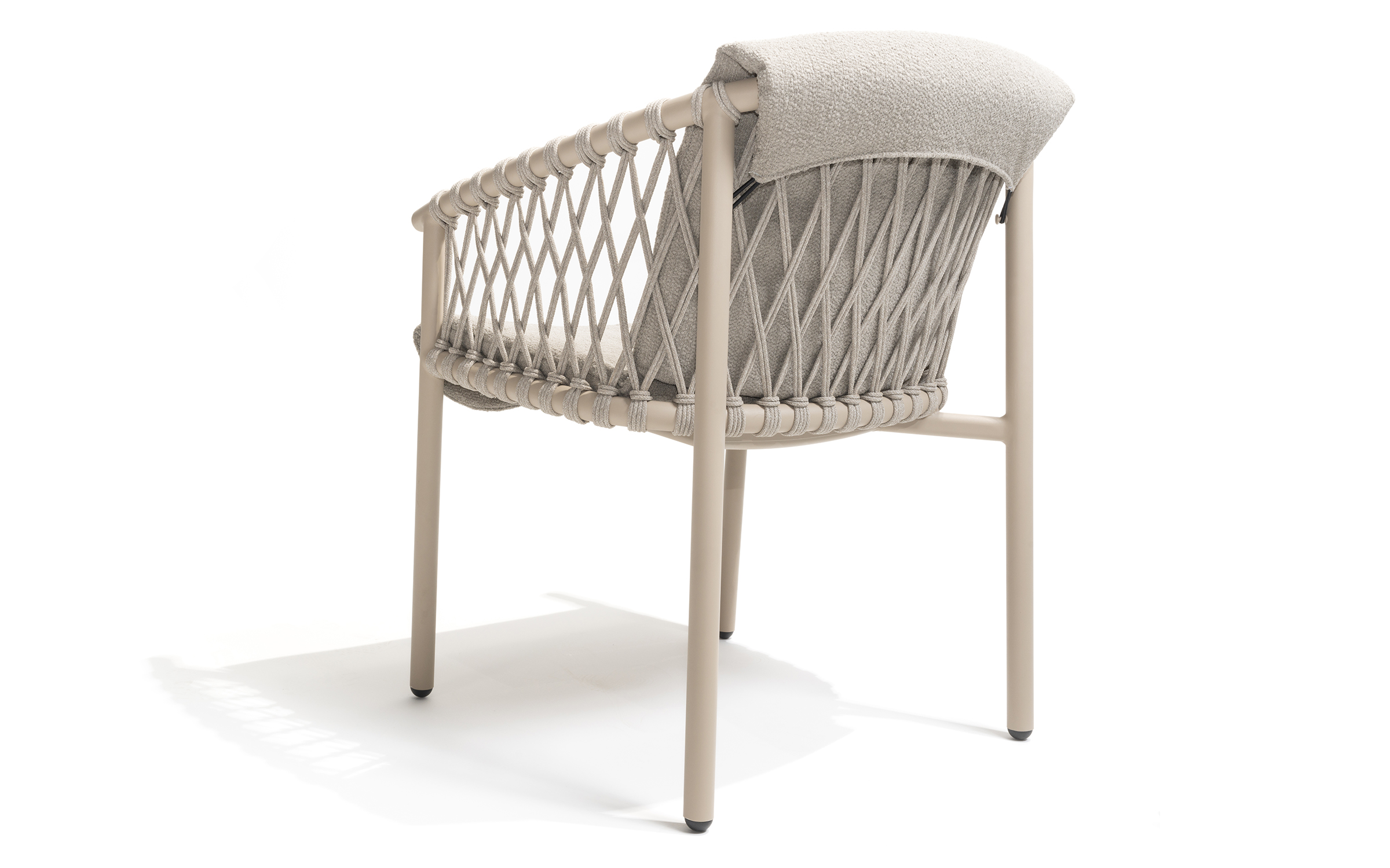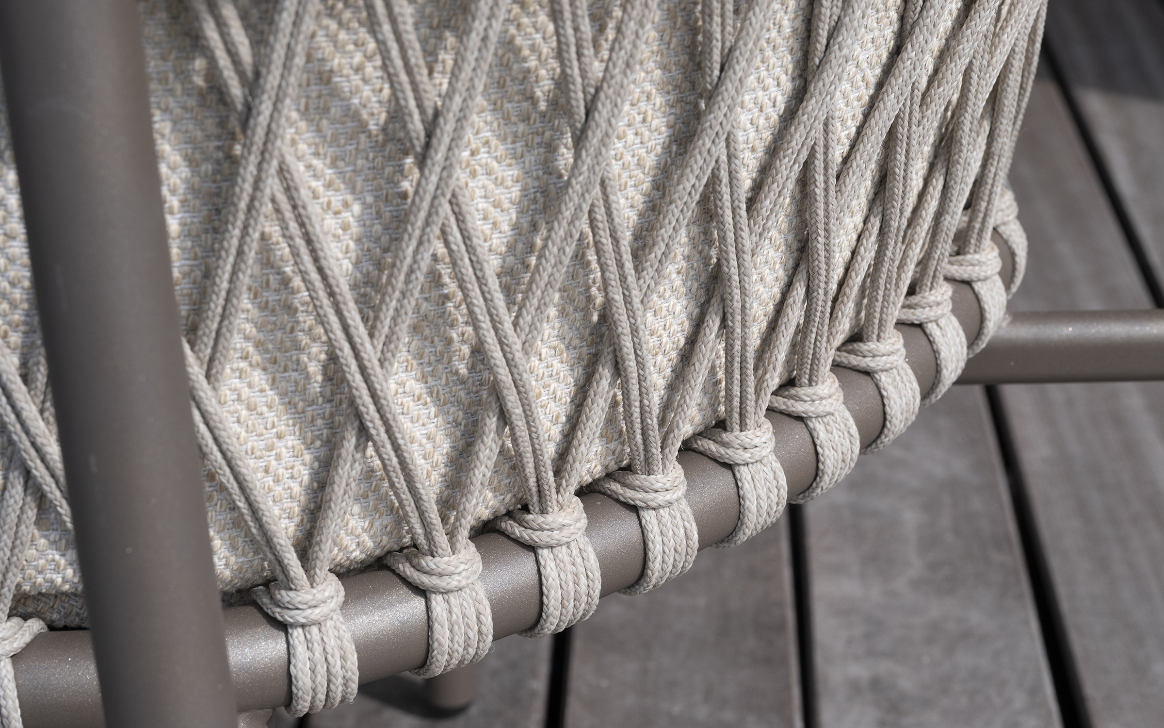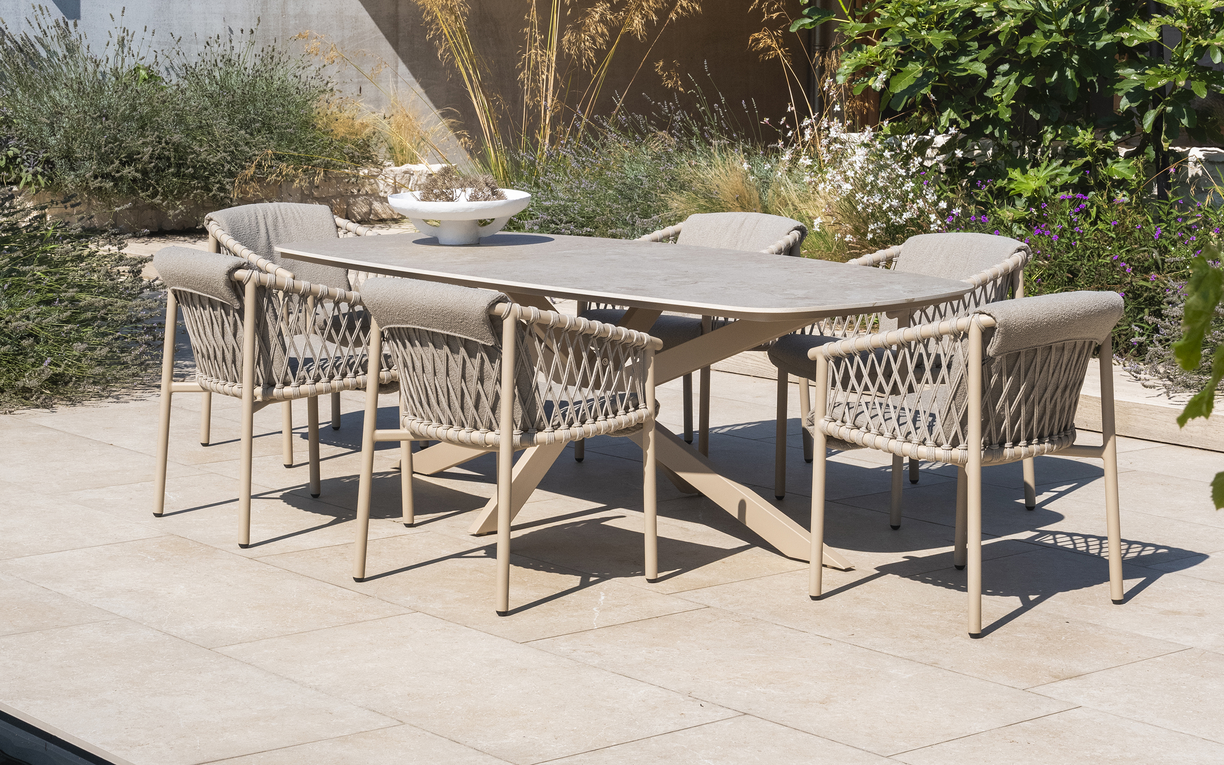 Konstrukcja aluminiowa i tkanina bouclé płynnie wtapiają się w Twój ogród, tworząc zachęcającą i nastrojową jadalnię.