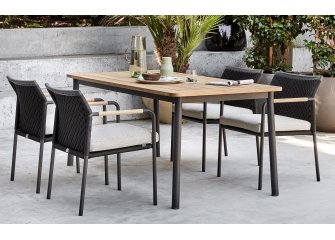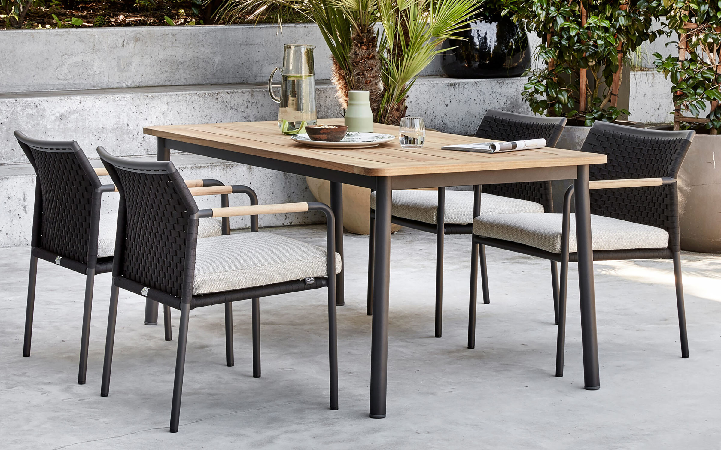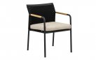 Fotel ELLE BELT to elegancki mebel ogrodowy zaprojektowany z myślą o zestawach stołowych. Rama z aluminium w kolorze czarnym została połączona z oparciem z plecionki Belt Rope oraz podłokietnikami z naturalnego drewna teakowego. Całość uzupełnia jasnobeżowa poduszka siedziskowa w technologii BEE WETT®, odporna na wilgoć i promieniowanie UV.