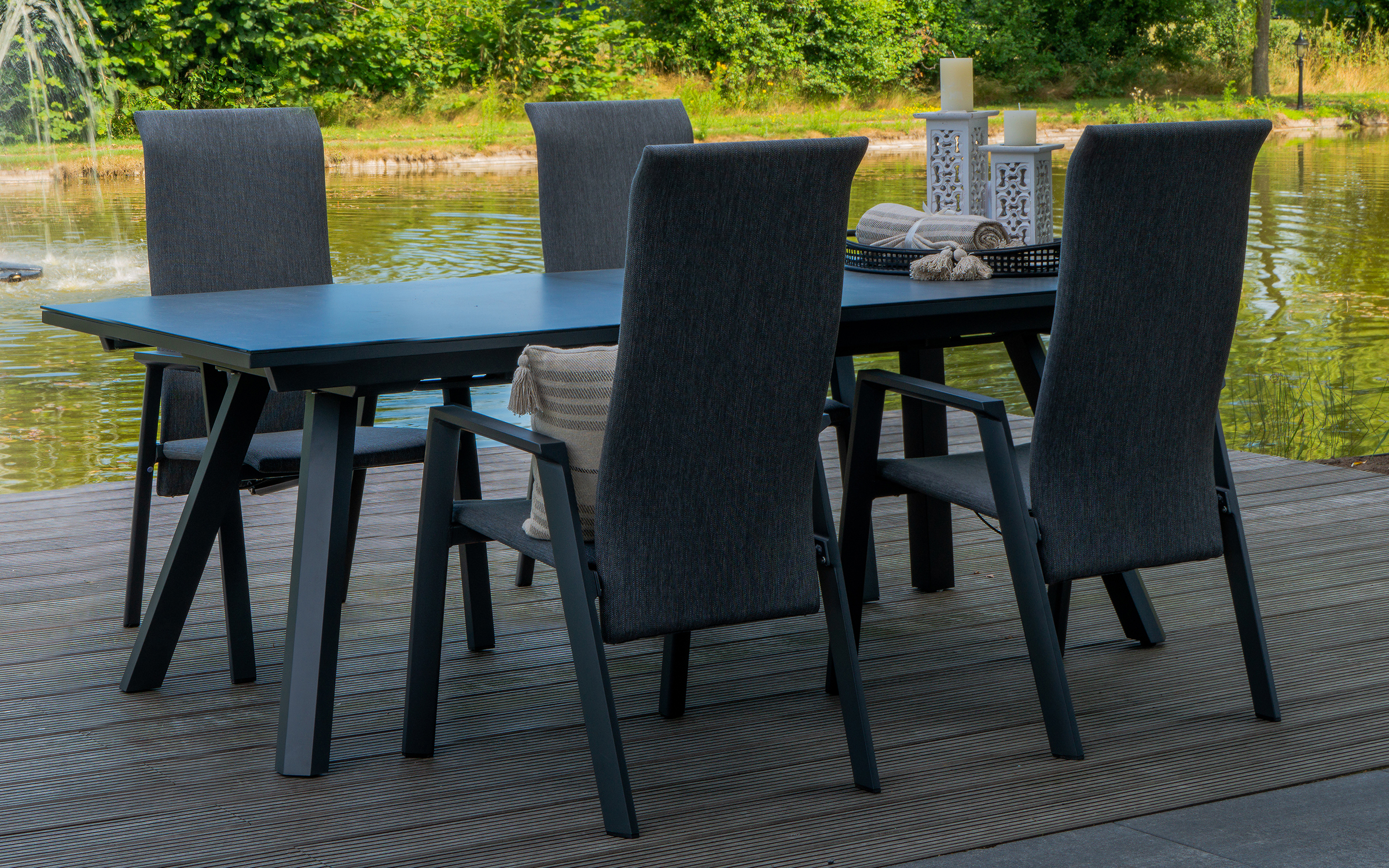 Krzesło Flare to elegancki i funkcjonalny mebel ogrodowy. Rama z aluminium malowanego proszkowo w kolorze antracytowym jest lekka, a jednocześnie bardzo wytrzymała. Siedzisko i oparcie tapicerowane z wkładem szybko schnącym, obicie z gęstej teksty liny łatwe w czyszczeniu zapewniają wygodę i odporność na warunki atmosferyczne. Oparcie regulowane płynnie dzięki mechanizmowi gazowemu pozwala dopasować pozycję siedzenia do indywidualnych potrzeb.