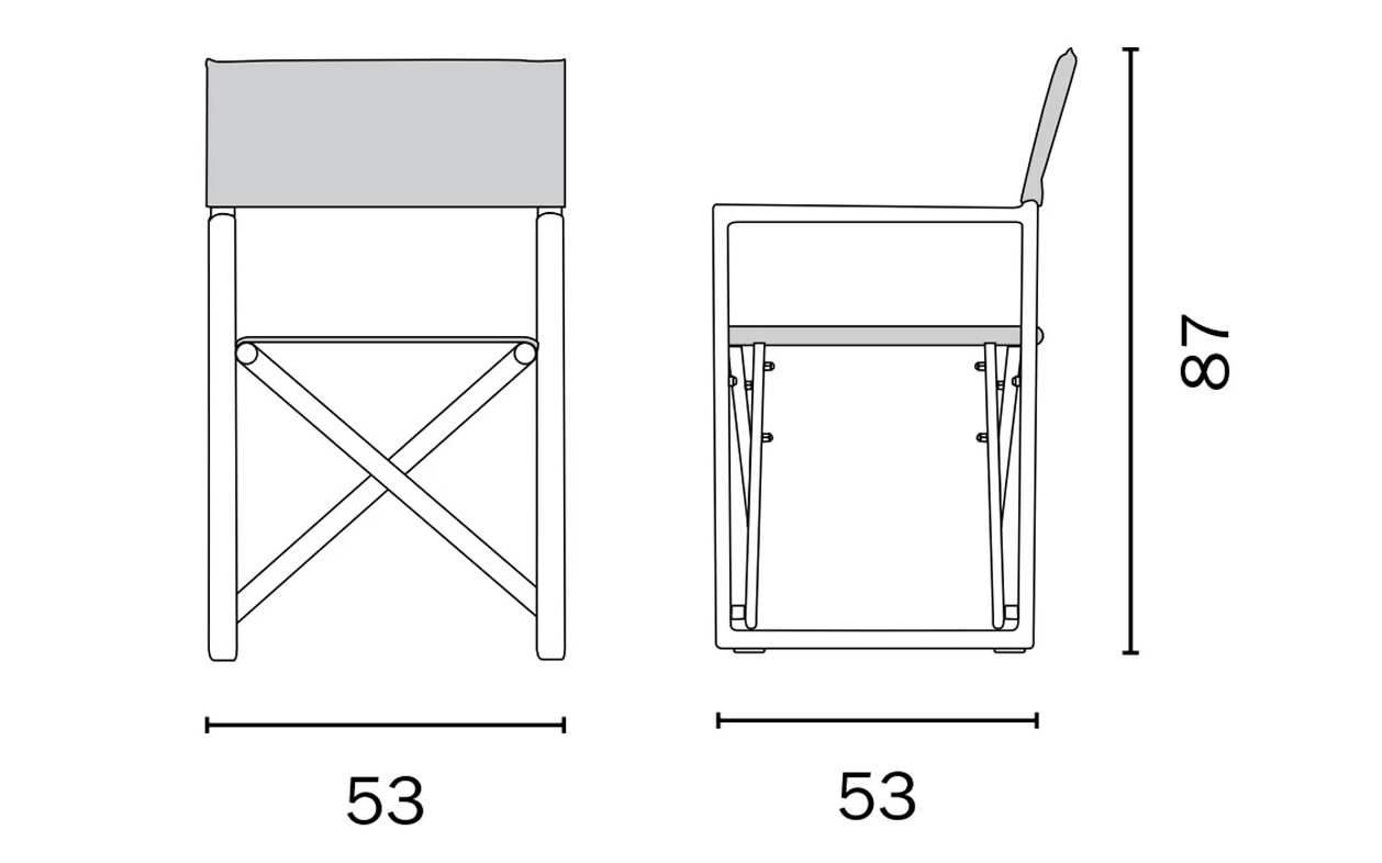 Elegancki "reżyserski" fotel o lekkiej konstrukcji aluminiowej malowanej na biało z siedziskiem z jasnoszarej tekstyliny.