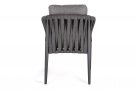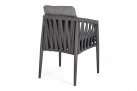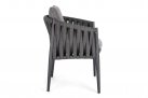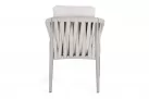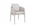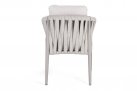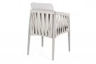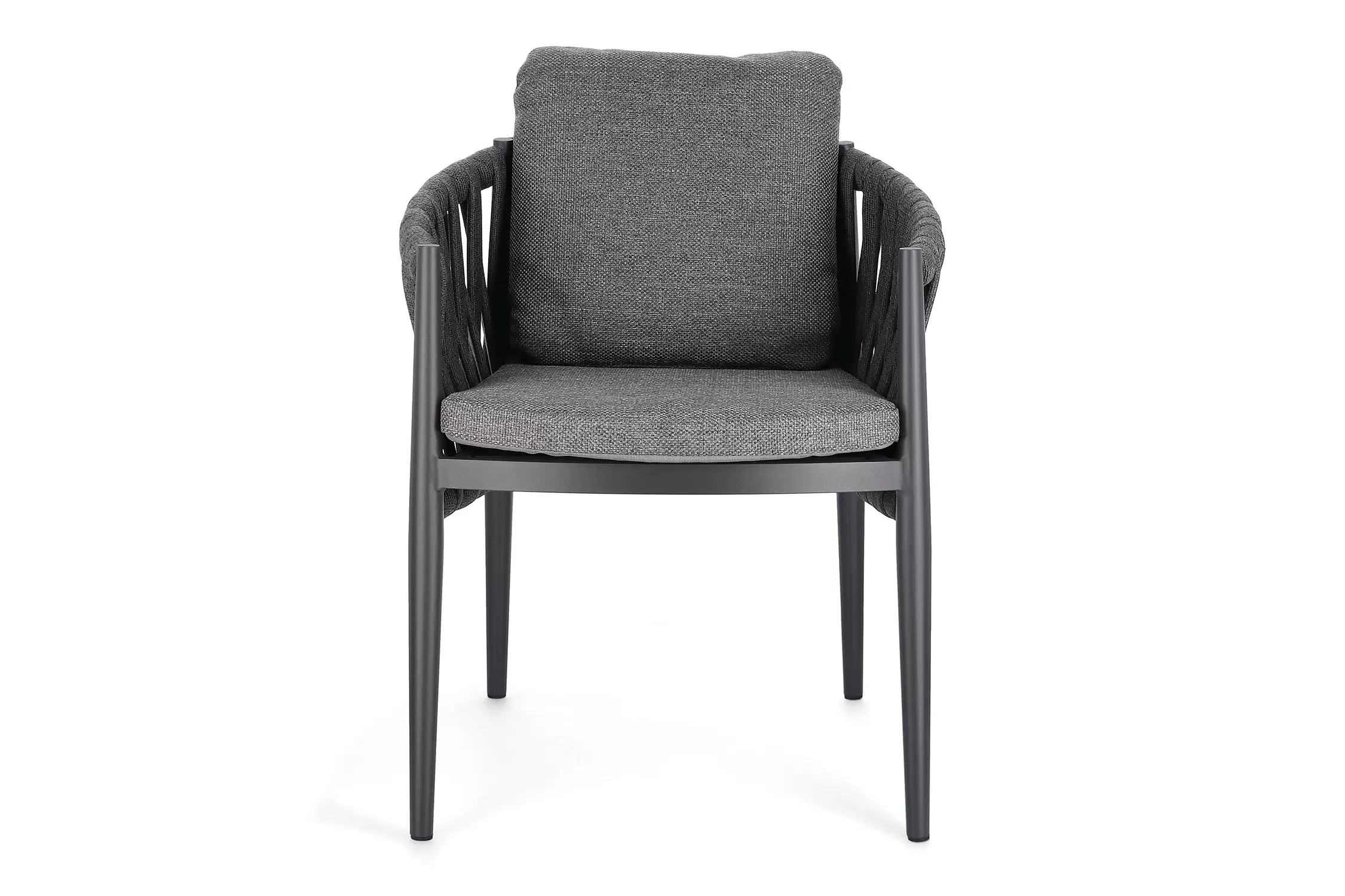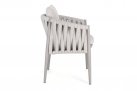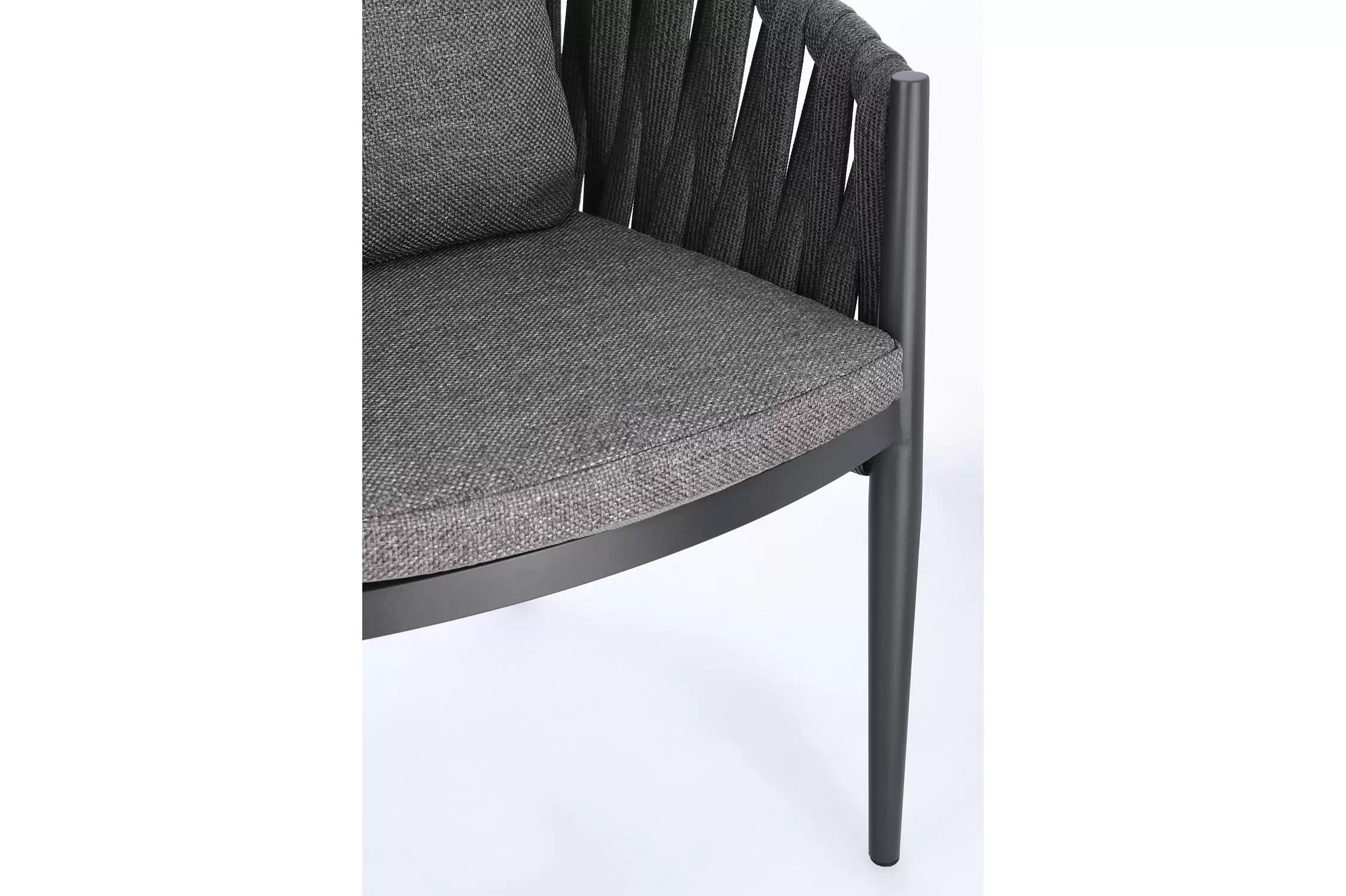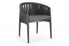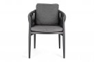 Ekskluzywne krzesło stołowe do użytku na tarasie w oryginalnym i co najważniejsze odpornym na warunki atmosferyczne wykonaniu. Delikatnie wygięte podłokietniki i wygodne oparcie oraz siedzisko w formie miękkich poduszek, zostało wykonane z wodoodpornej tkaniny Olefin. Materiał, która jest barwioną na wskroś tkaniną akrylową odporną na zabrudzenia, jest również odporna na działanie wody i pleśni. Ciekawą formą urozmaicenia budowy krzesła jest zastosowanie warkoczowego splotu po bokach i z tyłu stelaża. Stelaż krzesła, a także nogi wykonano z aluminium w malowaniu proszkowym. Wykorzystano tu system QDF, który jest bardzo odpornym na warunki atmosferyczne wypełnieniem poduch lub siedzisk, z wysokiej jakości szybkoschnącej pianki tapicerskiej Quick Dry Foam o właściwościach antybakteryjnych. Wytrzymałość materiałów, a także odporność na korozję, umożliwiają zastosowanie zarówno w domu jak i na zewnątrz - w ogrodzie lub na tarasie. Meble należy czyścić nie wykorzystując silnych środków chemicznych.
