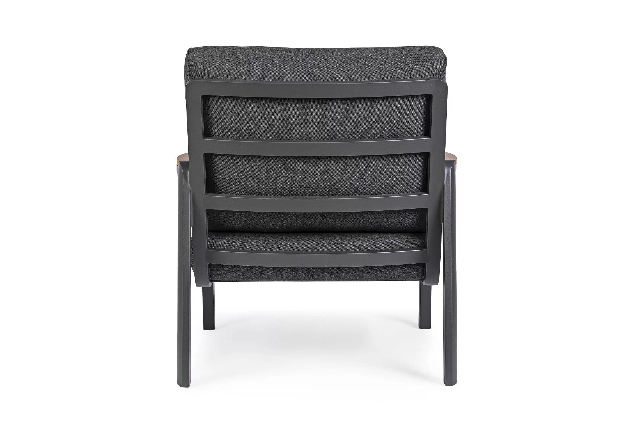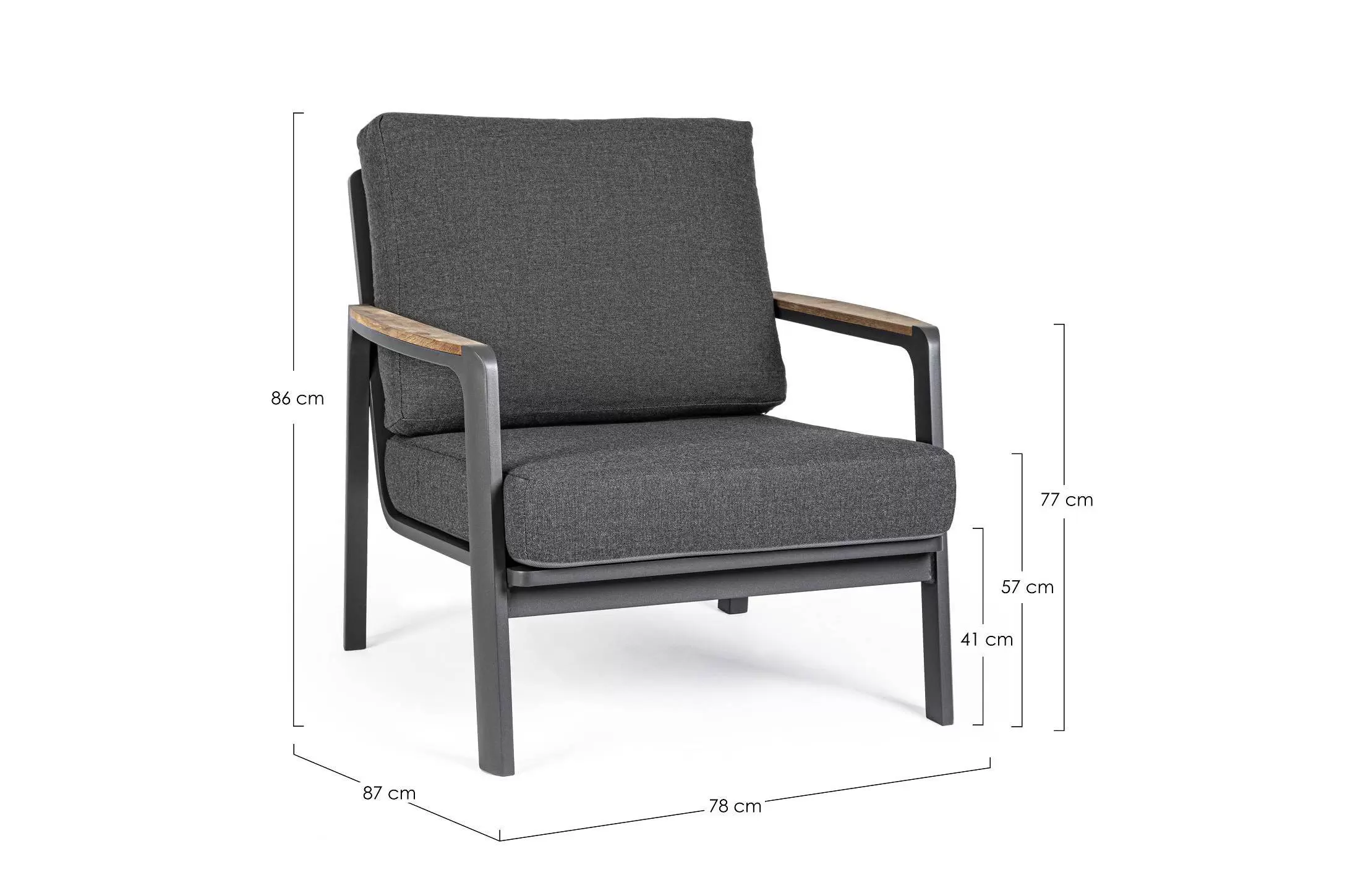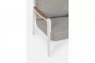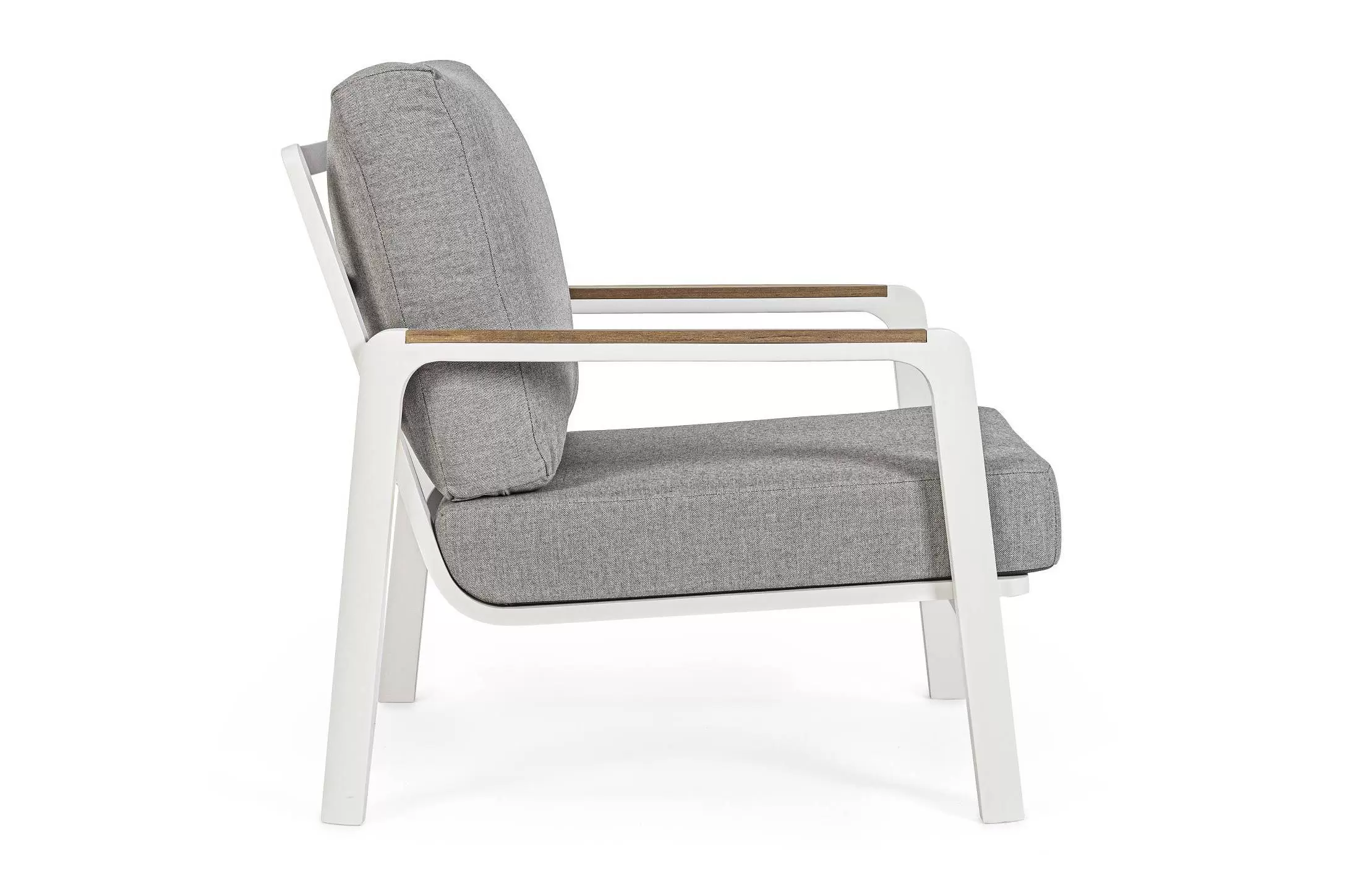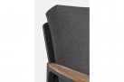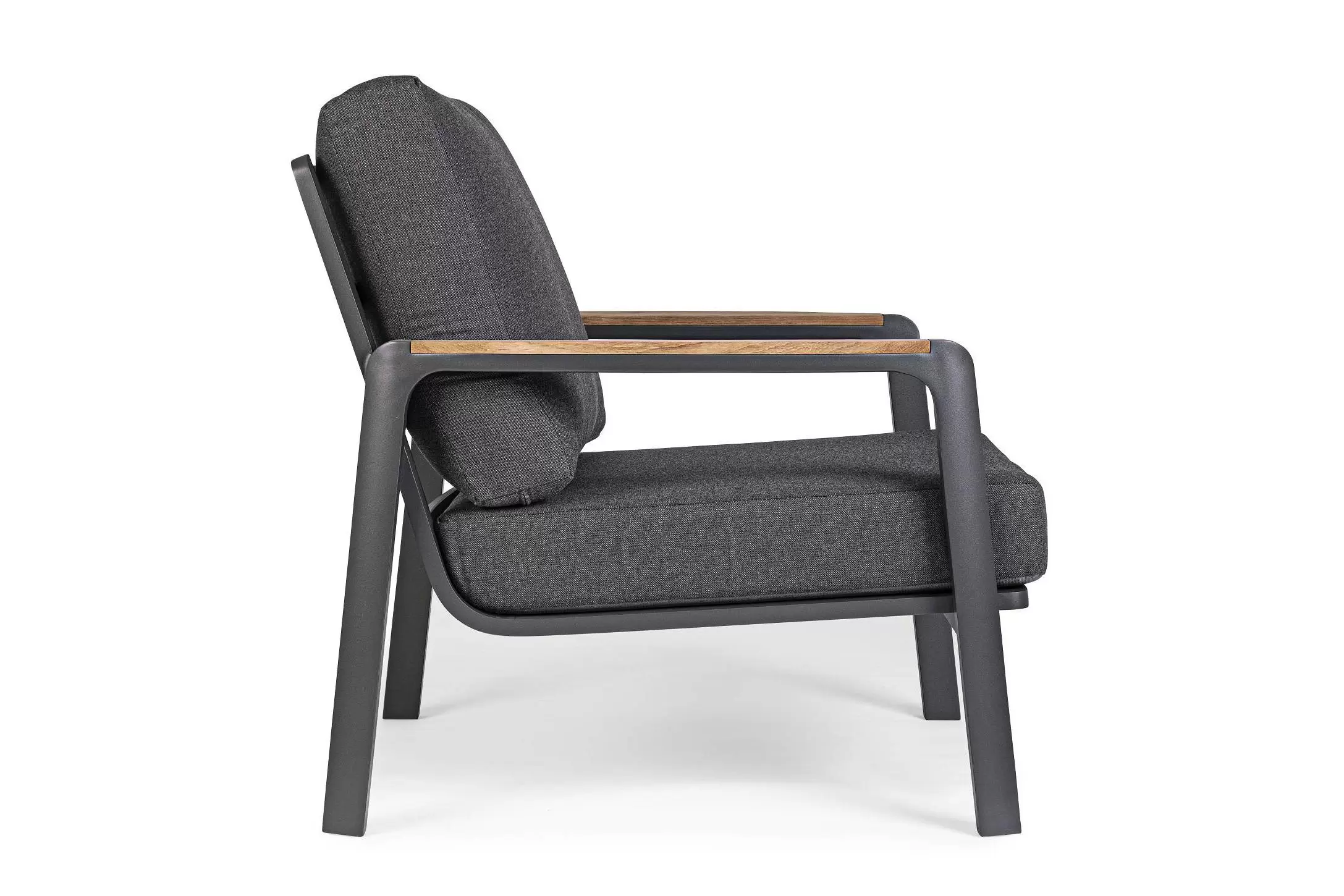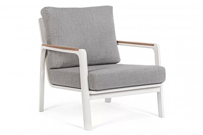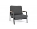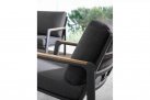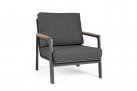 Aluminiowy fotel na taras z wysokim oparciem z przeznaczeniem do użytku na zewnątrz lub w patio. W podłokietnikach wstawki z drewna teak.