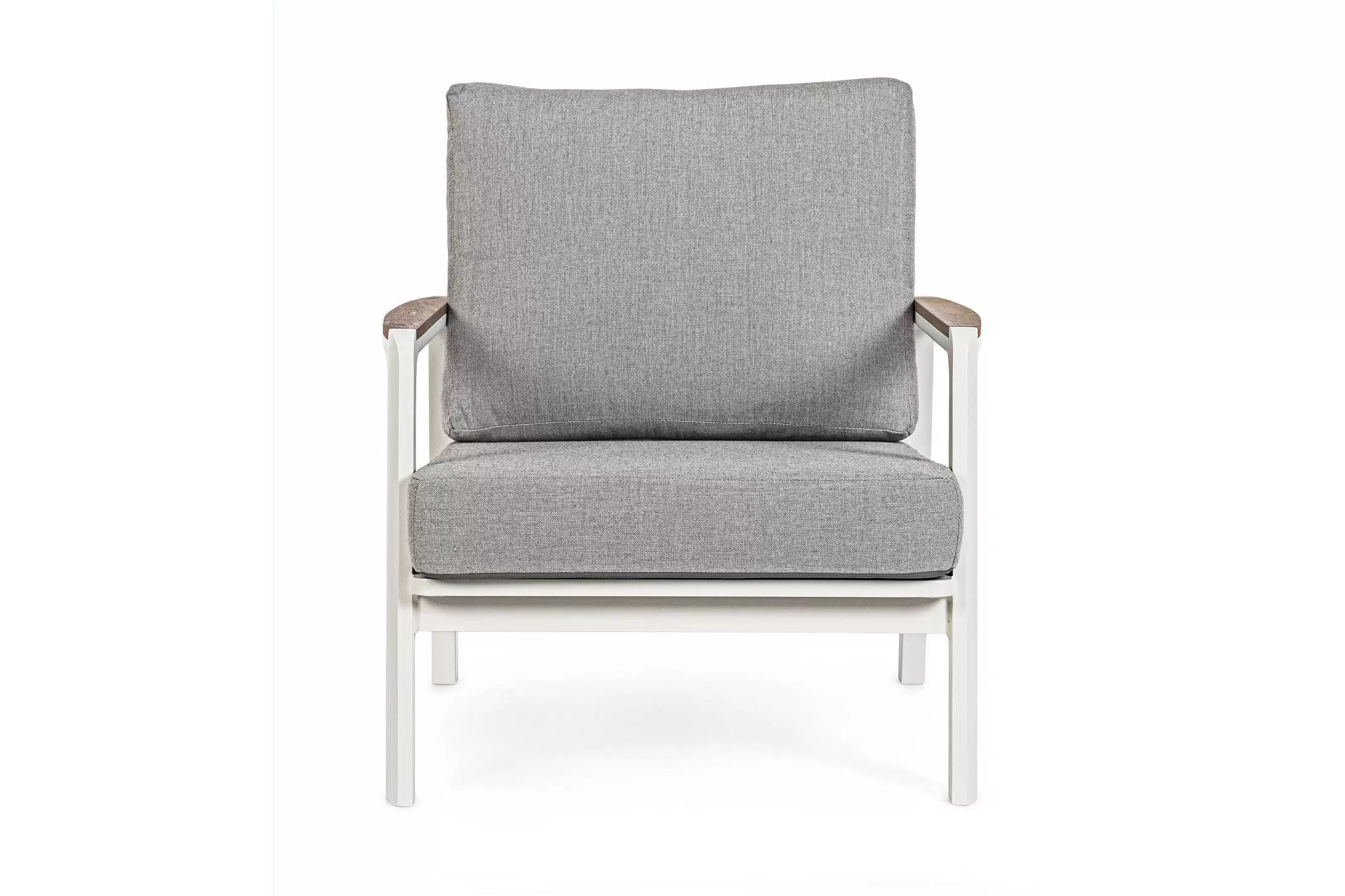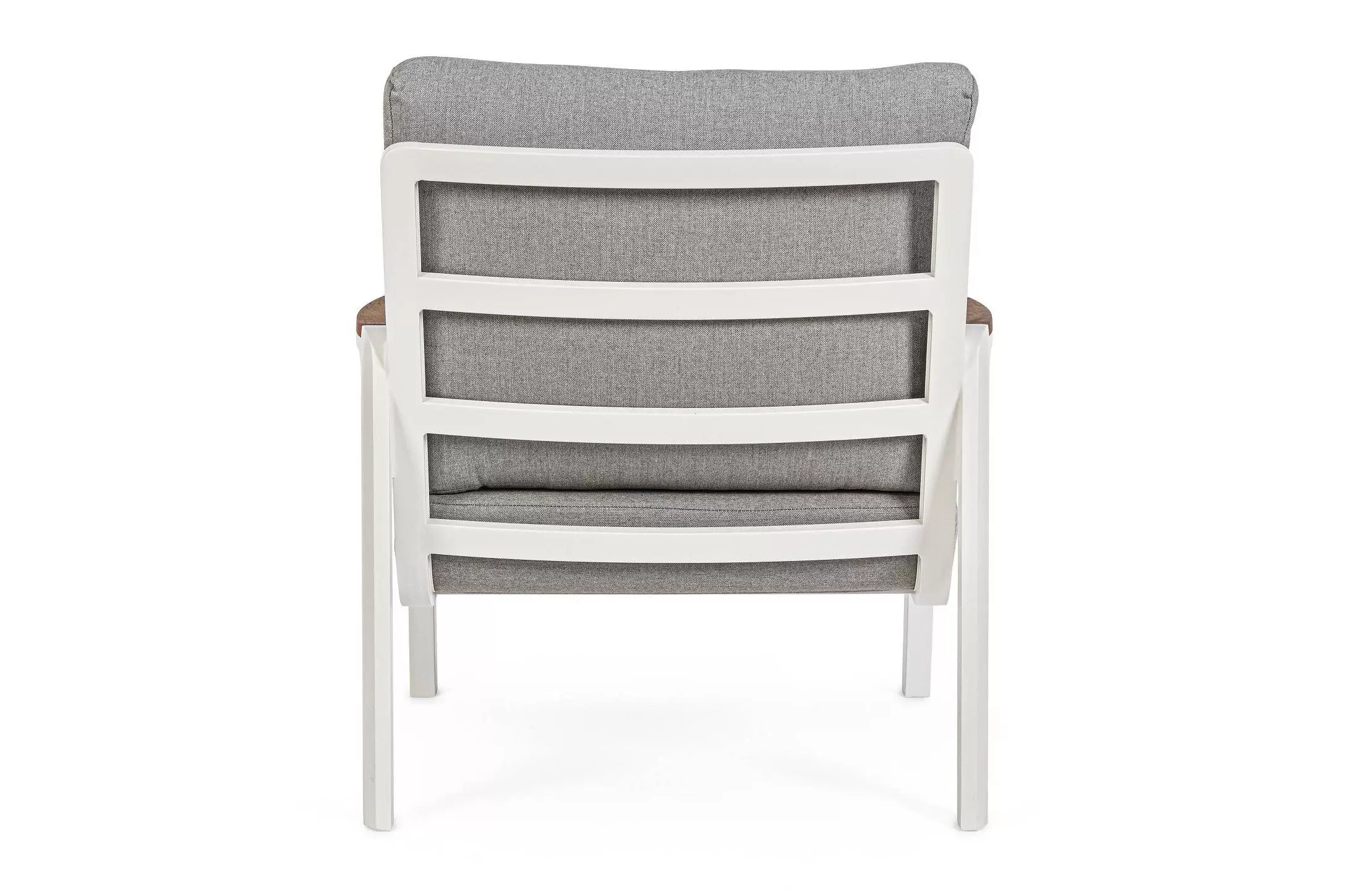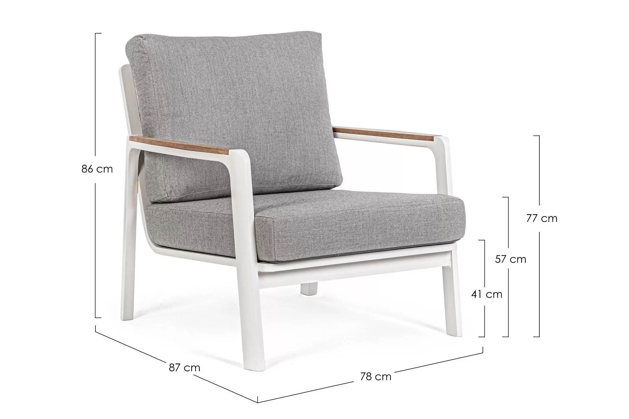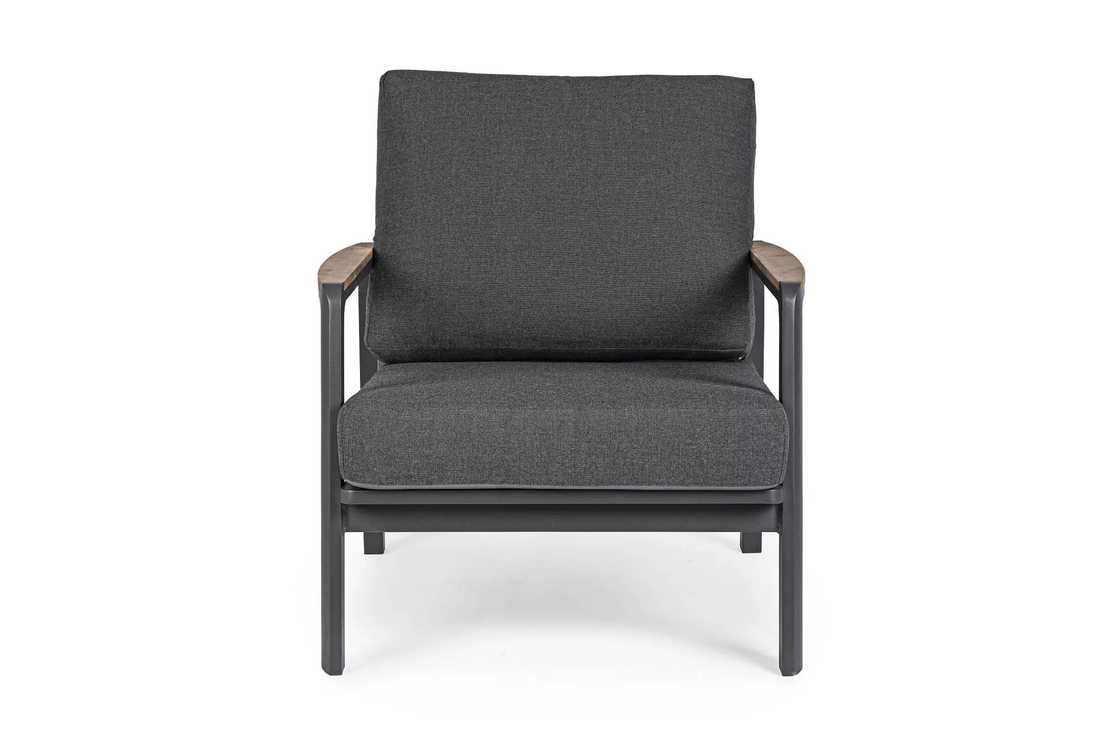 Aluminiowy fotel na taras z wysokim oparciem z przeznaczeniem do użytku na zewnątrz lub w patio. W podłokietnikach wstawki z drewna teak.