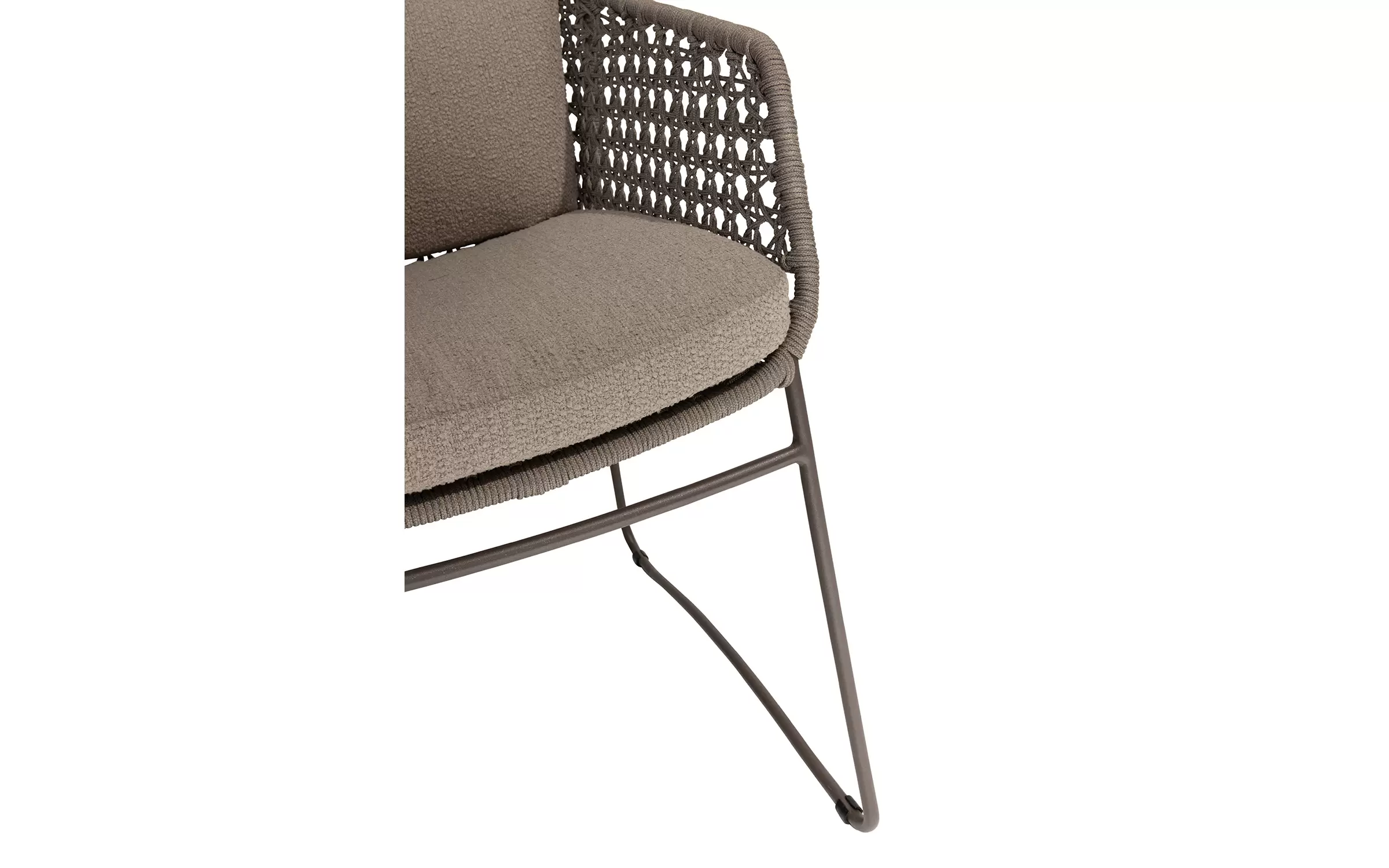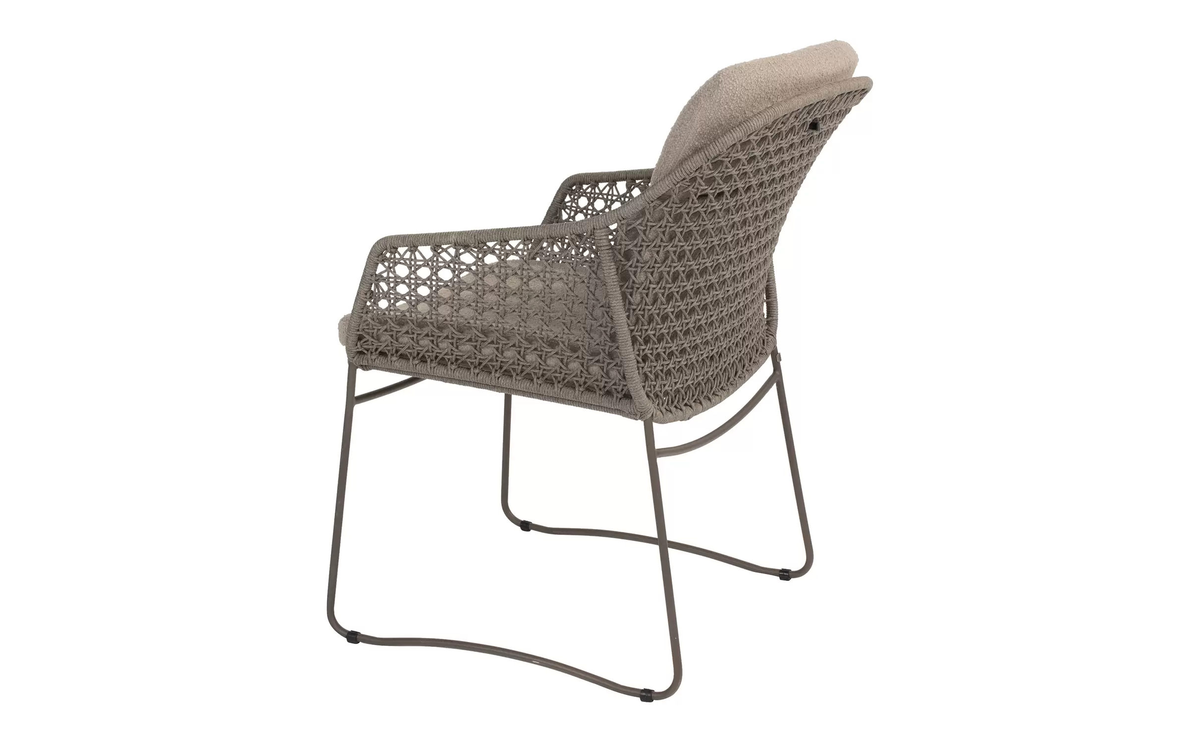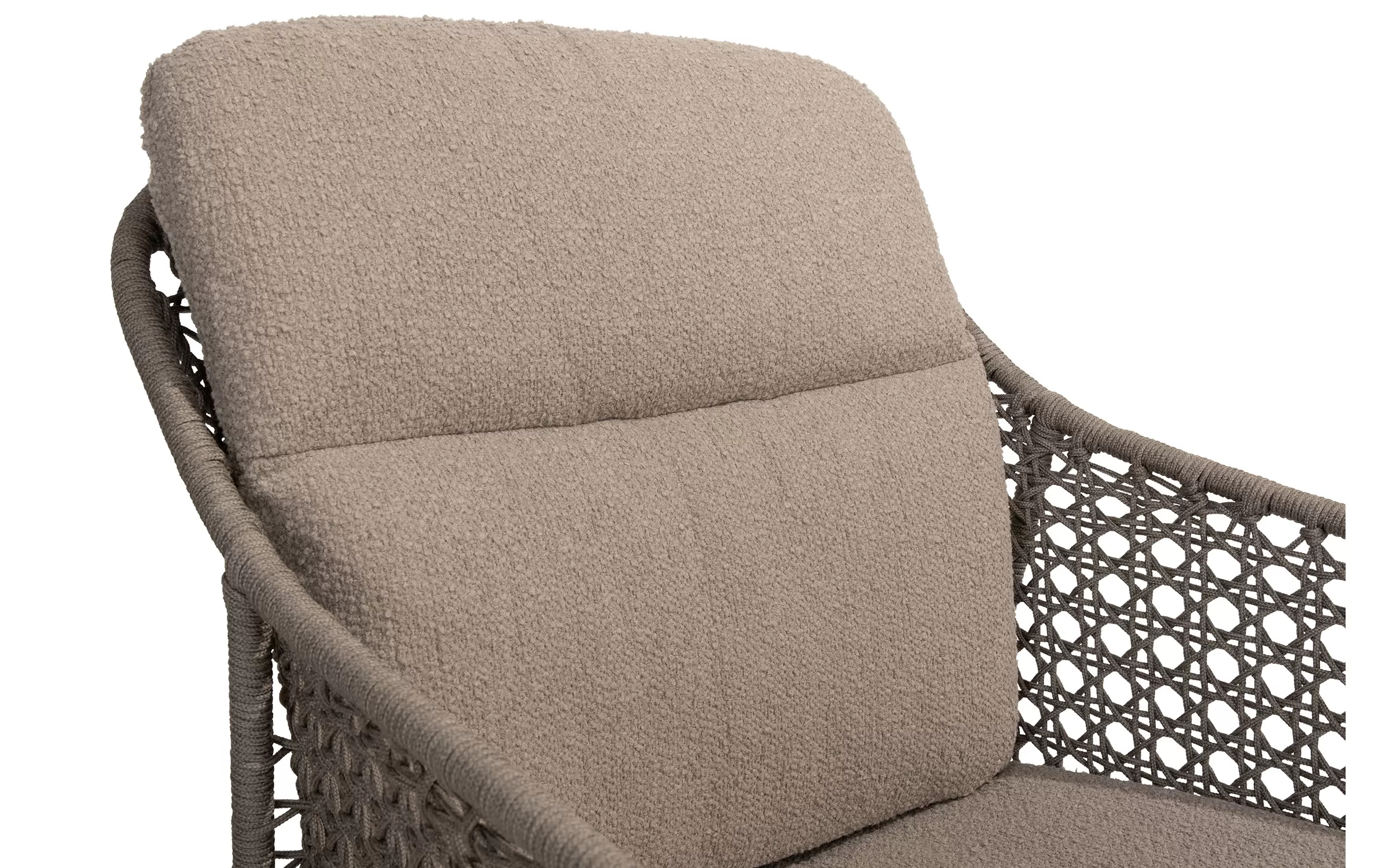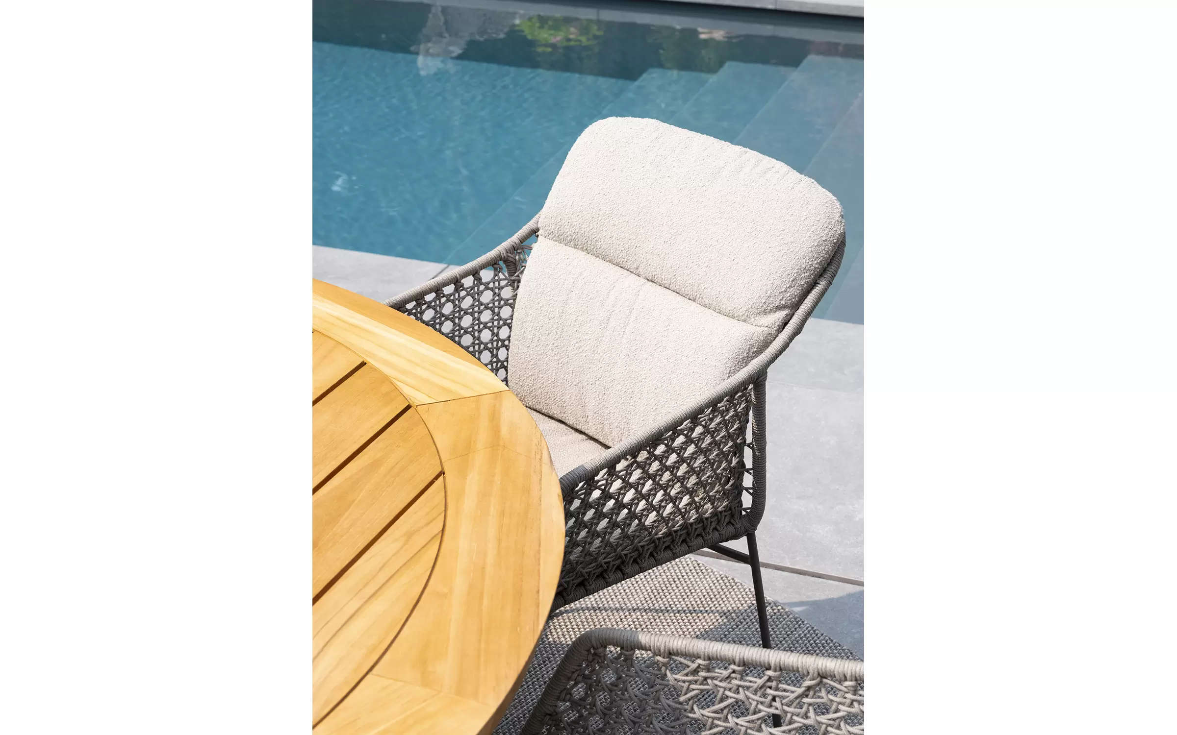 - Do krzesła dołączone są dwie odporne na warunki atmosferyczne poduszki z miękkiej tkaniny bouclé, które zapewniają optymalny komfort siedzenia, nawet podczas dłuższych kolacji.