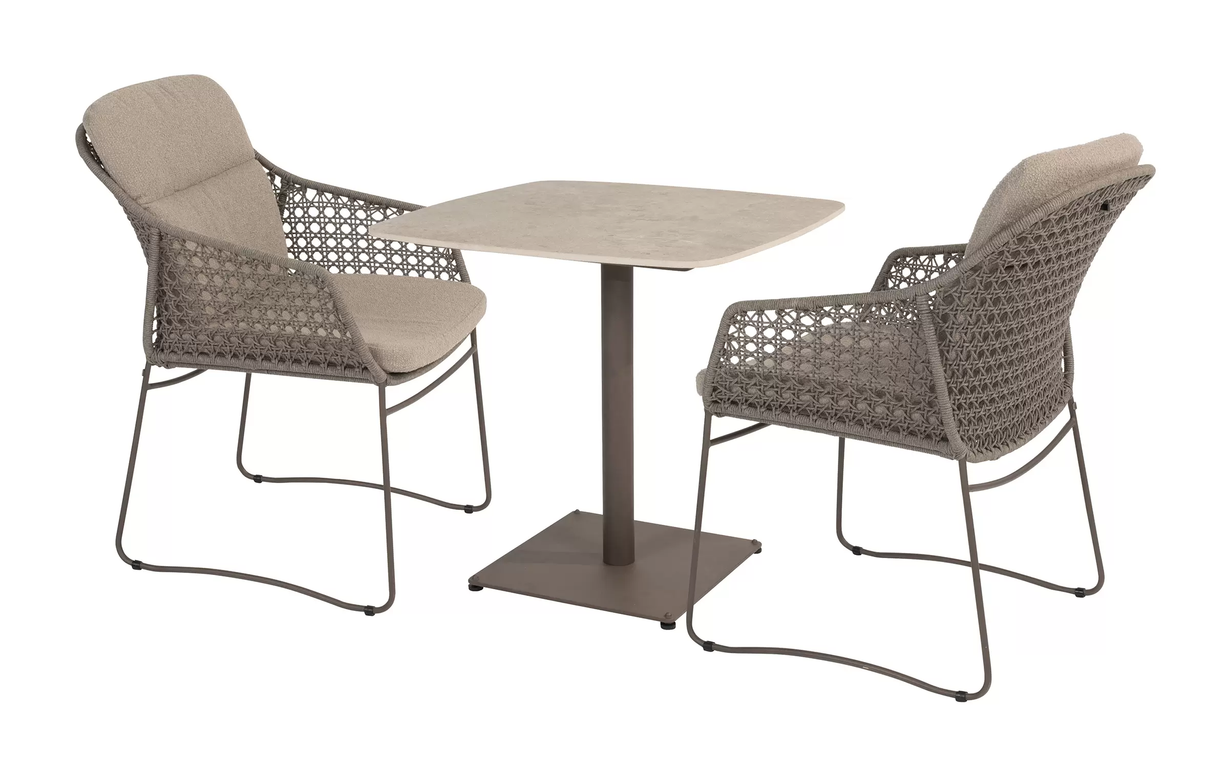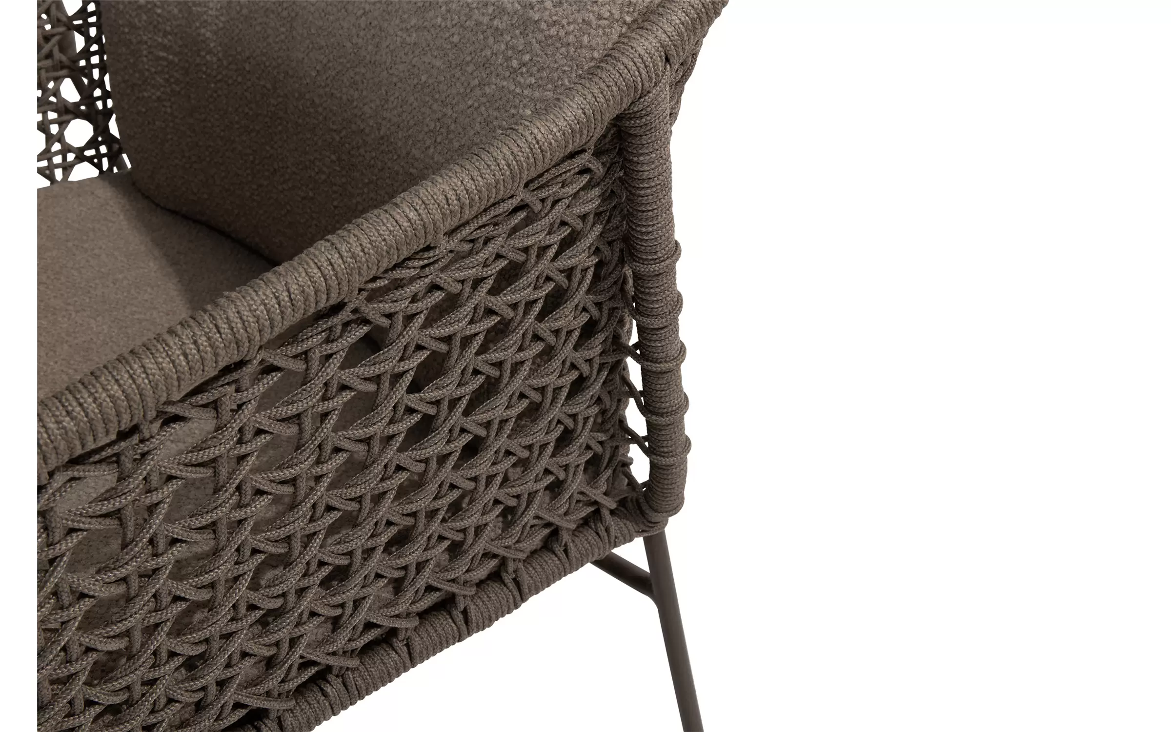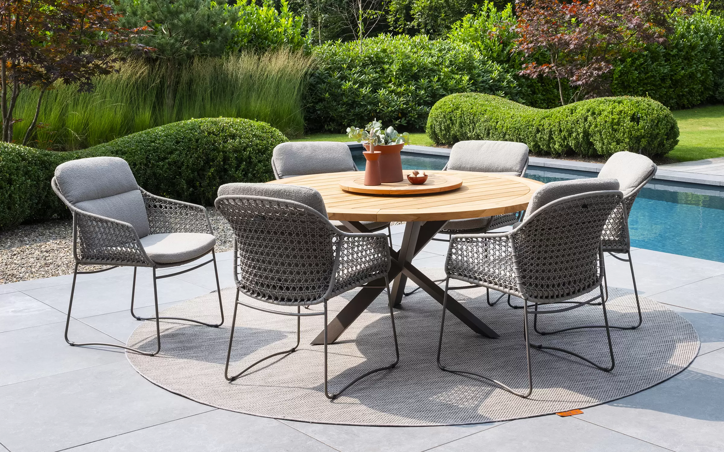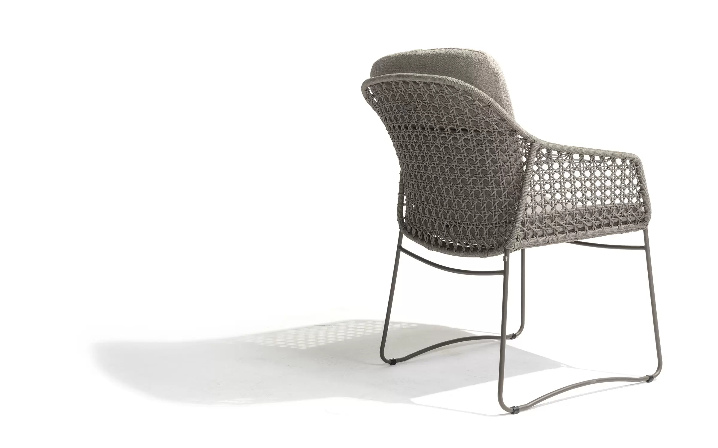 - Do krzesła dołączone są dwie odporne na warunki atmosferyczne poduszki z miękkiej tkaniny bouclé, które zapewniają optymalny komfort siedzenia, nawet podczas dłuższych kolacji.