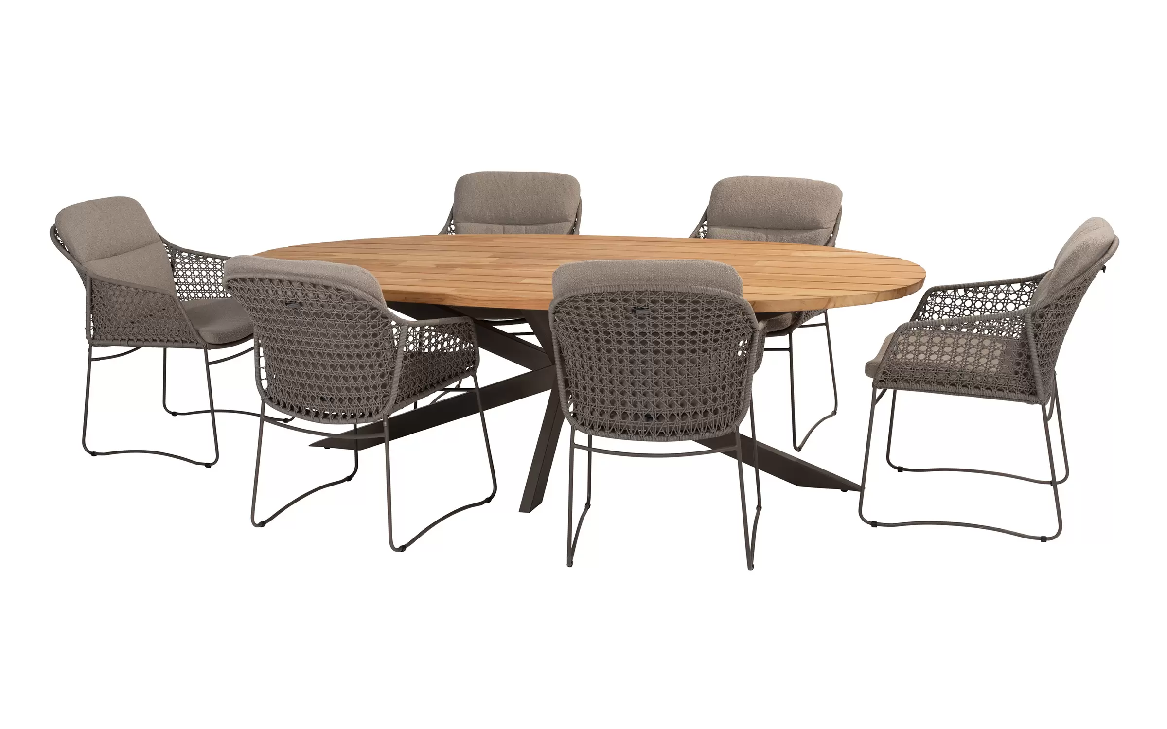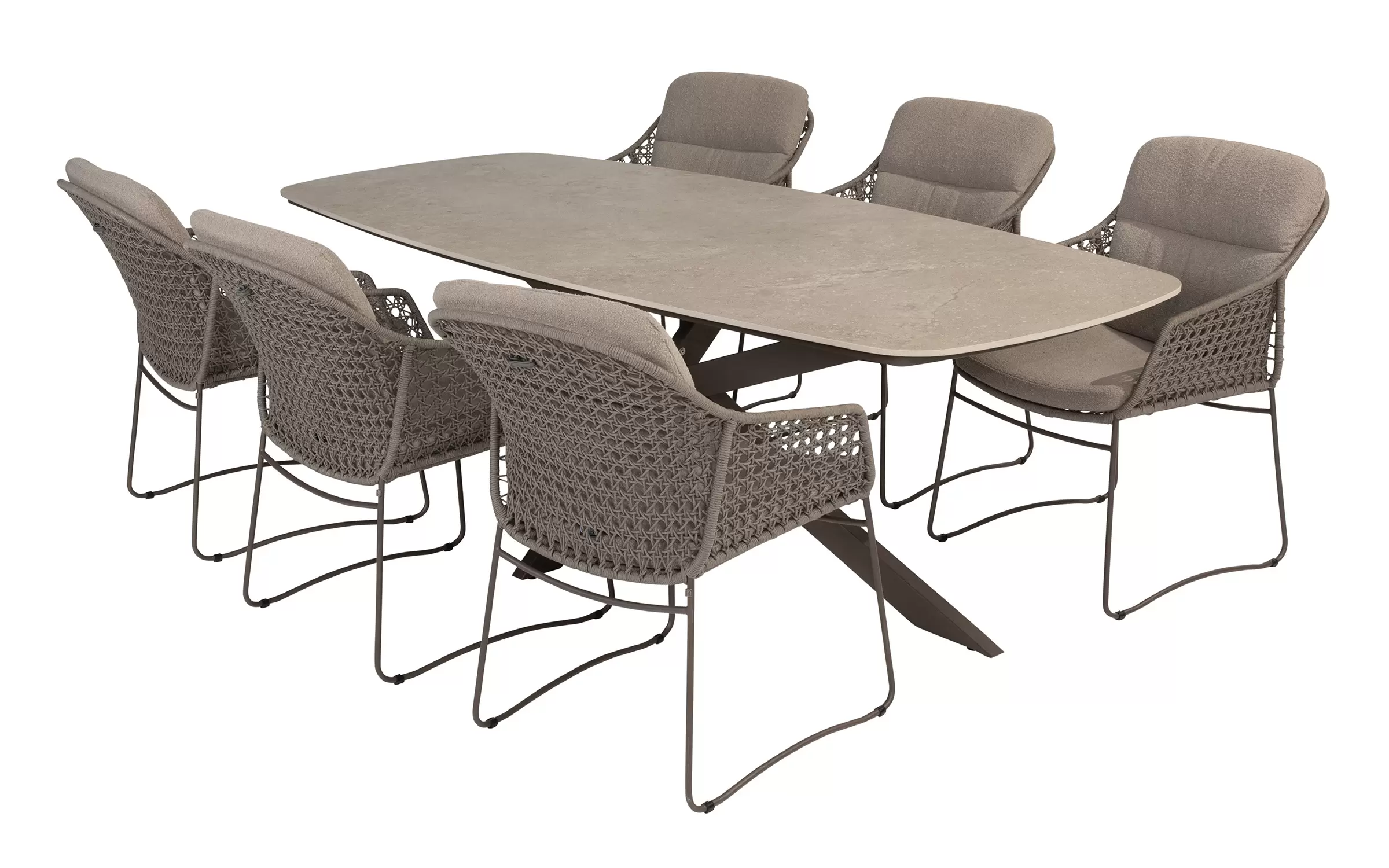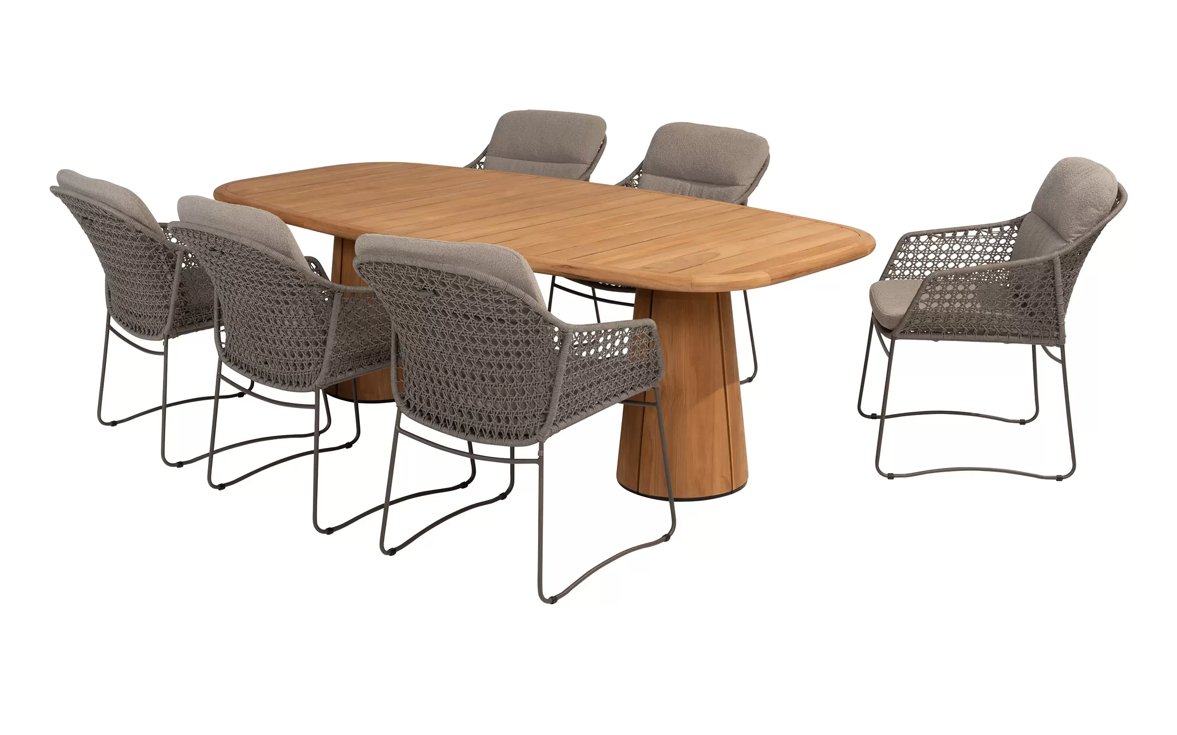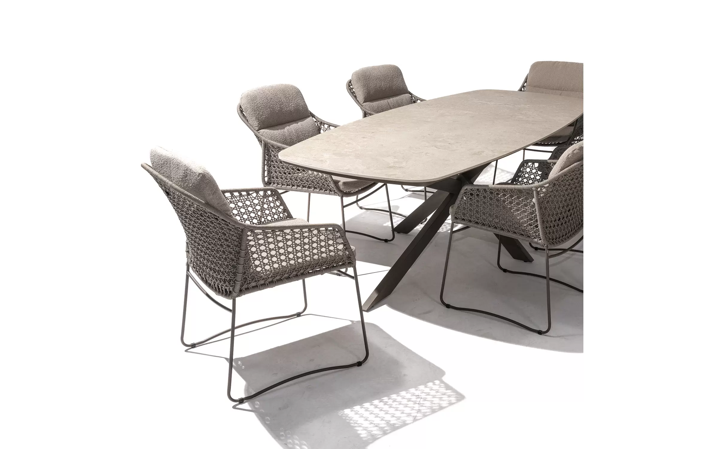 - Do krzesła dołączone są dwie odporne na warunki atmosferyczne poduszki z miękkiej tkaniny bouclé, które zapewniają optymalny komfort siedzenia, nawet podczas dłuższych kolacji.