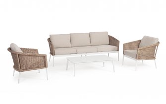 Aluminiowe krzesło ogrodowe z siedziskiem wyplecionym technorattanem zwijanym, imitującym włókna liści bananowca. Elegancka konstrukcja oraz wysokiej jakości poduszki z gęstej, sprężystej pianki w poszewkach Olefin zapewniają wygodę podczas wypoczynku na tarasie.