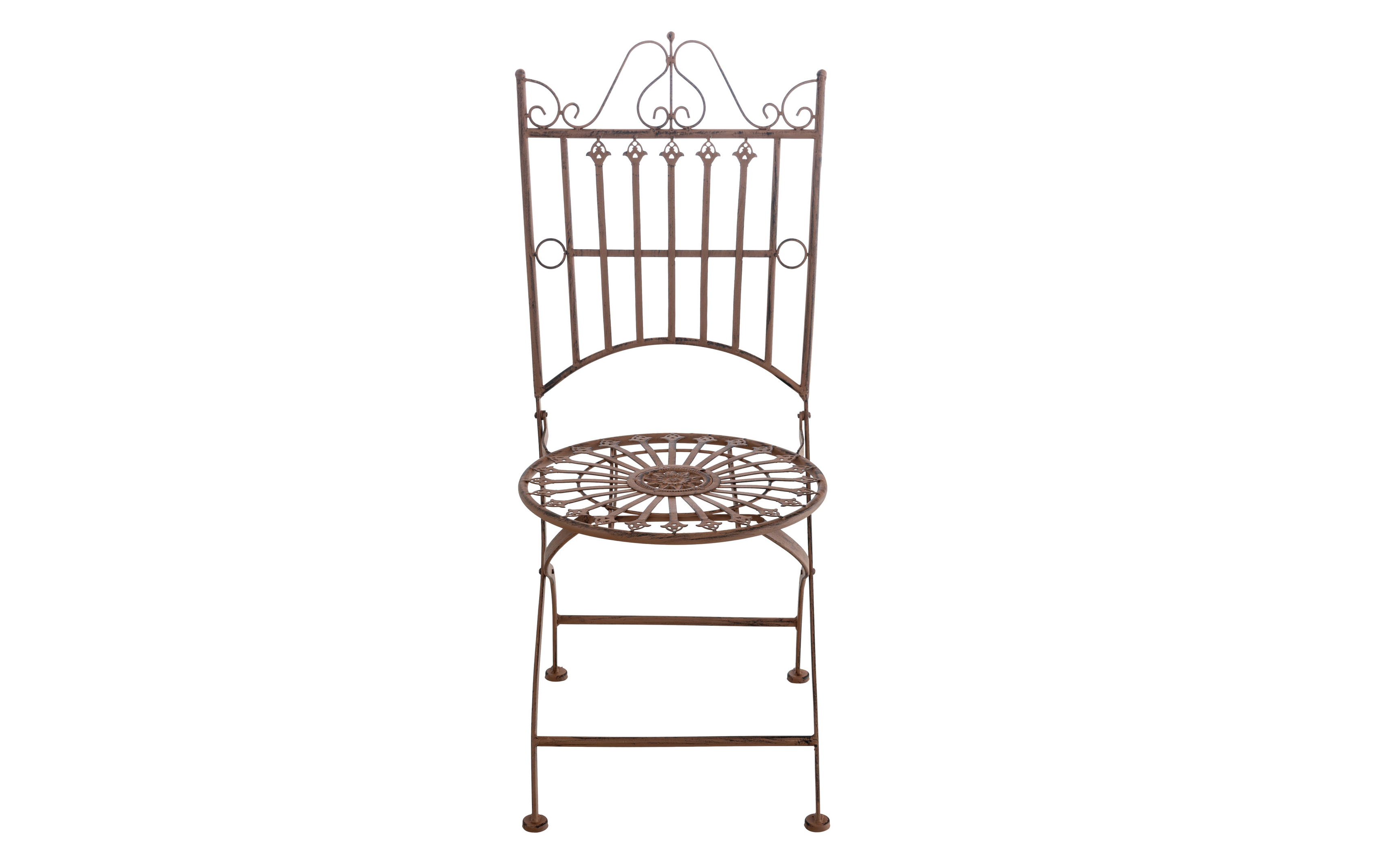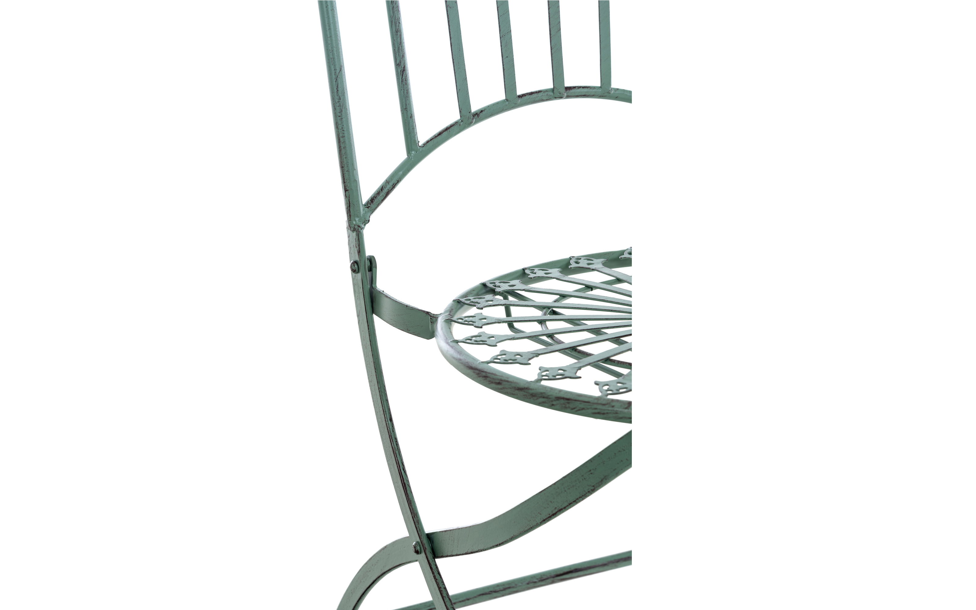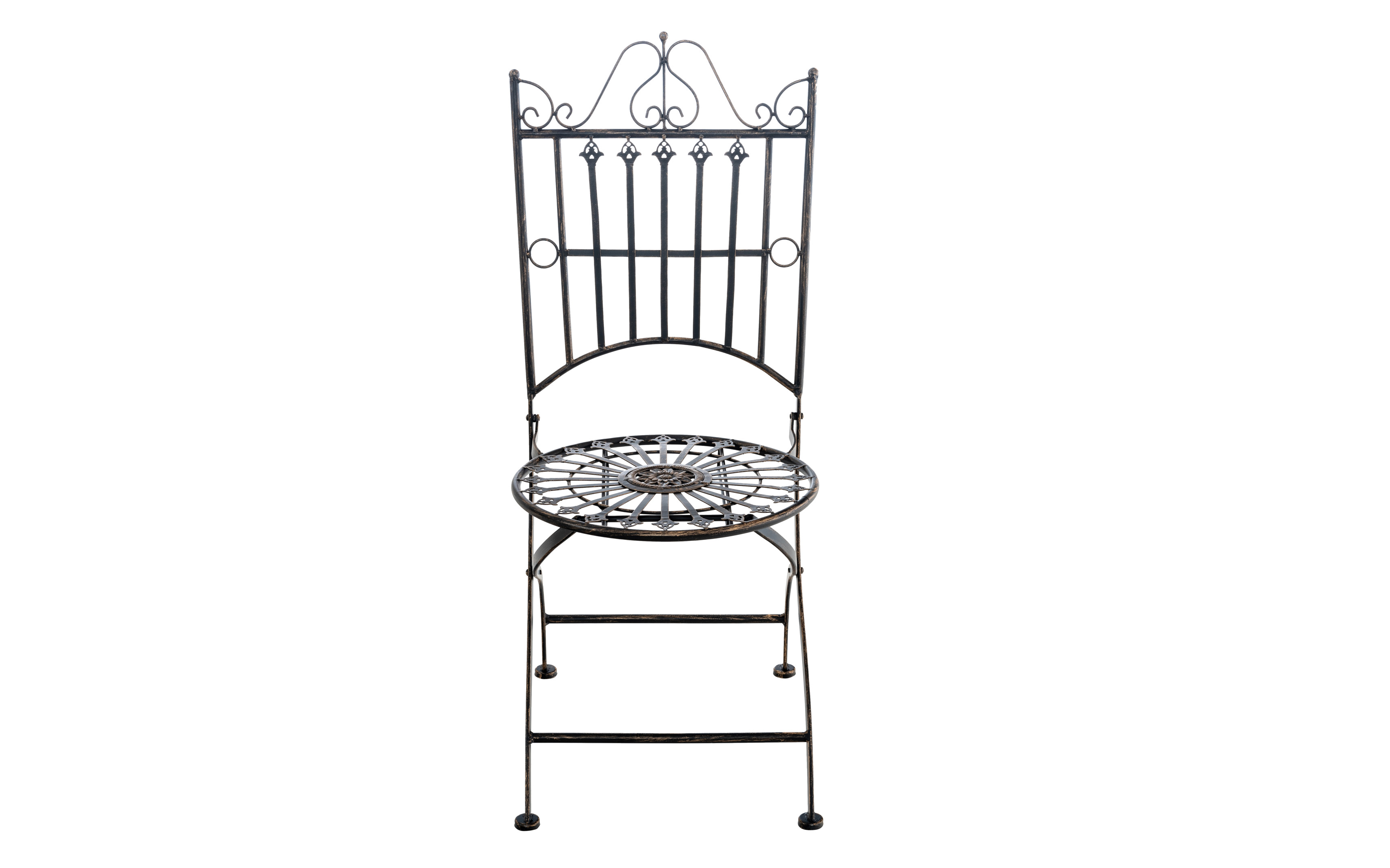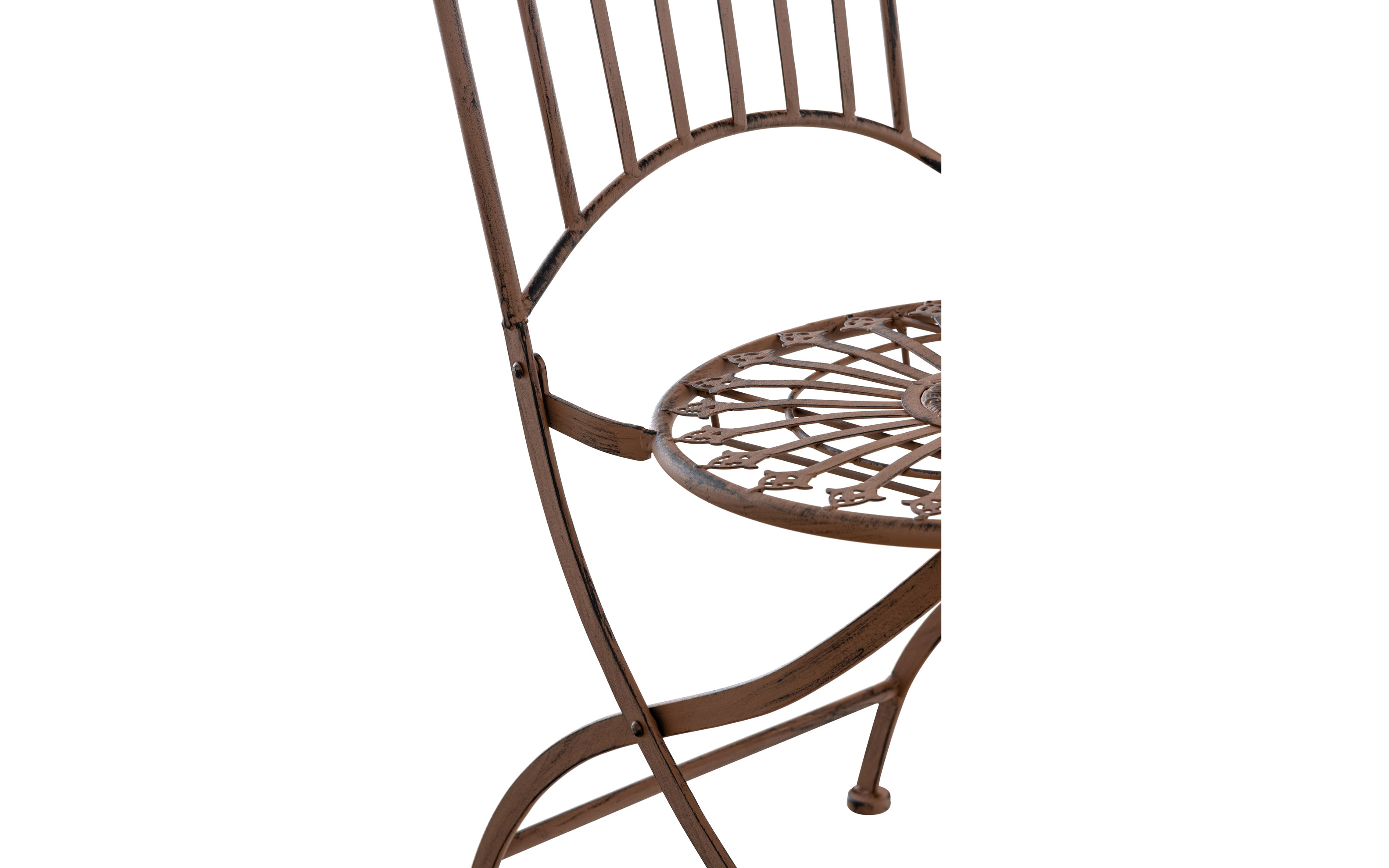 To piękne krzesło o nostalgicznym designie przyciąga wzrok i zachwyca wdzięcznym kształtem i wykończonymi detalami dekoracji. Krzesło składane idealnie nadaje się tam, gdzie ilość miejsca jest ważna. Krzesło ogrodowe zostało wykonane z żelaza, dzięki czemu jest wytrzymałe. Powierzchnia wykończona antyczną patyną. Krzesło jest szczególnie wszechstronne i elastyczne dzięki łatwej obsłudze. Gdy nie jest używane, można je złożyć i schować, aby zaoszczędzić miejsce.