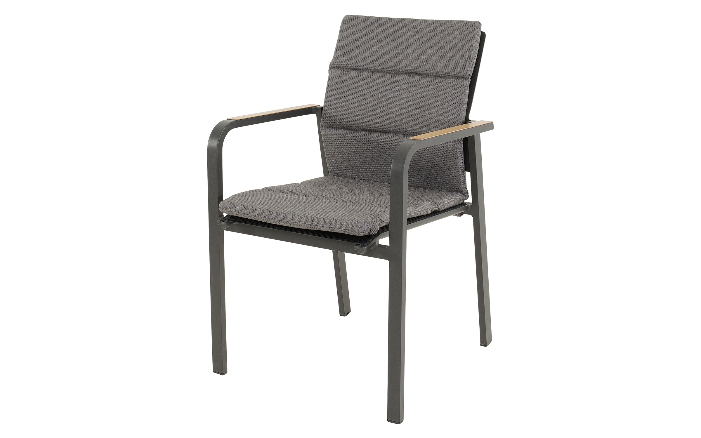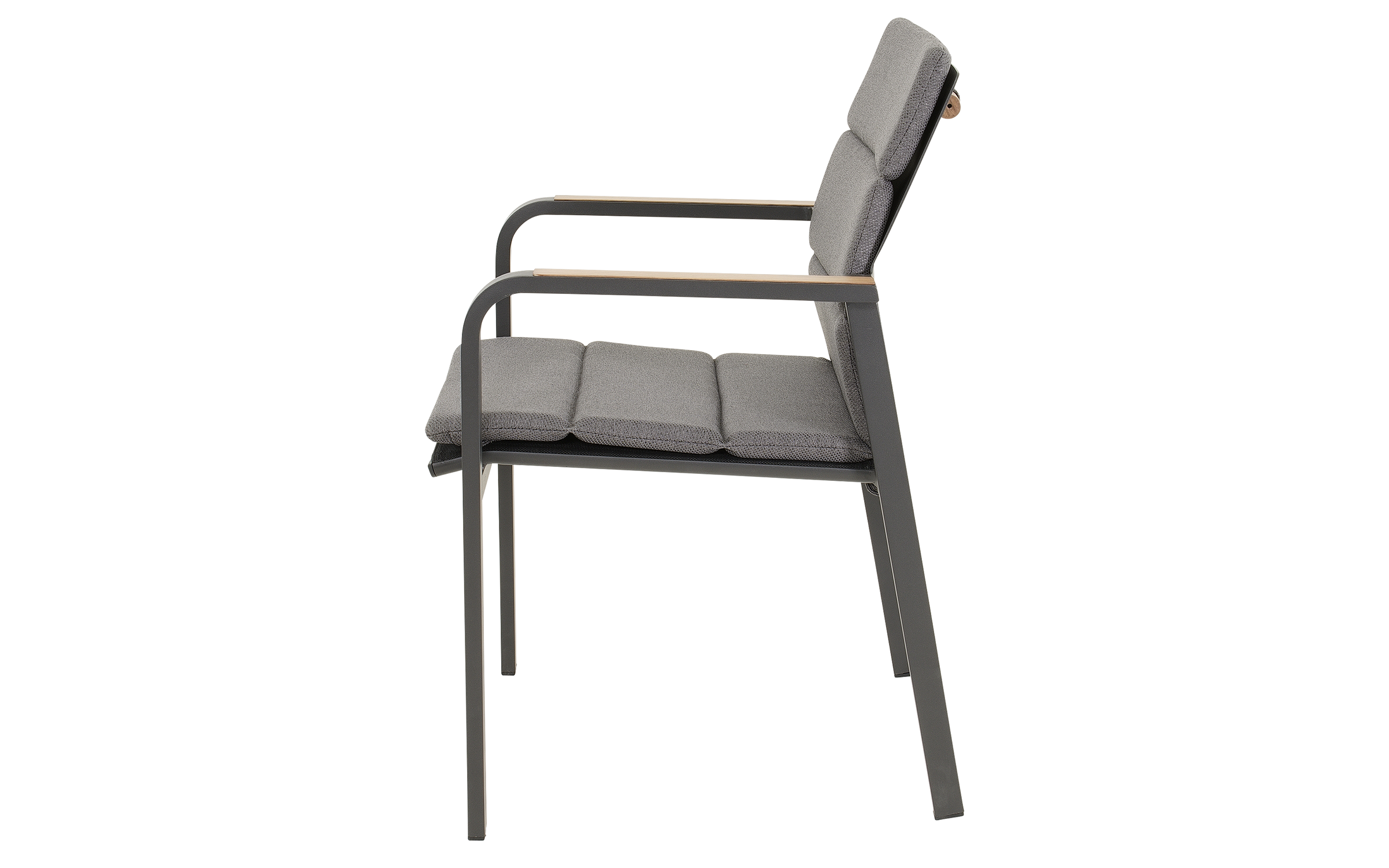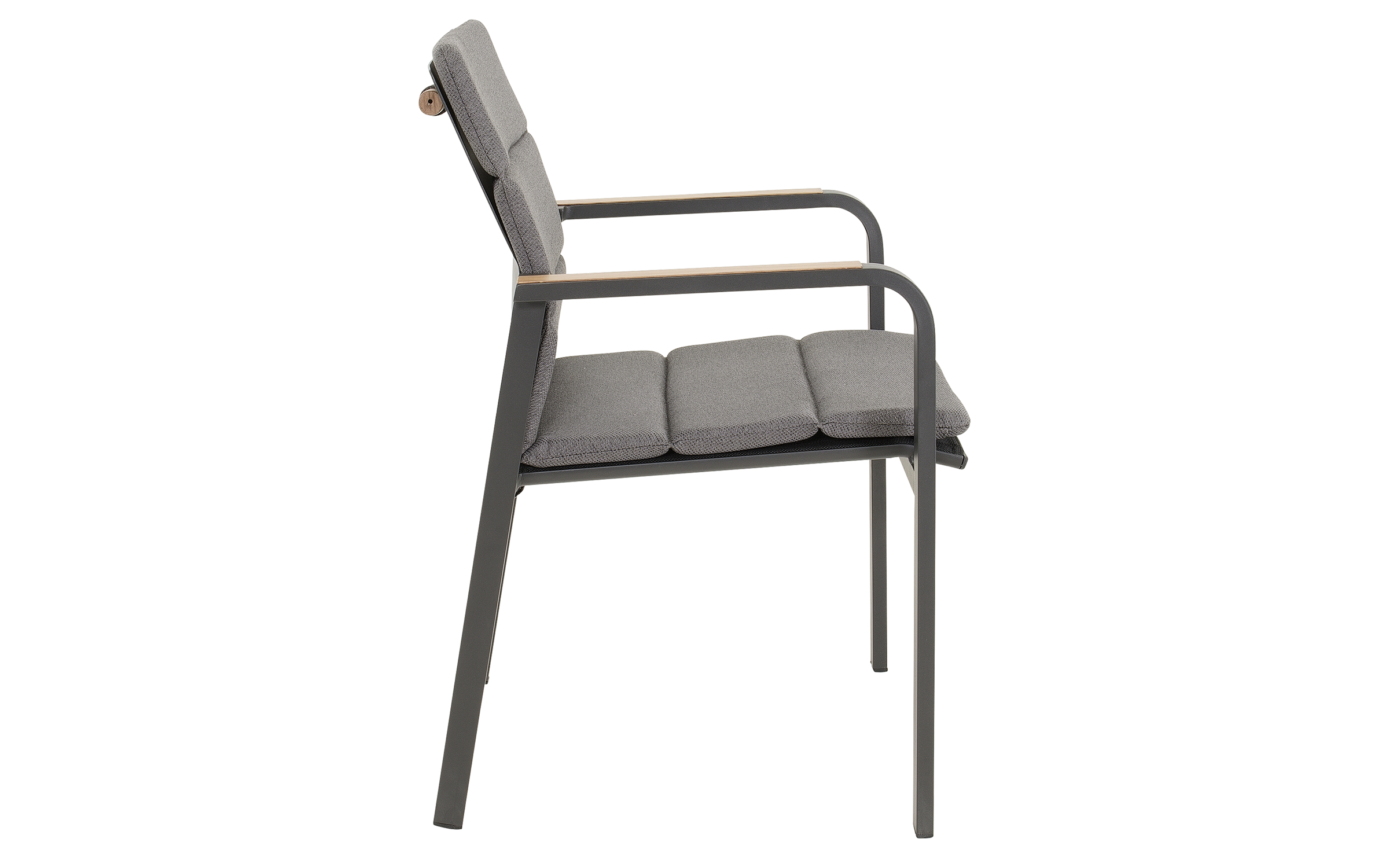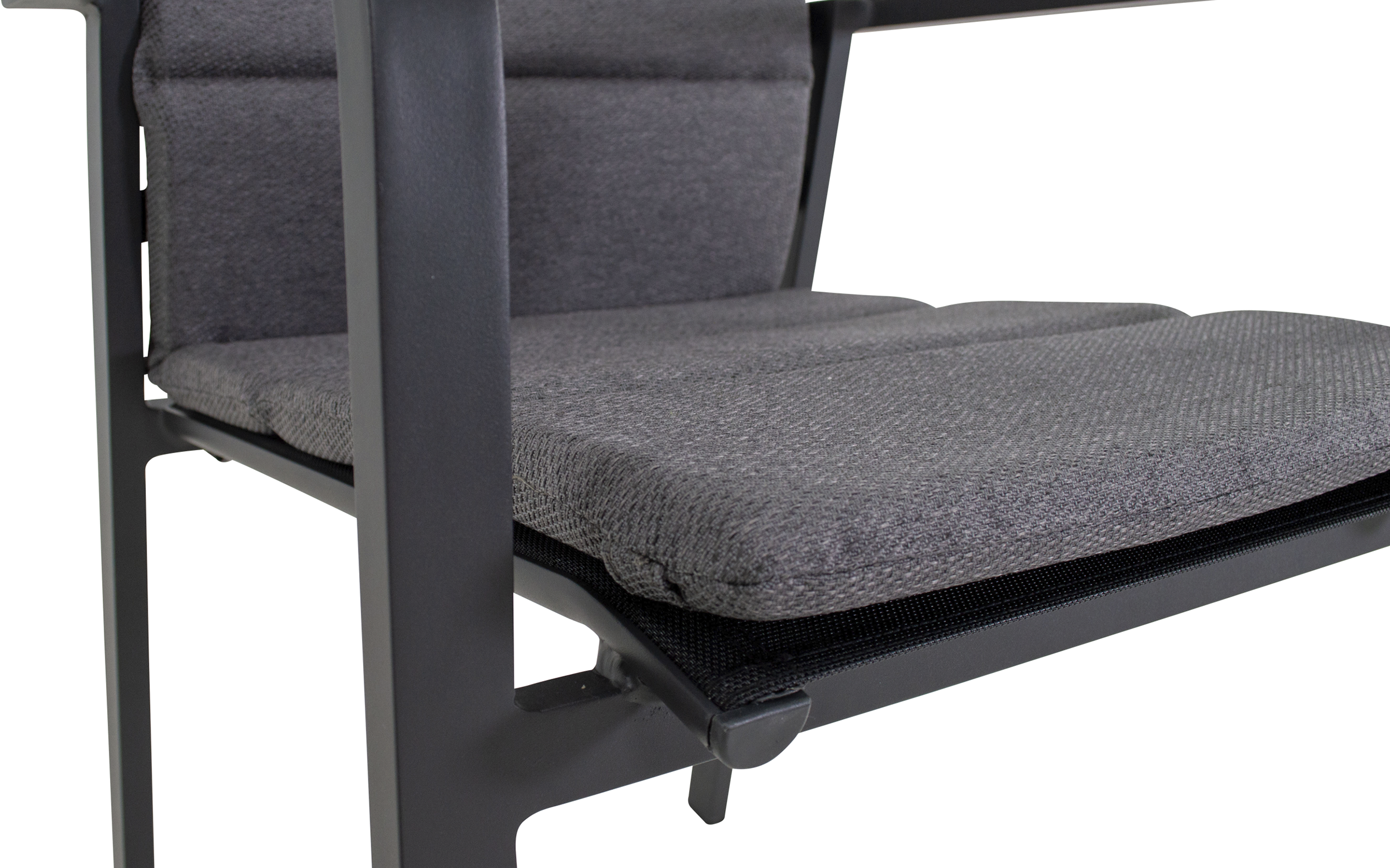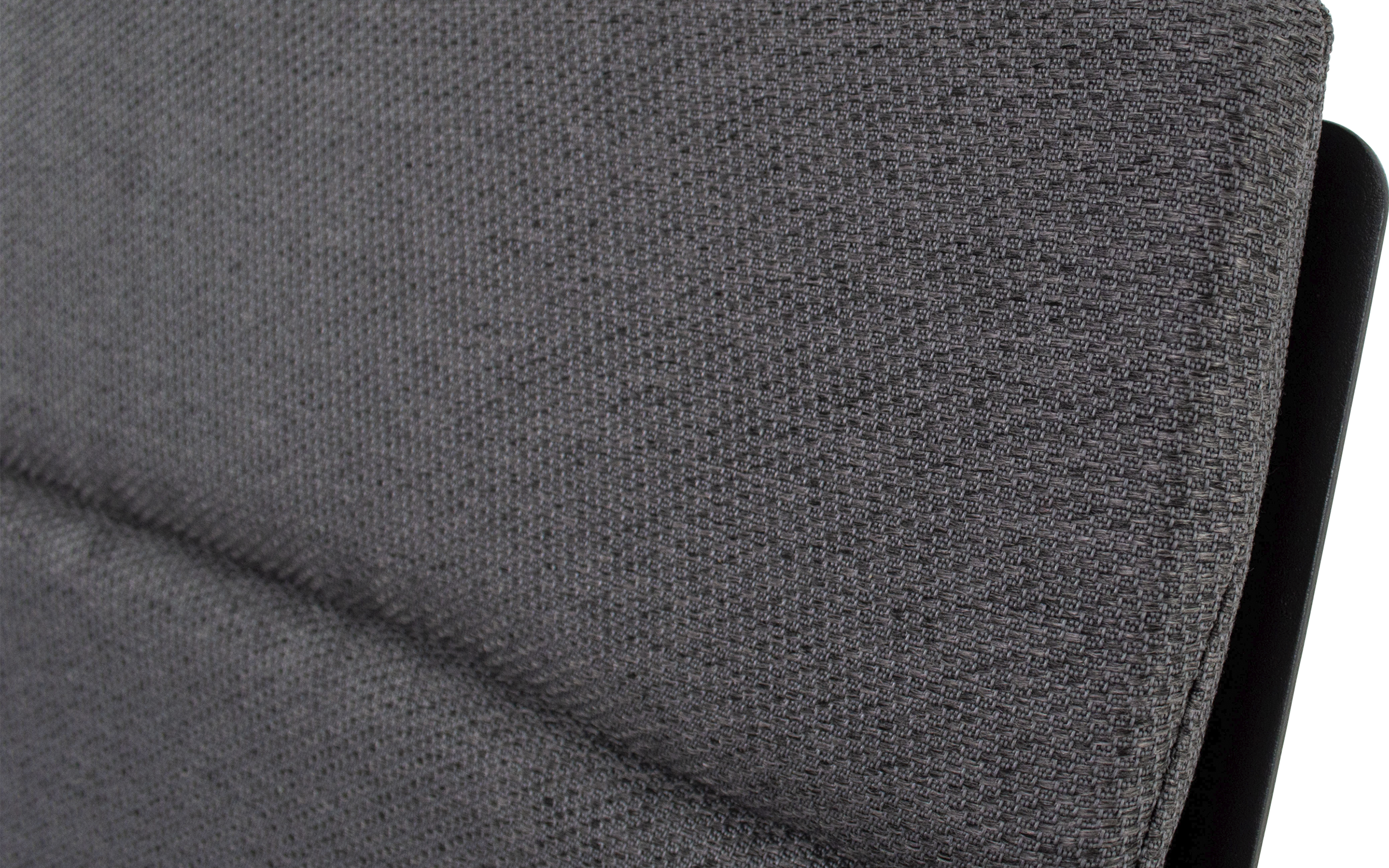 Siedzisko i oparcie z tekstyliny zapewniają komfort użytkowania, a poduszka z materiału olefin 270 g/m² z eleganckimi przeszyciami podnosi wygodę i estetykę.