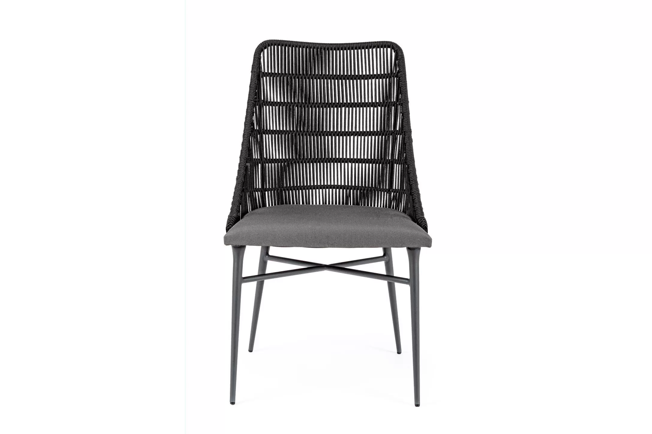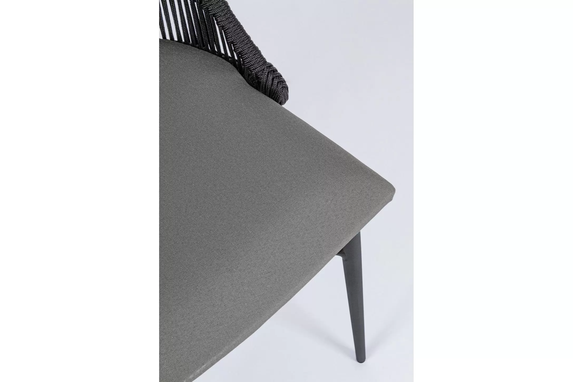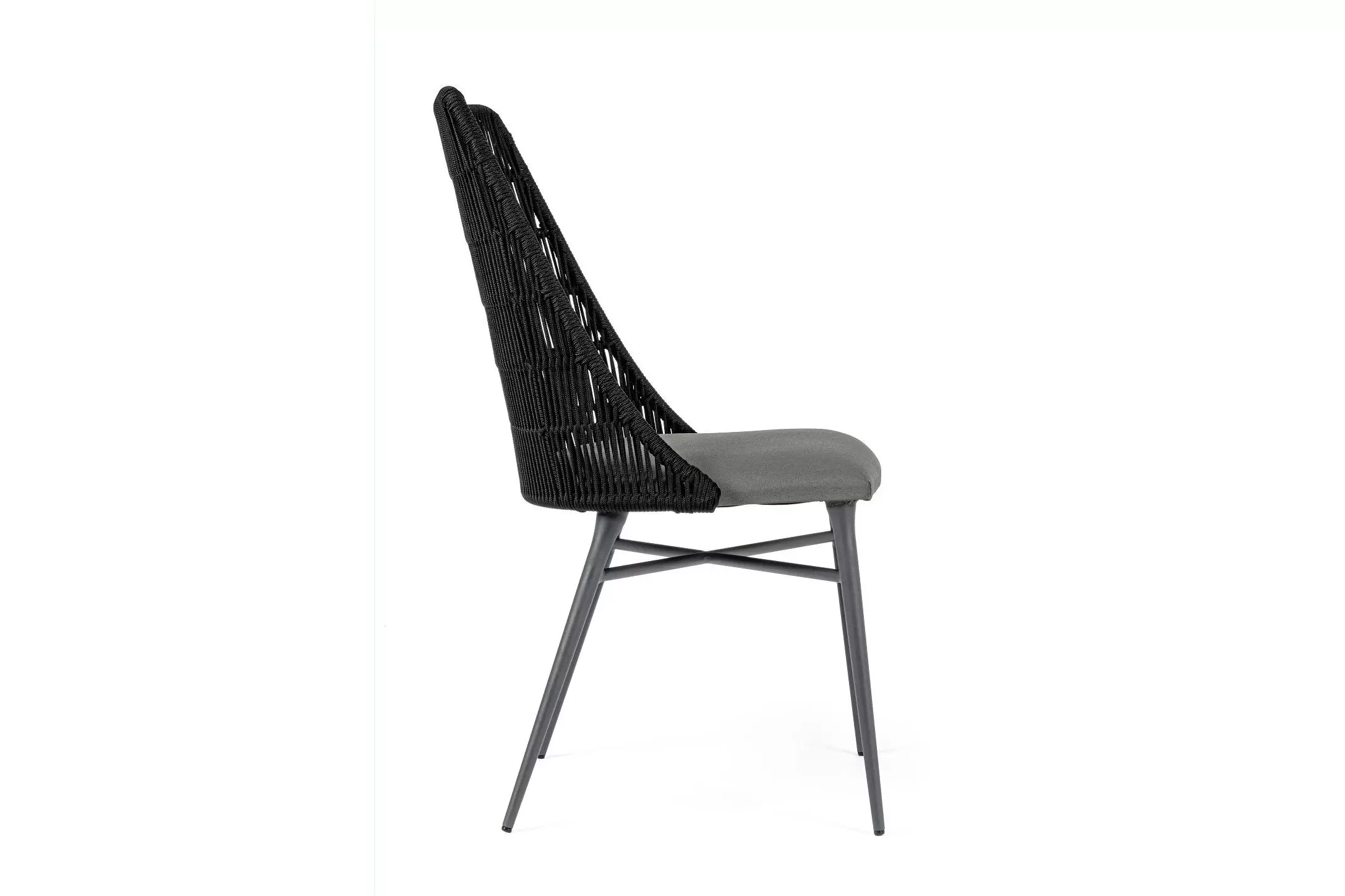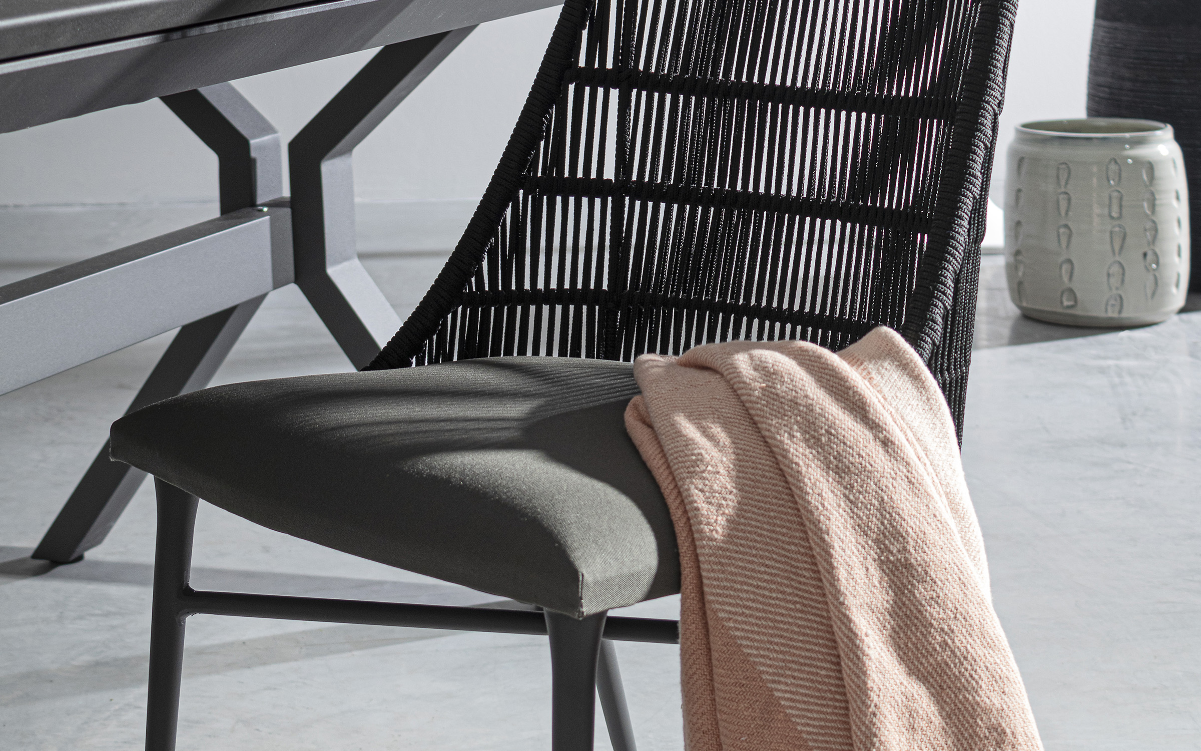 Nowoczesne krzesło do jadalni tarasowej. Kombinacja liny polipropylenowej i aluminium. Poduszka