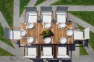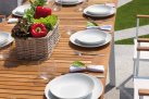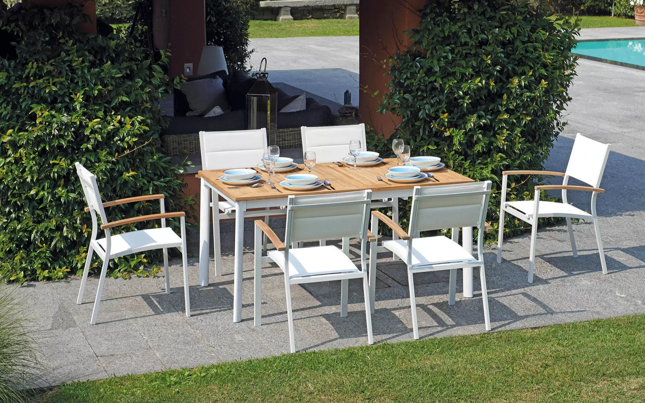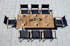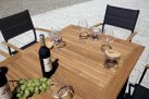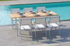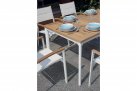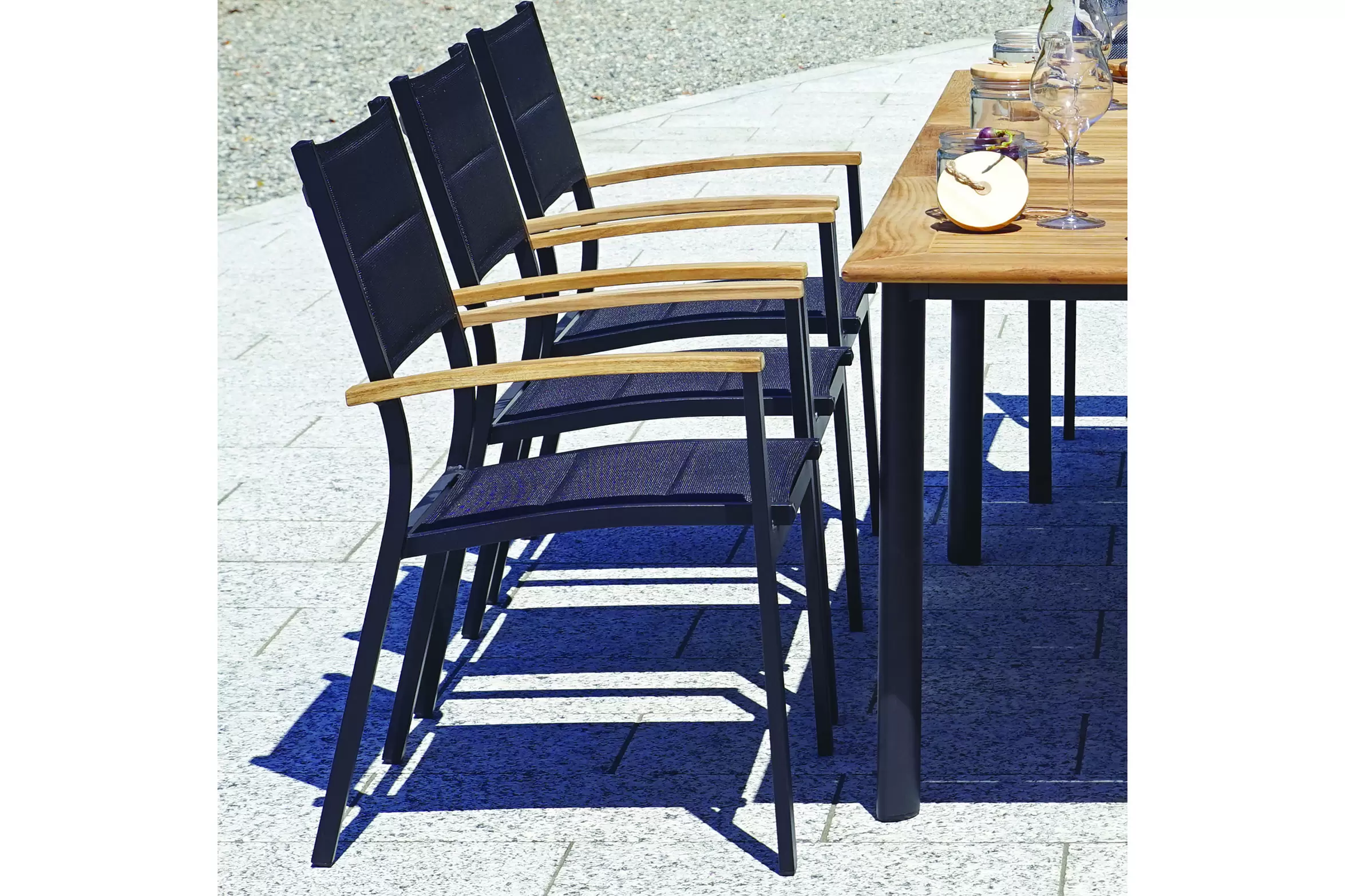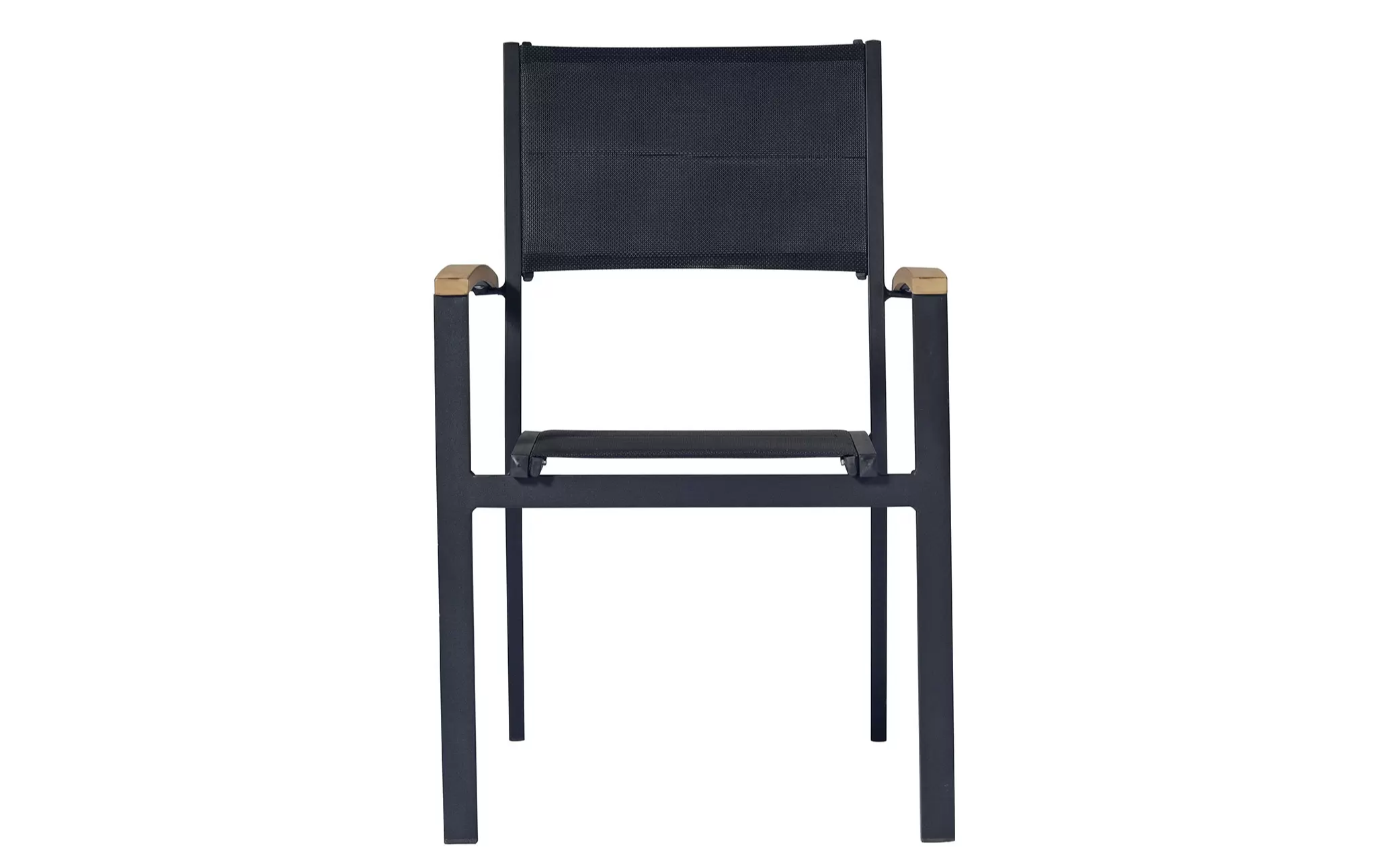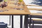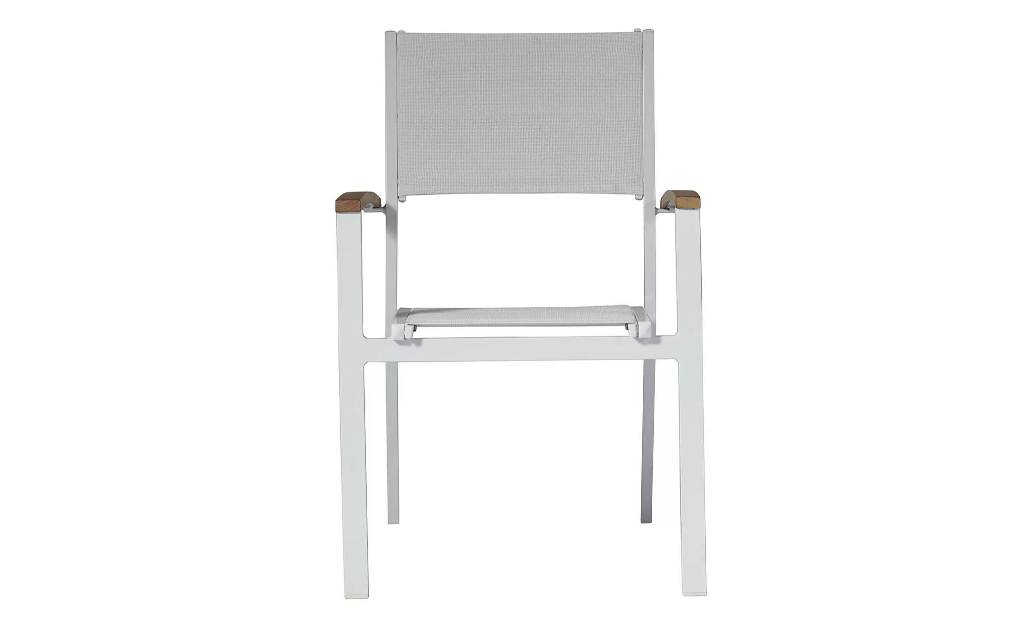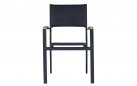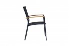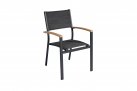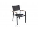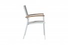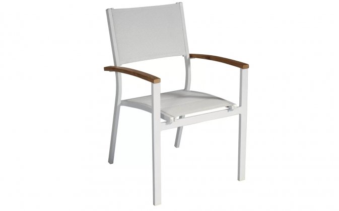 Nowoczesne krzesło ogrodowe wykonane z aluminium malowanego proszkowo, z bracciolami z drewna teak FSC oraz siedziskiem i oparciem z textilene. Konstrukcja sztaplowana umożliwia wygodne przechowywanie. Dostępne w dwóch wersjach kolorystycznych: