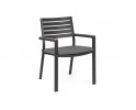 Aluminiowe krzesło ogrodowe z poduszką z podłokietnikami pokrytymi powłoką imitującą drewno.