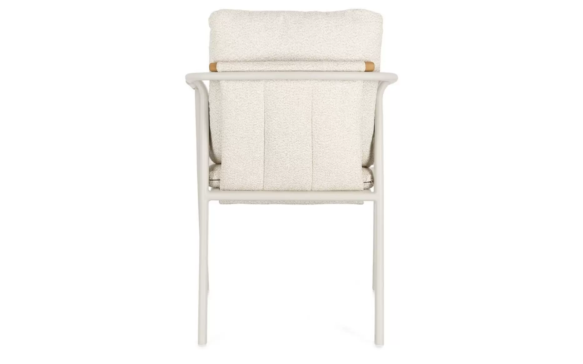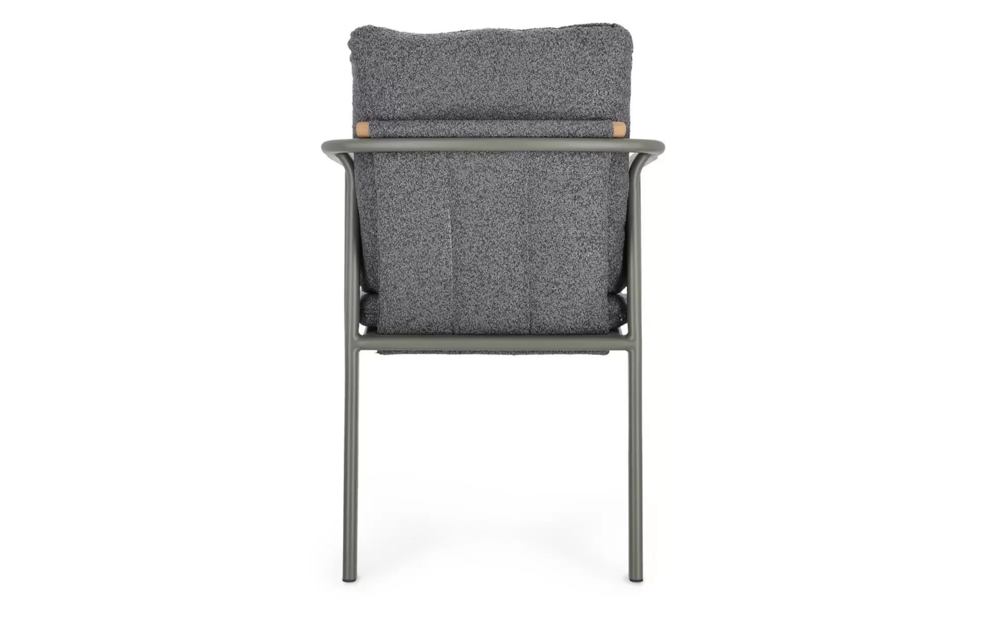 Wysoka kultura użytkowania to także zasługa innowacyjnych tekstyliów. Poduszka siedziska oraz oparcie wykonano z zaawansowanej tkaniny o strukturze bouclé. Ten pętelkowy, trójwymiarowy splot nadaje krzesłu niezwykłą miękkość, jednocześnie zachowując pełną odporność na surowe warunki atmosferyczne. To inwestycja w mebel, który nie tylko doskonale stabilizuje sylwetkę podczas letnich obiadów, ale również zachowuje swój nienaganny wygląd przez lata intensywnej eksploatacji.
