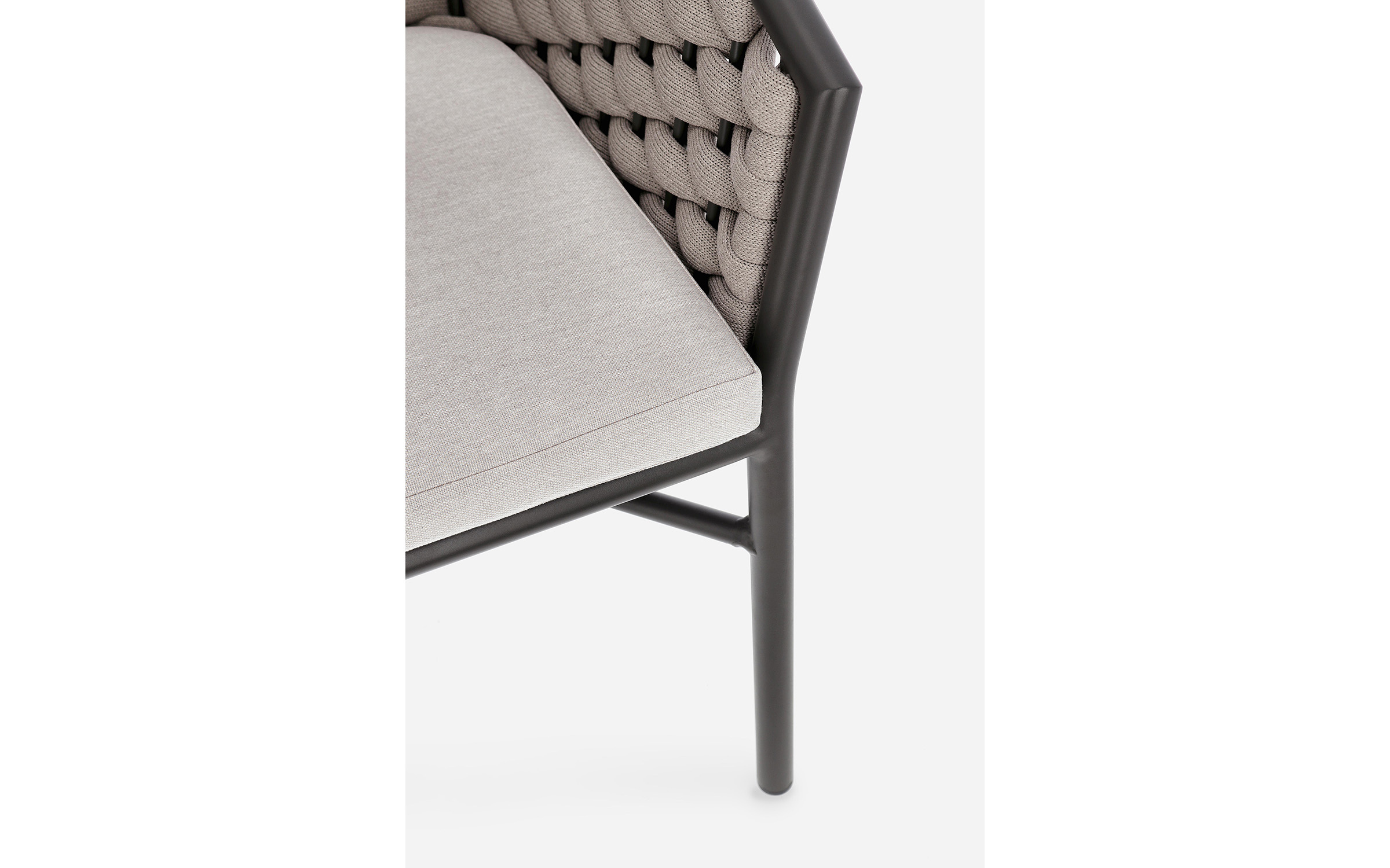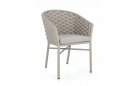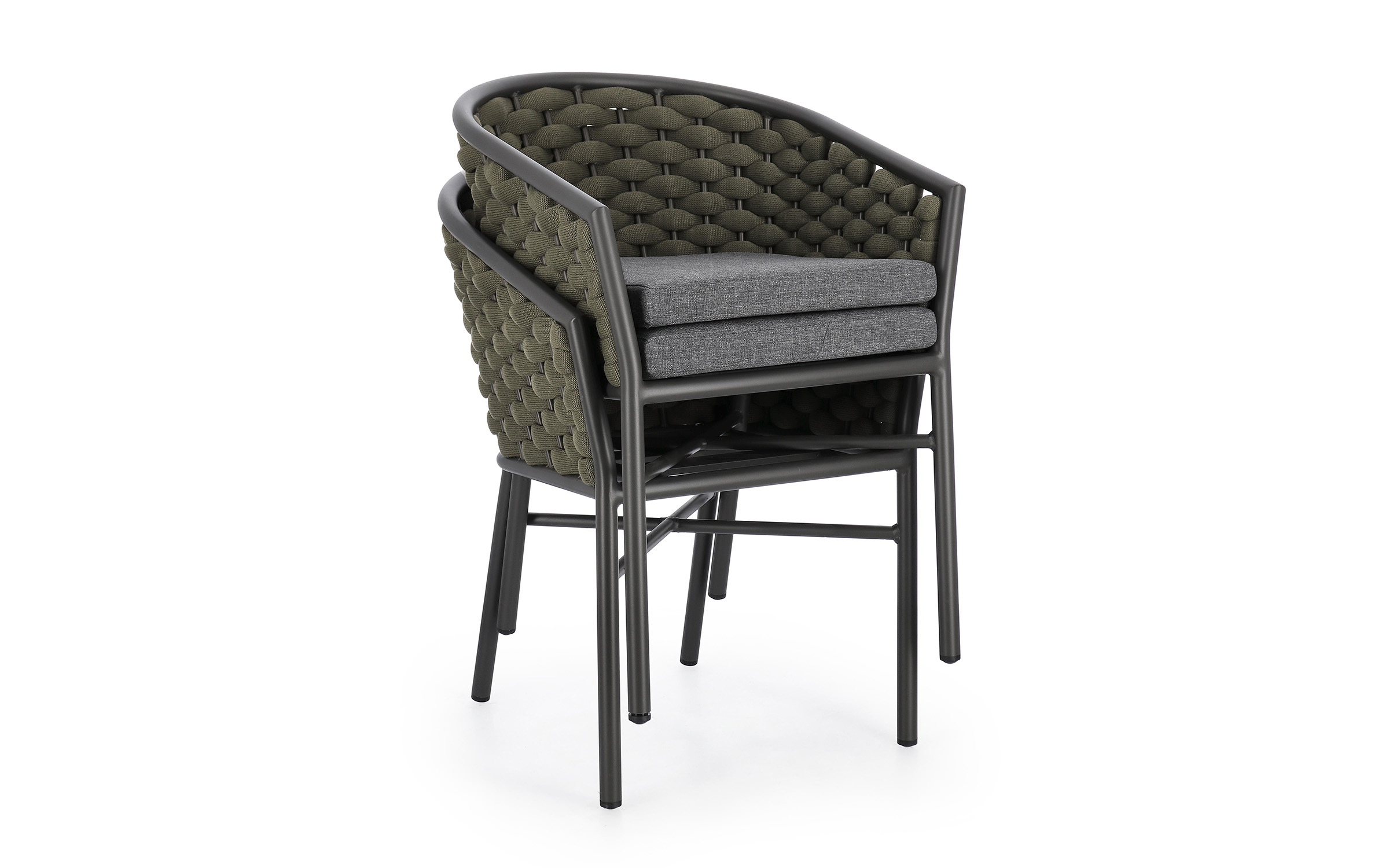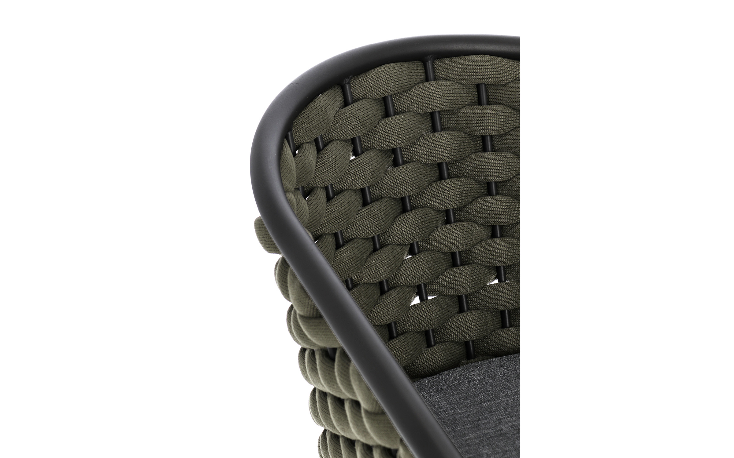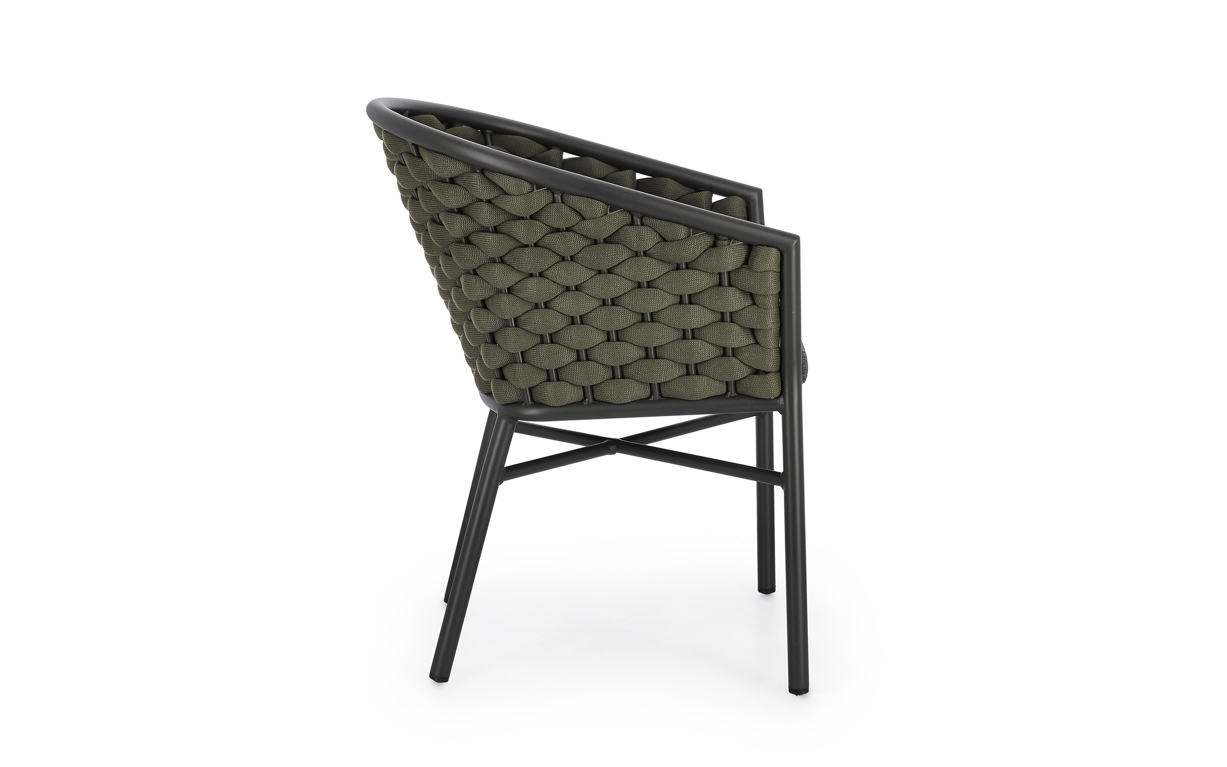 Aluminiowe krzesło ogrodowe o stabilnej konstrukcji z aluminium. Pełne opływowe oparcie z wplecionymi wypukłymi splotami materiału (rękaw z materiału Olefin z wkładem polietylenowym), które dodają mu nowoczesności.