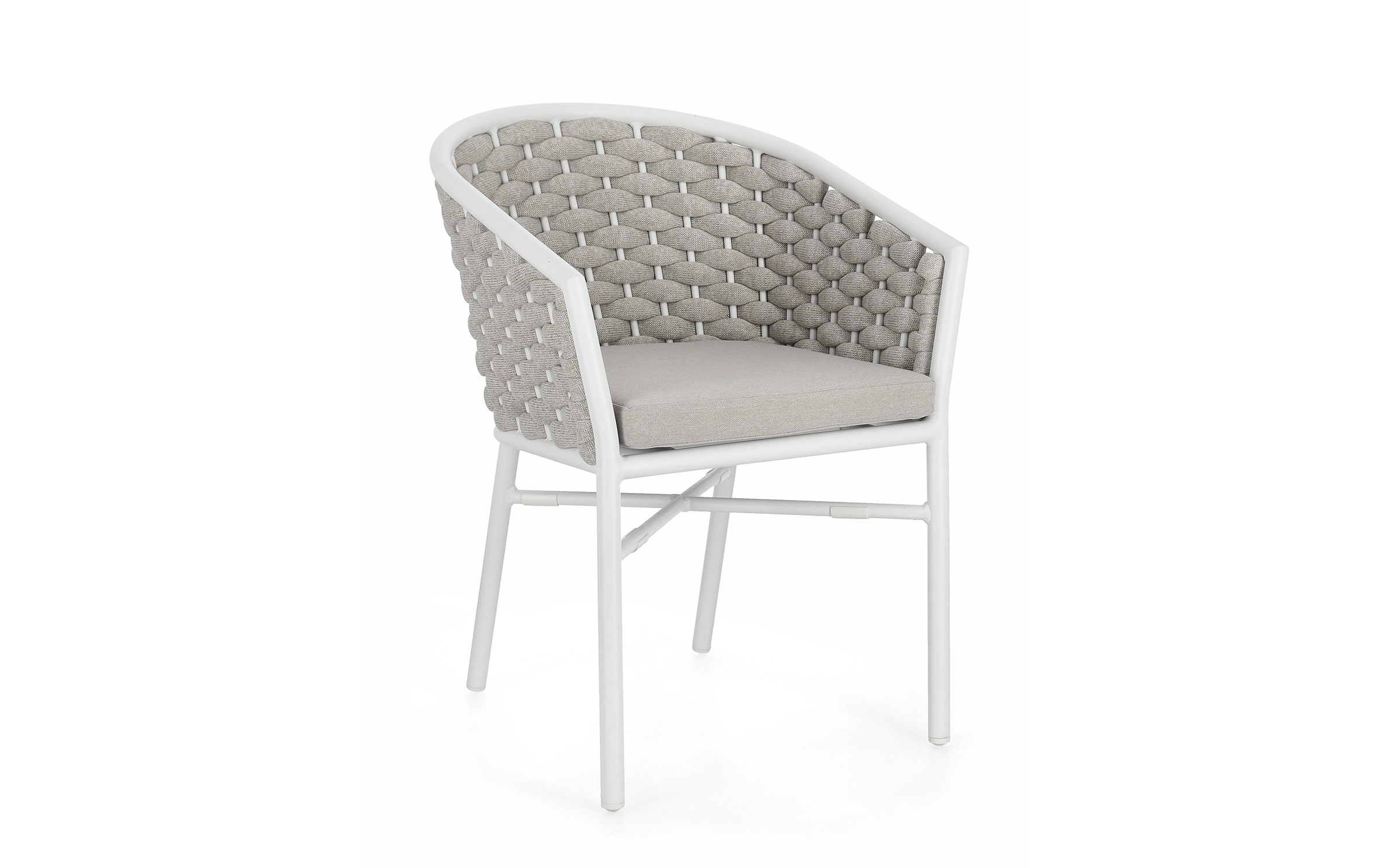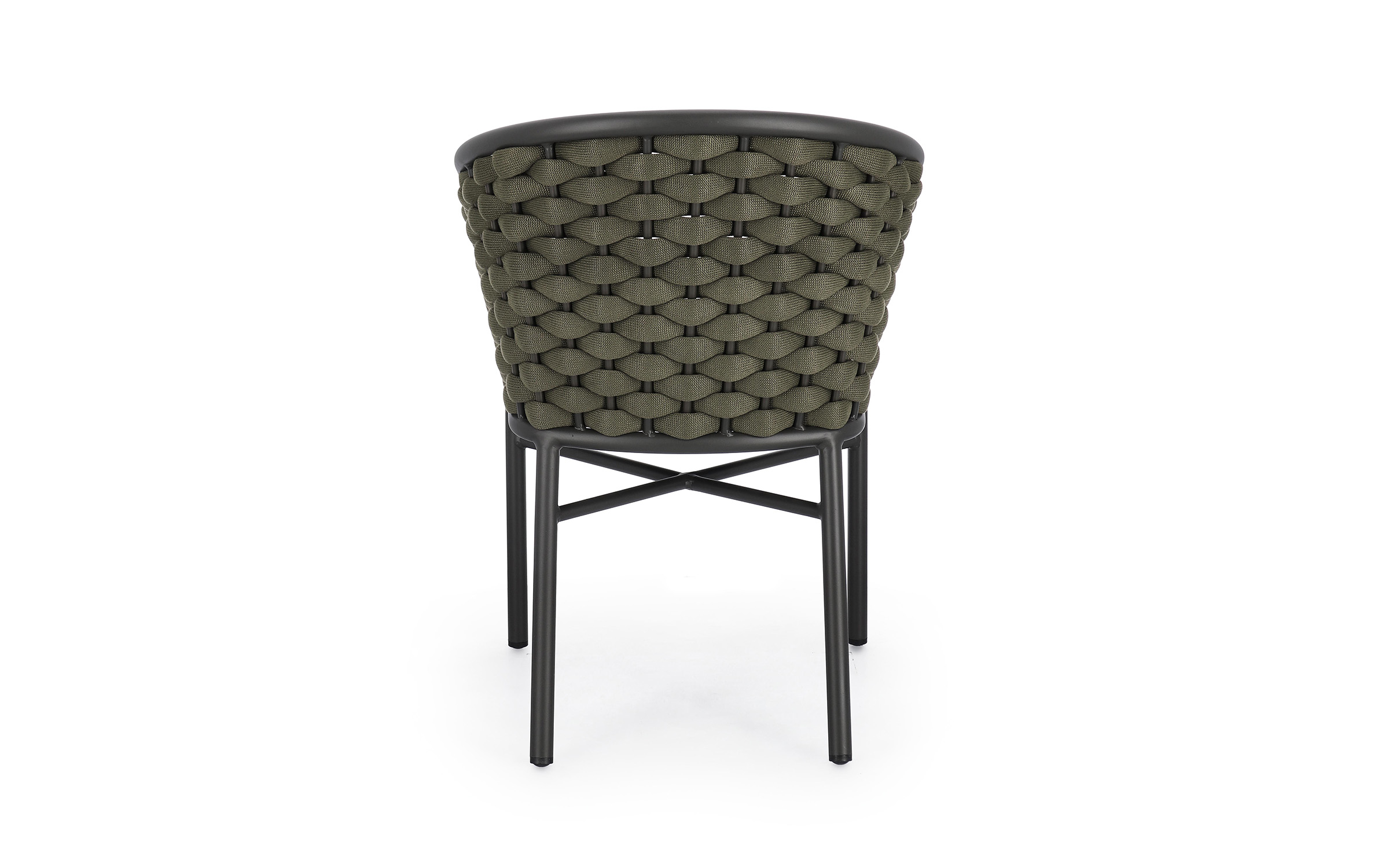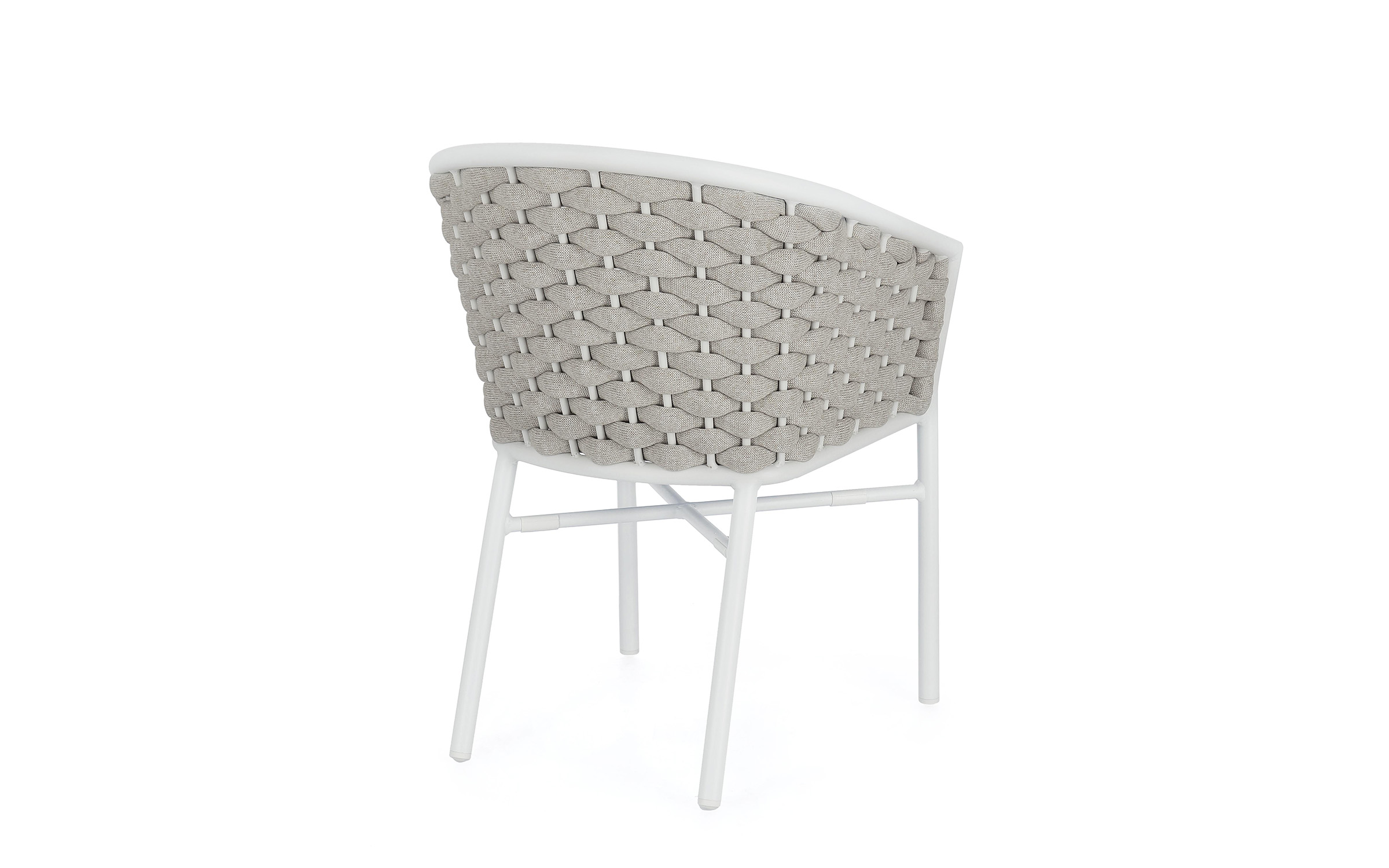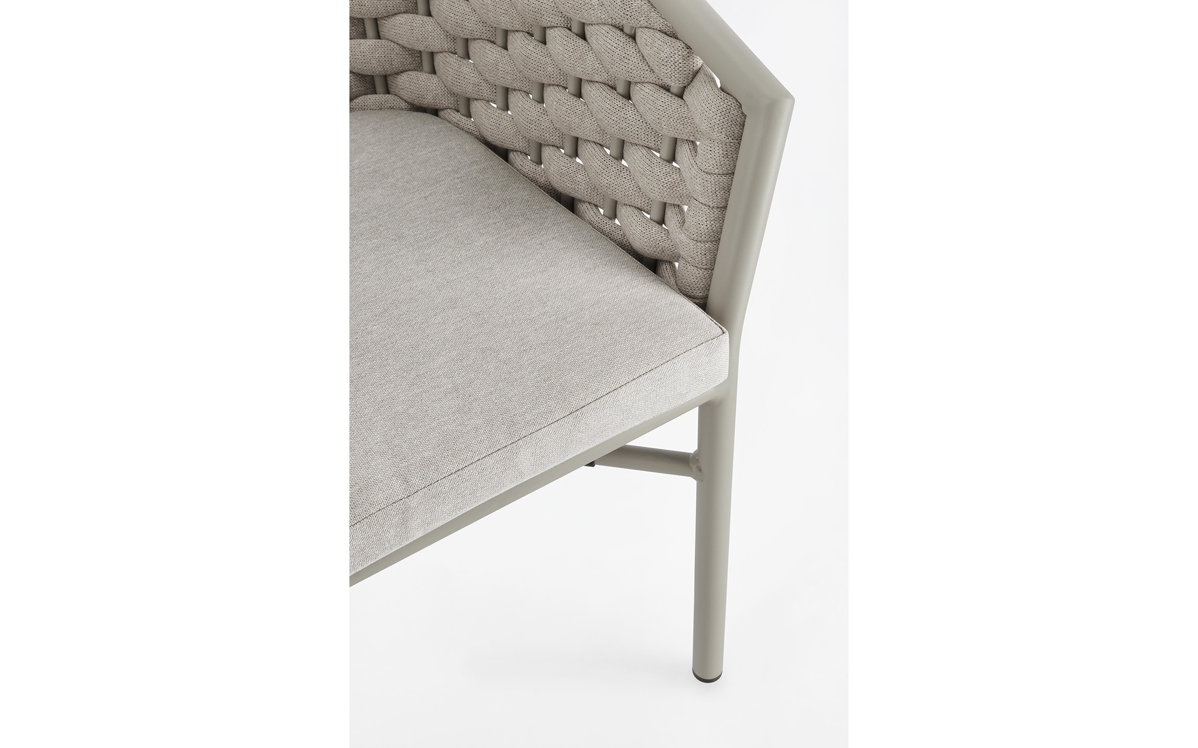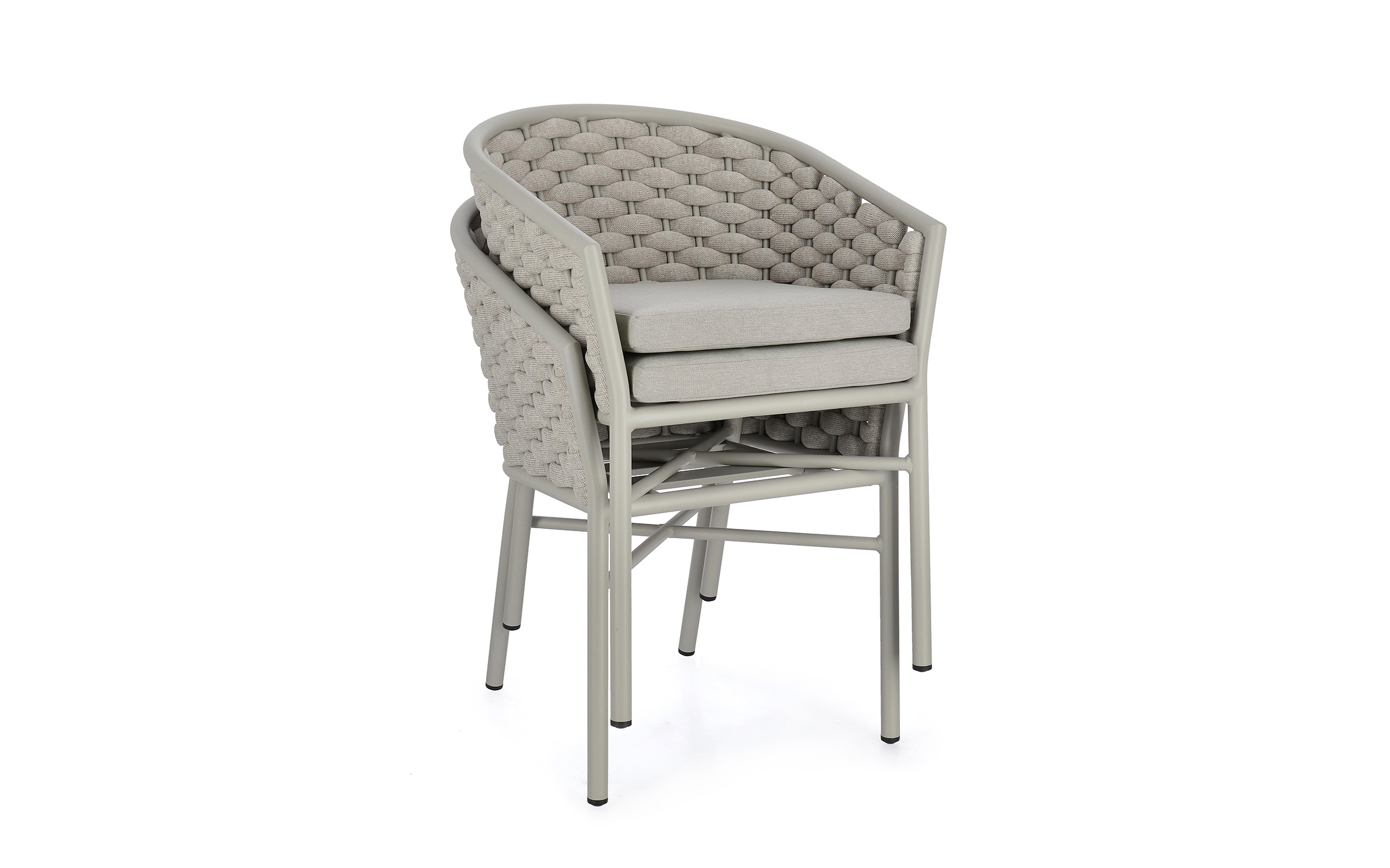 Aluminiowe krzesło ogrodowe o stabilnej konstrukcji z aluminium. Pełne opływowe oparcie z wplecionymi wypukłymi splotami materiału (rękaw z materiału Olefin z wkładem polietylenowym), które dodają mu nowoczesności.