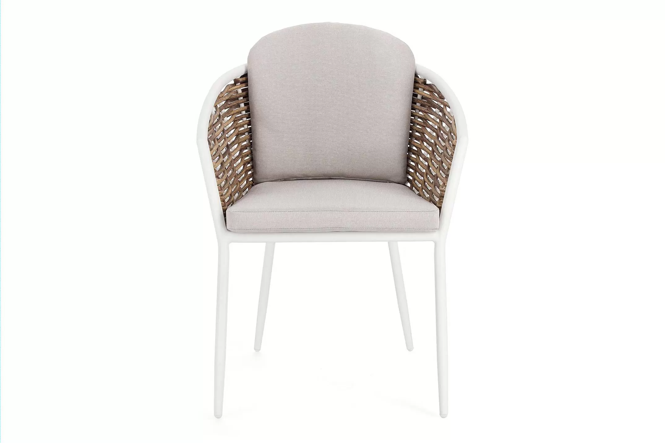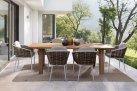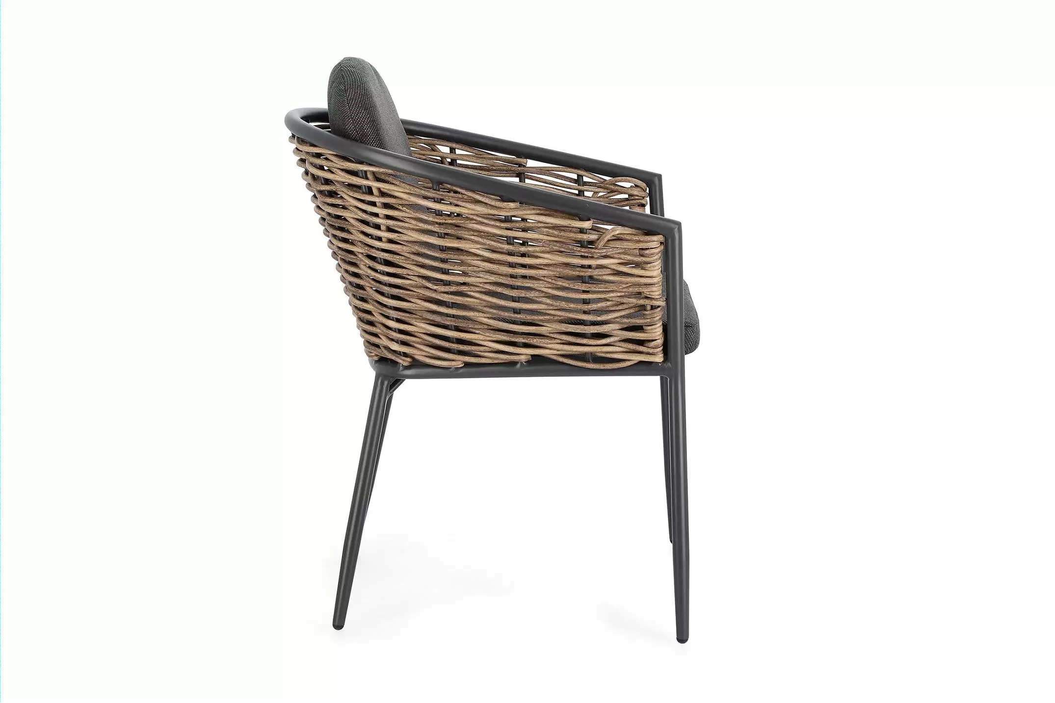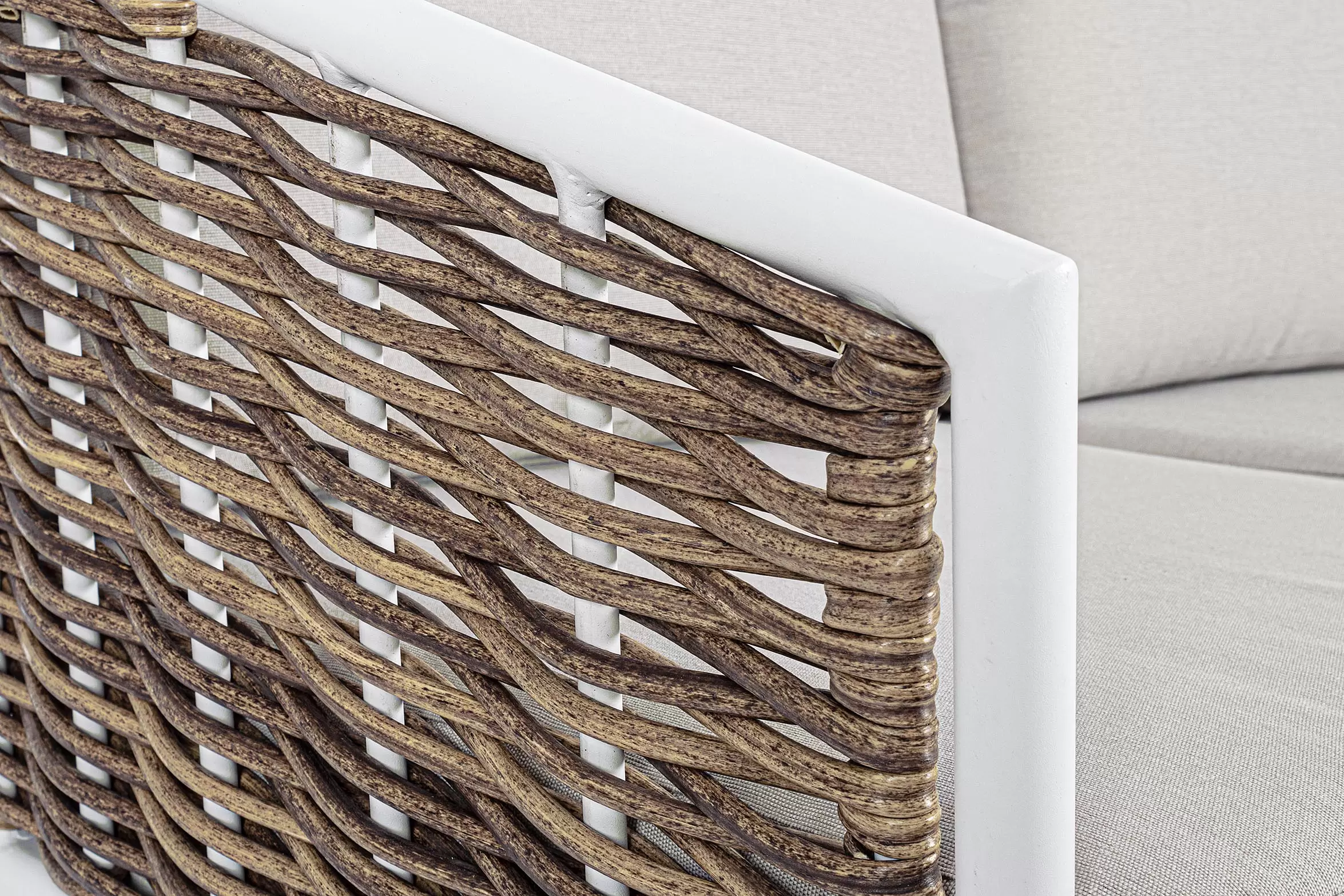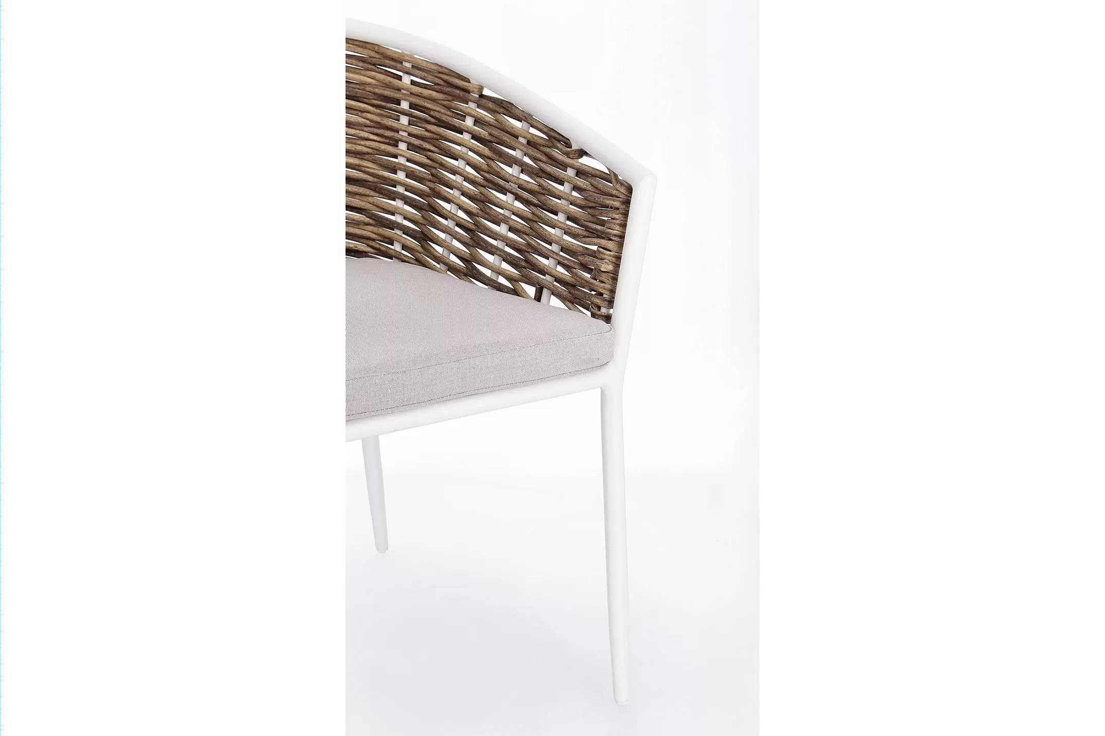 Aluminiowe krzesło pasujące do kolekcji mebli ogrodowych MARIBELA z wyplatanymi bokami technorattanem imitującym naturalne włókno.