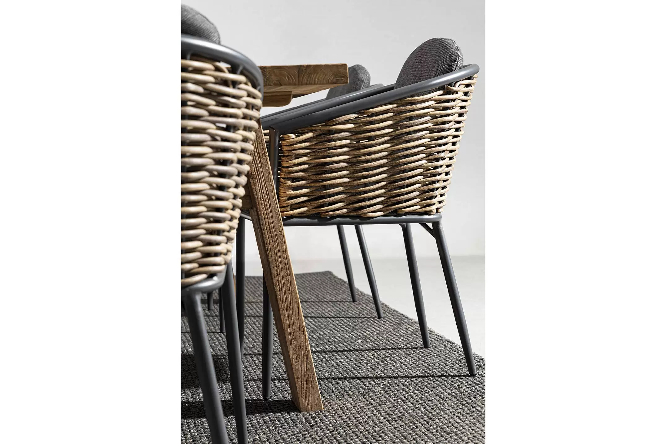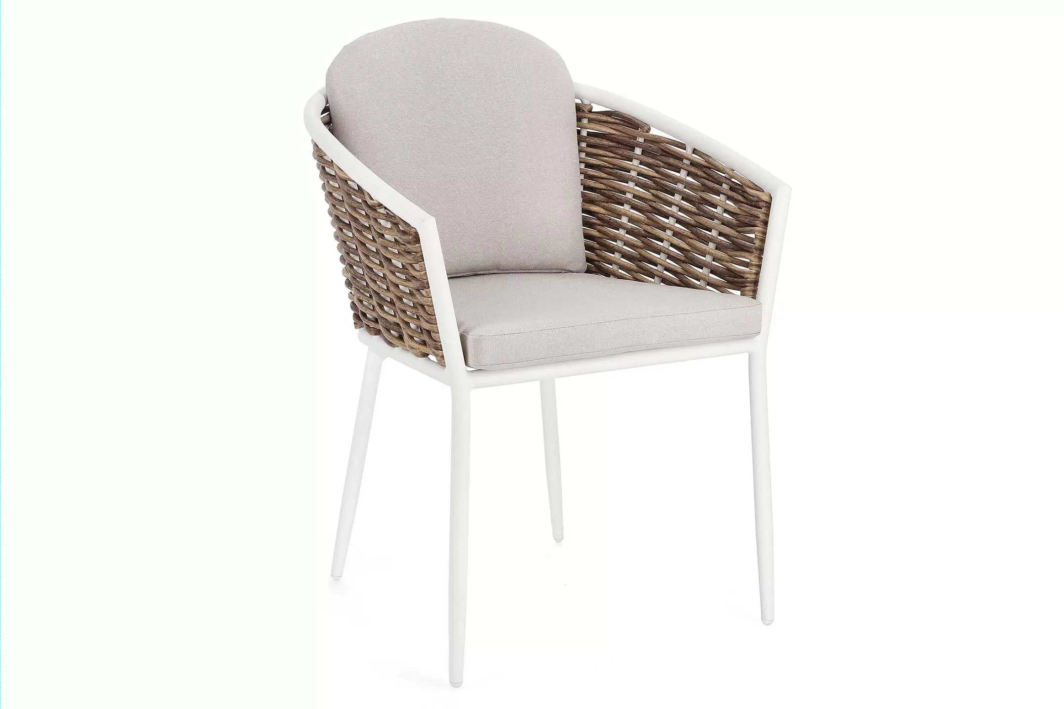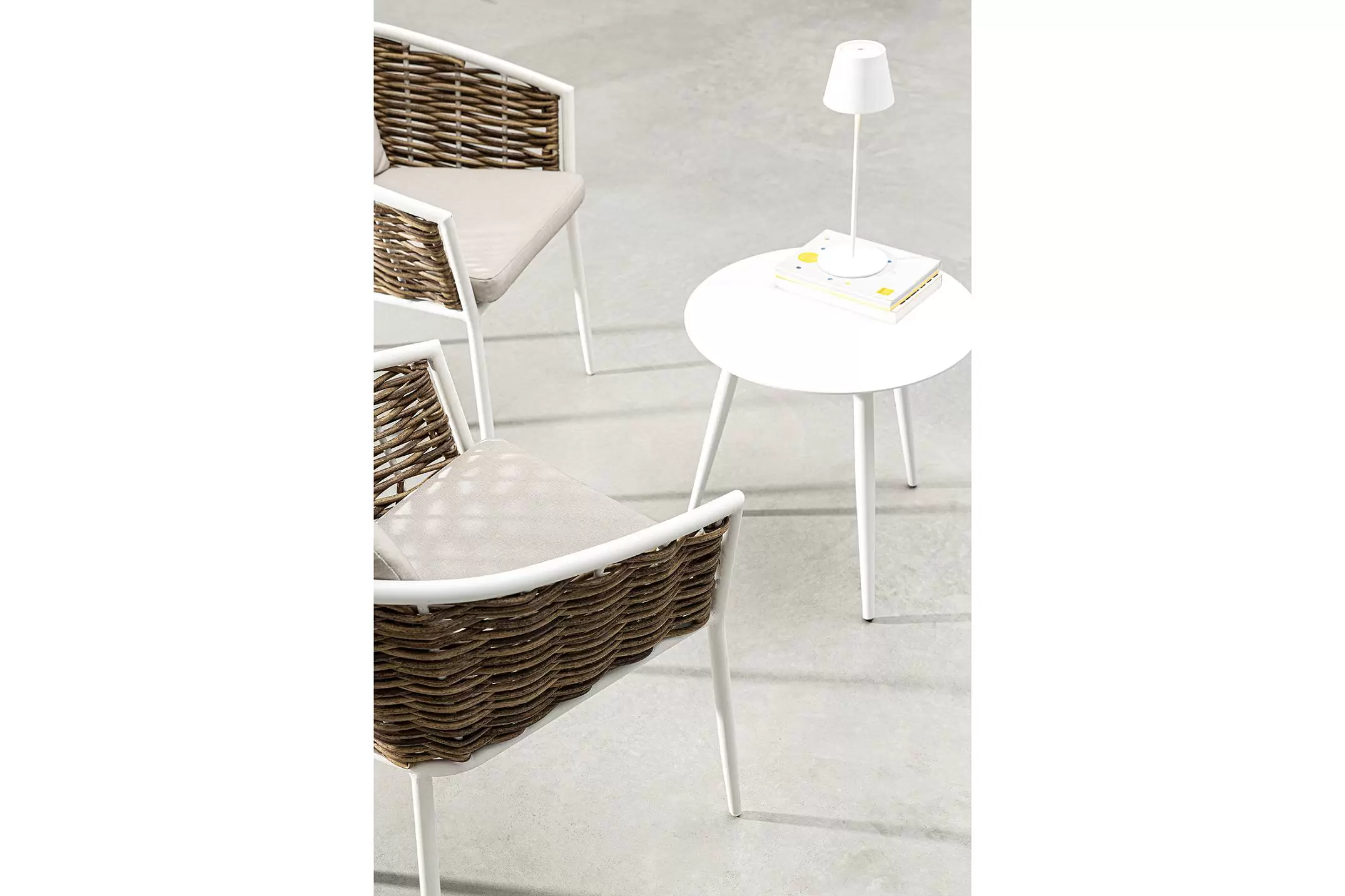 Meble wyposażone w poduszki wodoodporne ze zdejmowanymi poszewkami z materiału Olefin. Krzesło można sztaplować.