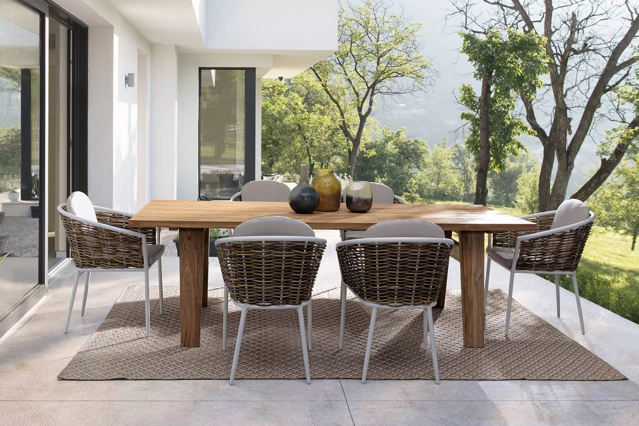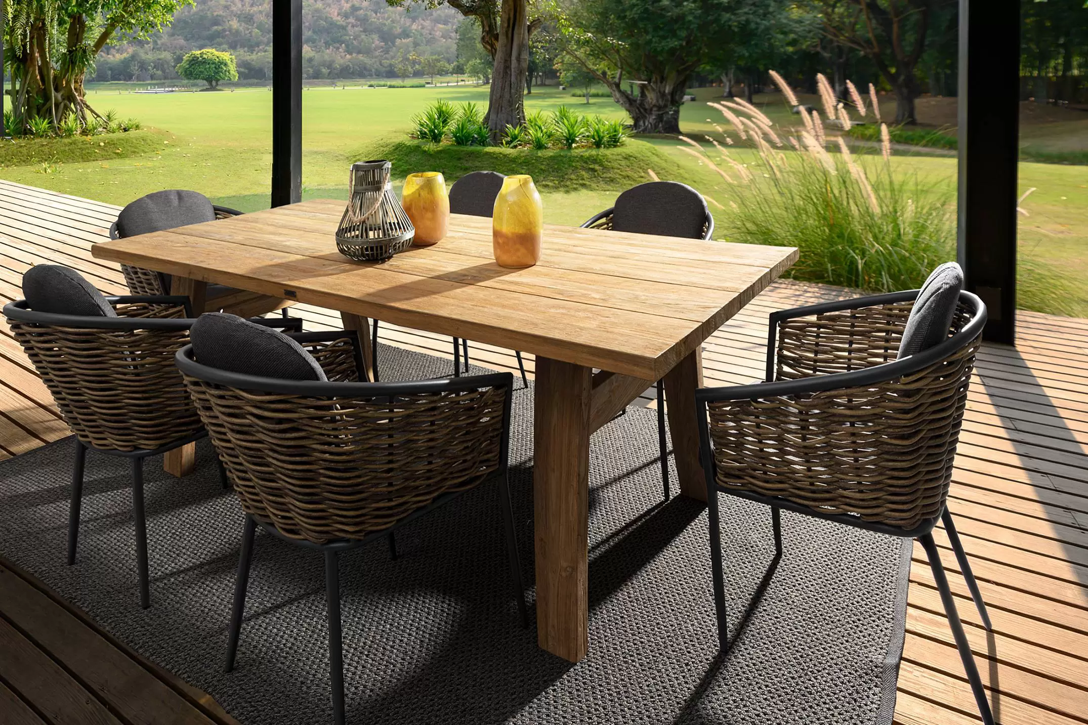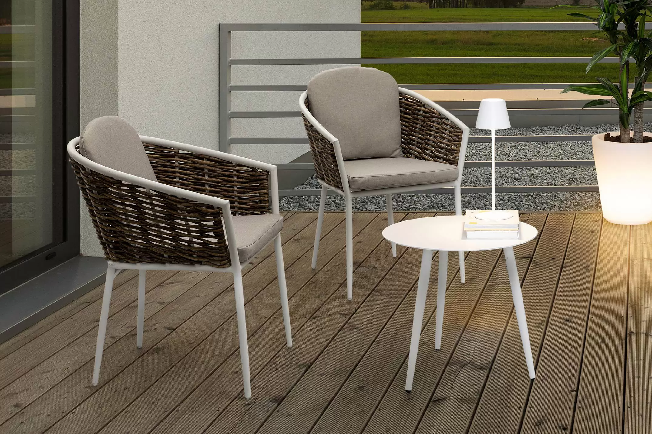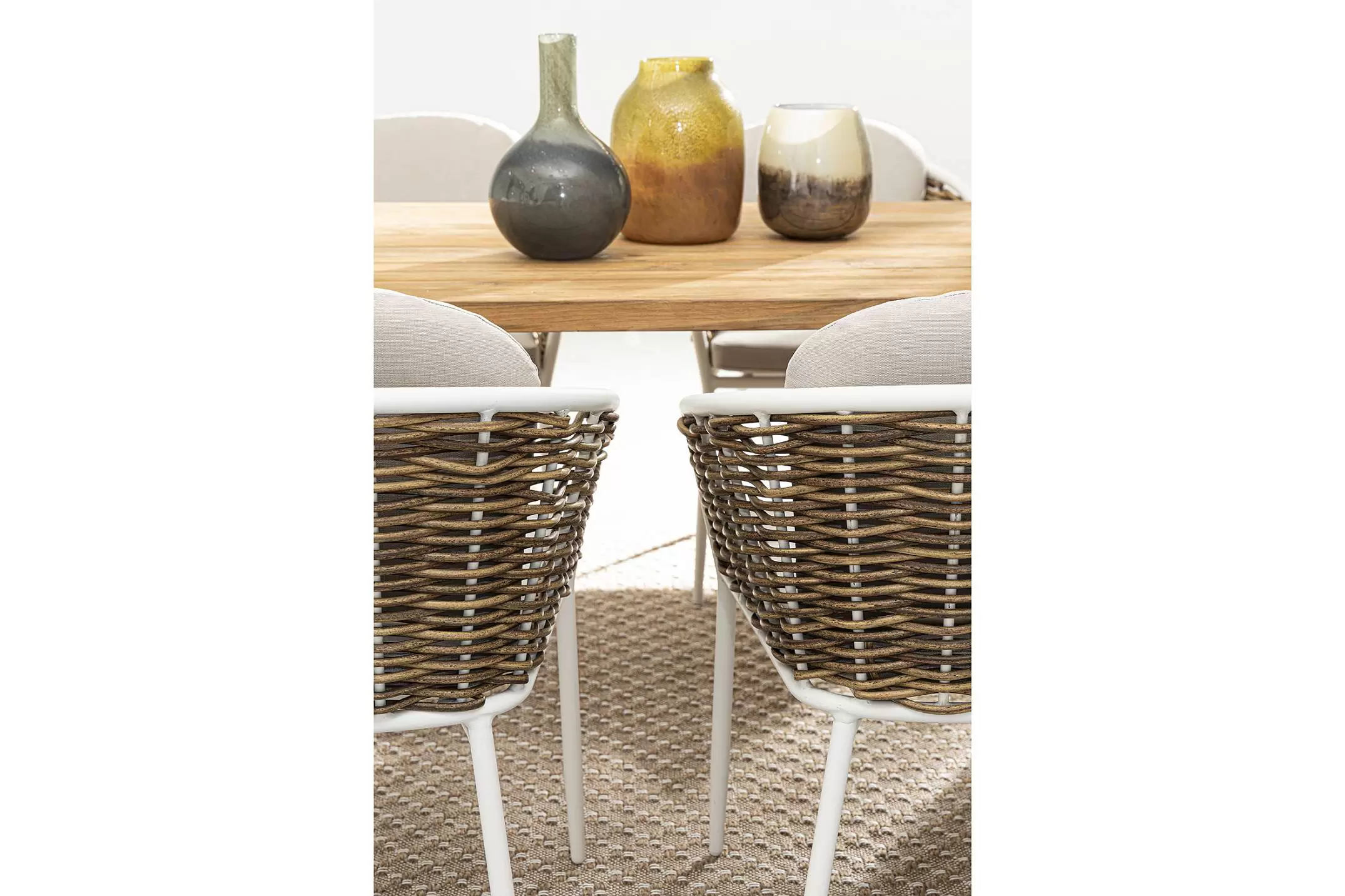 Meble wyposażone w poduszki wodoodporne ze zdejmowanymi poszewkami z materiału Olefin. Krzesło można sztaplować.