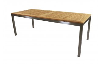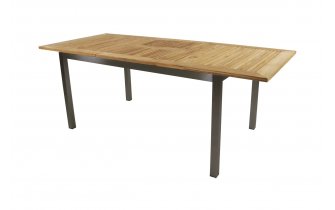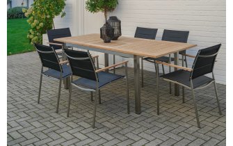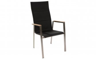Nowoczesne krzesło ogrodowe wykonane ze stali nierdzewnej z teakowymi podłokietnikami i siedziskiem/oparciem z gęstej podwójnej tekstyliny z wszytą pomiędzy warstwy gąbką szybkoschnącą 5 mm.