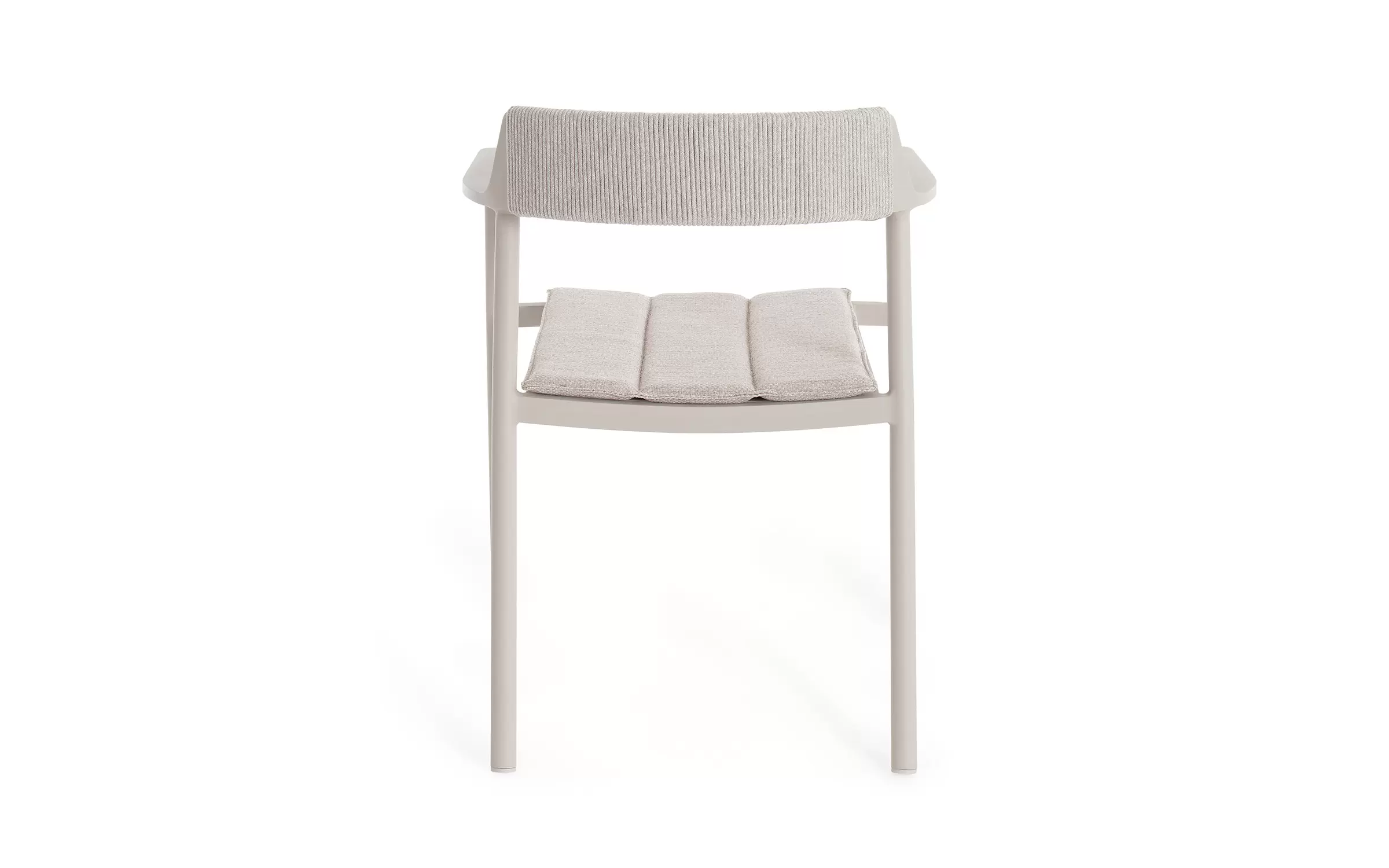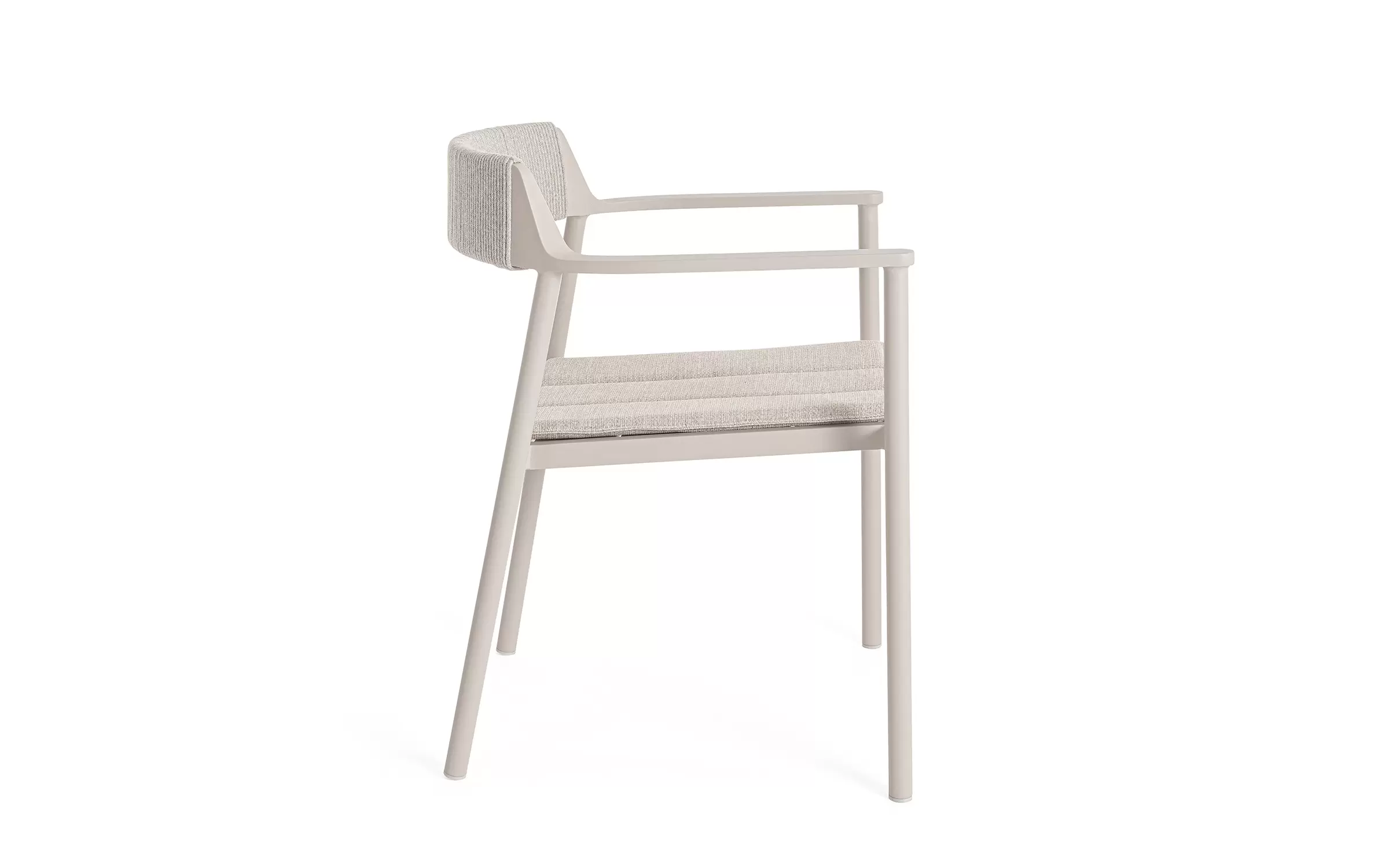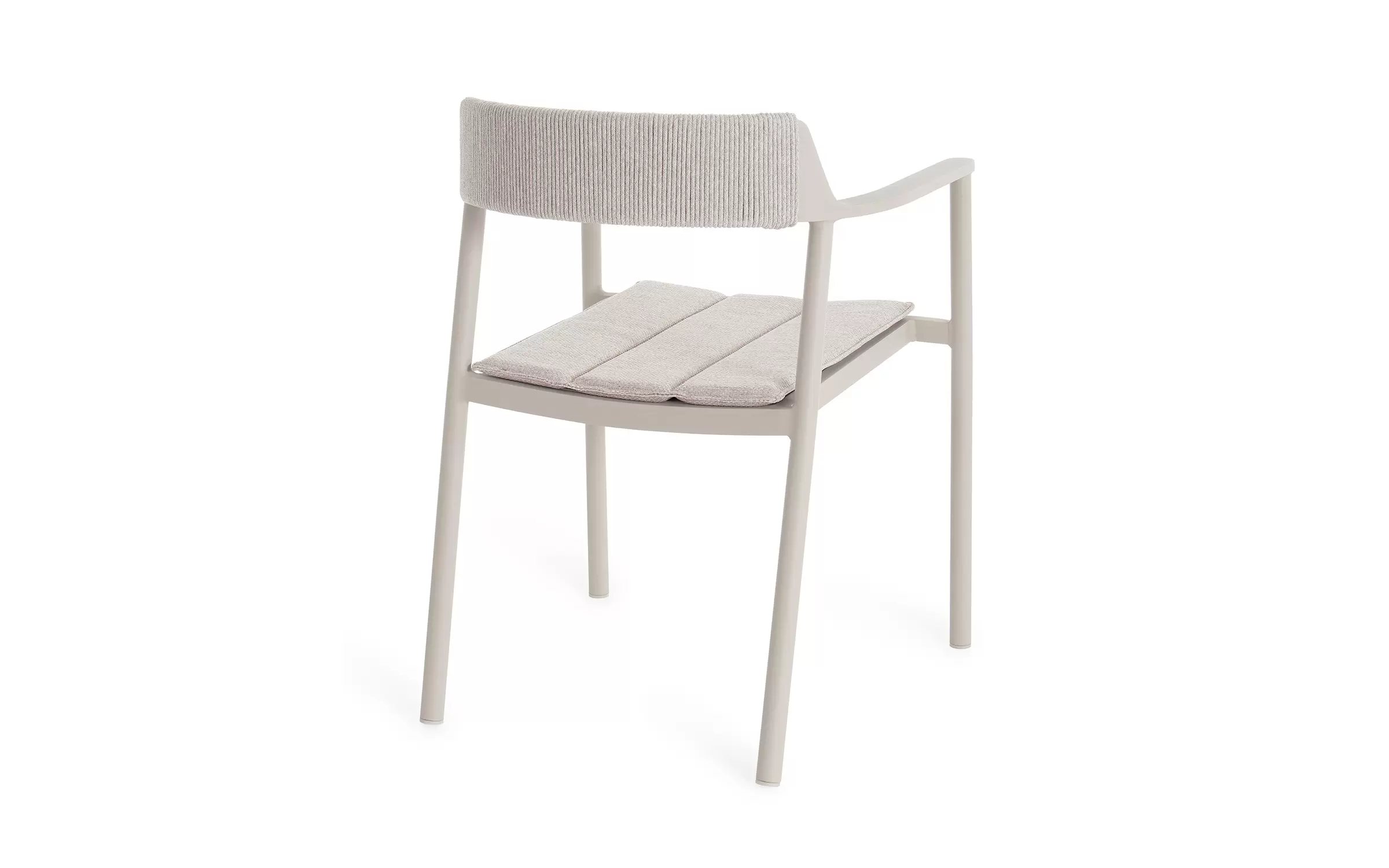 Krzesło do ogrodowej jadalni wykonane z aluminium w kolorze beżowym z oparciem oplecionym liną z poduszką na siedzisku.