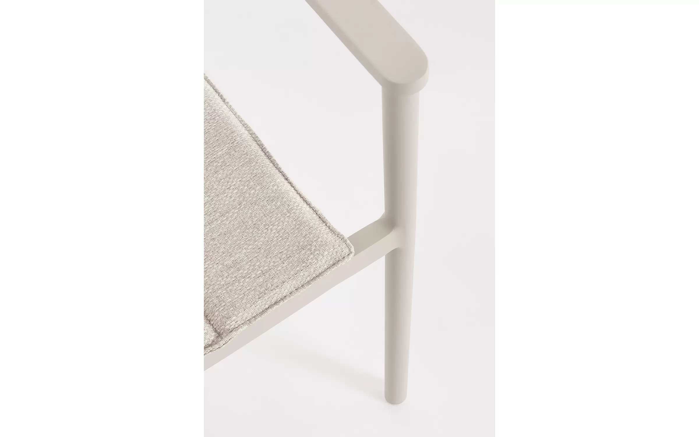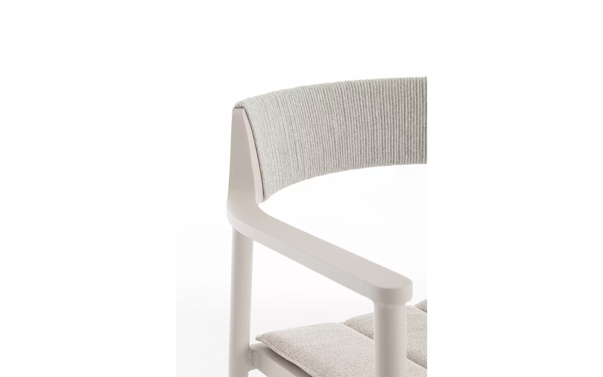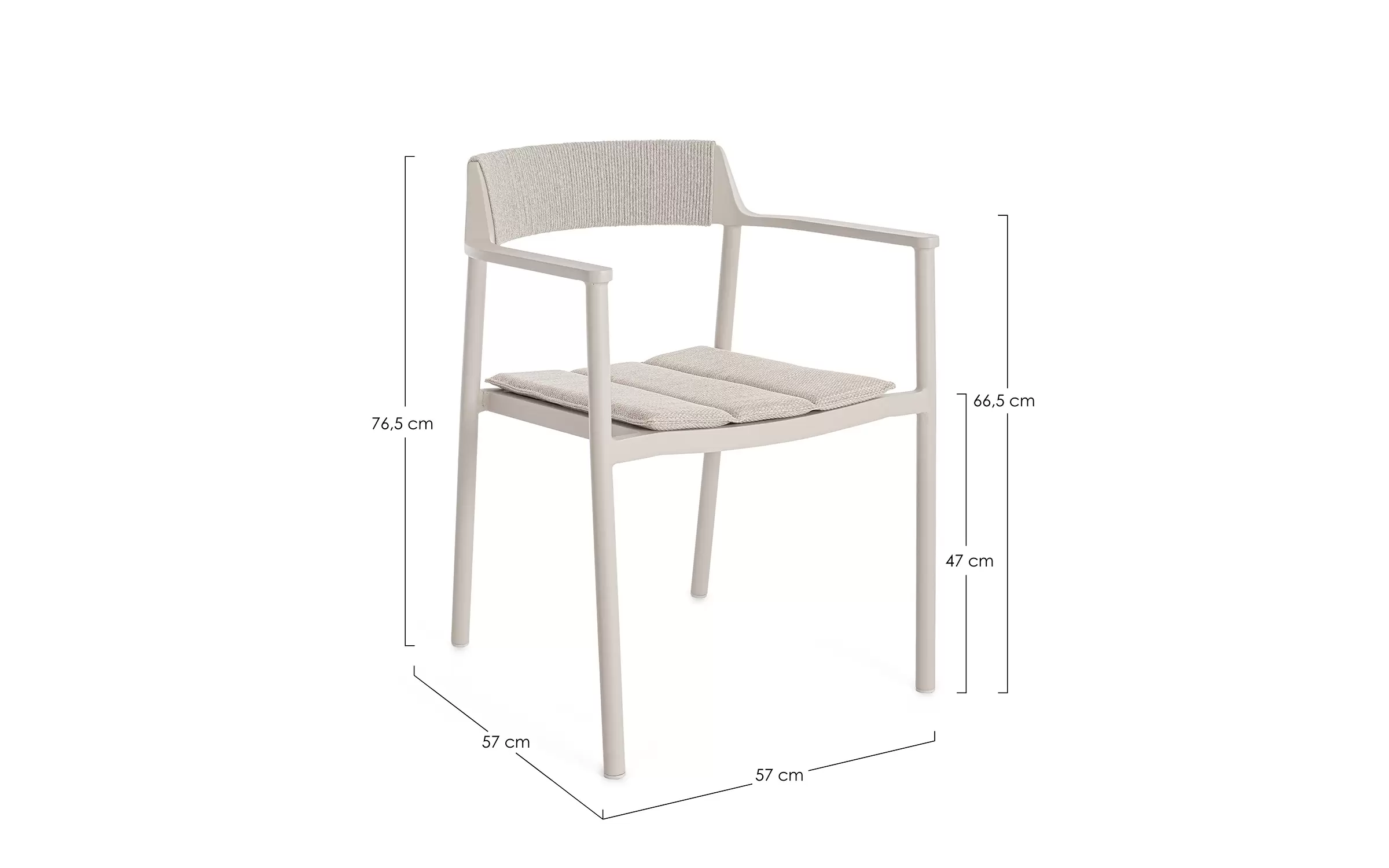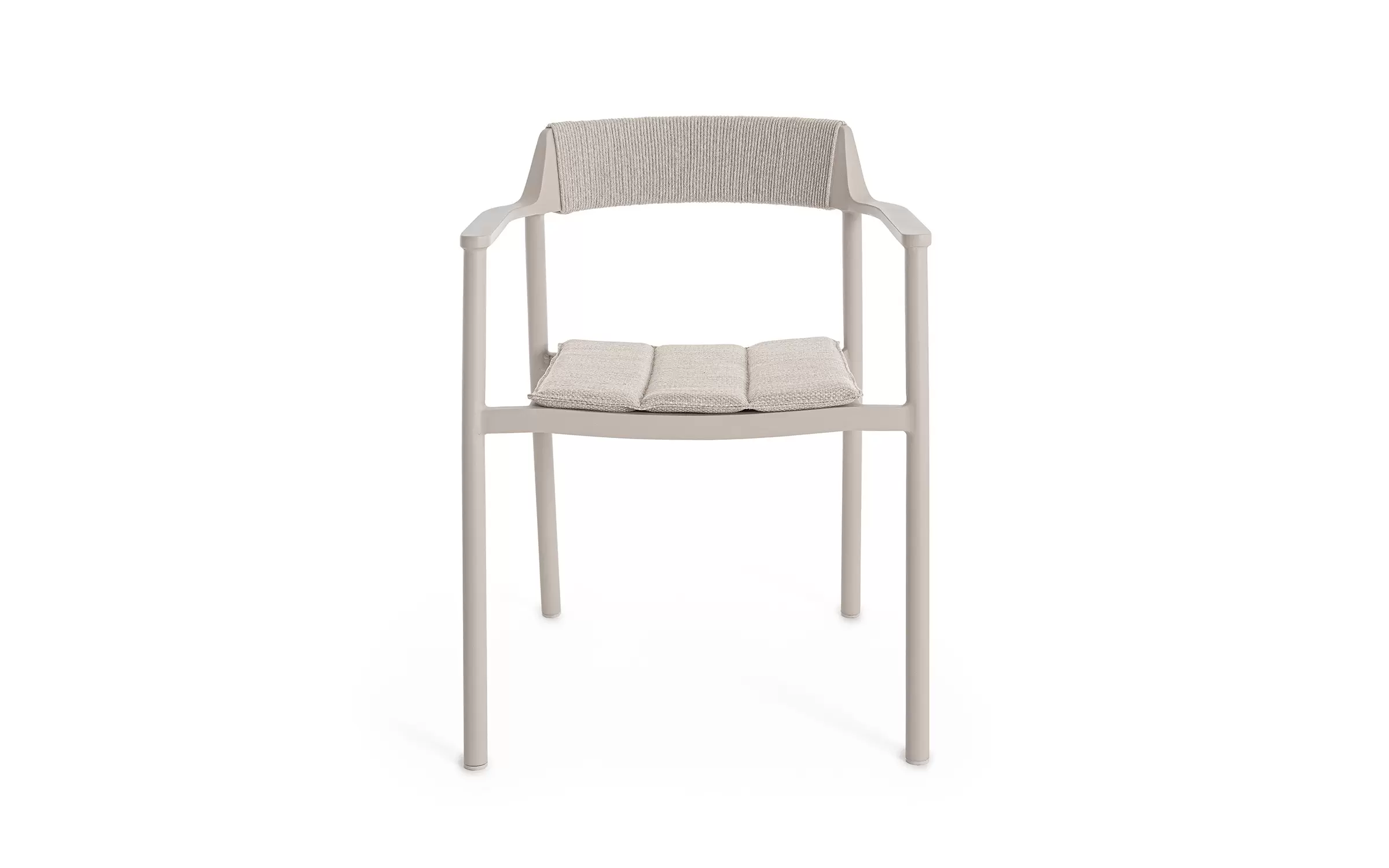 Krzesło do ogrodowej jadalni wykonane z aluminium w kolorze beżowym z oparciem oplecionym liną z poduszką na siedzisku.
