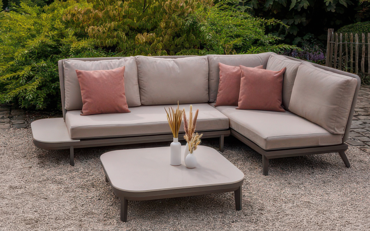 ALPES SMALL to kompaktowy narożnik od Life Outdoor Living, stworzony z myślą o mniejszych tarasach, które wymagają funkcjonalnego zagospodarowania. Meble utrzymano w kolorystyce taupe – stonowanym połączeniu beżu i szarości – co w zestawieniu z jasnymi poduszkami tworzy spokojną, neutralną paletę barw, łatwą do dopasowania do otoczenia.