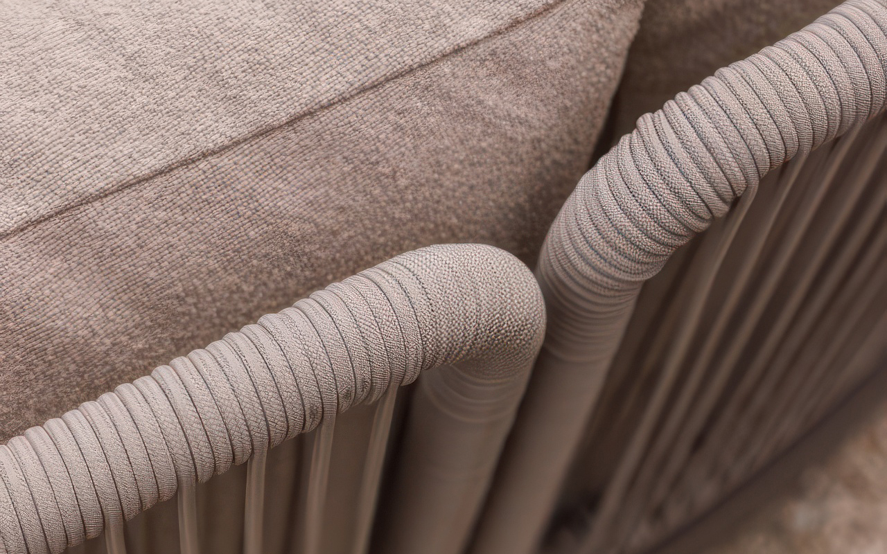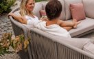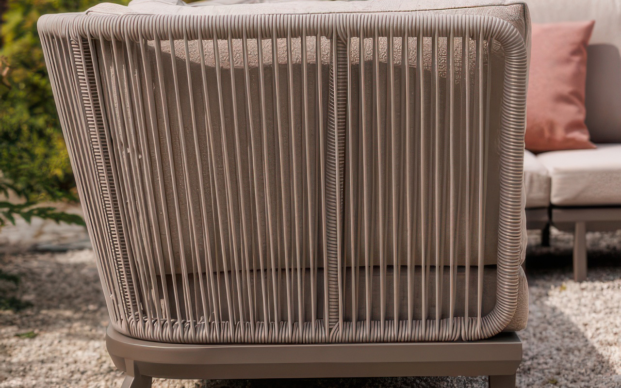 Charakterystycznym detalem oparć jest plecionka z liny syntetycznej. Takie wykończenie nie tylko urozmaica wizualnie formę mebla, ale też nadaje mu nieco bardziej naturalnego wyglądu. W komplecie znajduje się również stolik kawowy, którego blat wykonano z ceramiki – materiału o wysokiej twardości, który nie chłonie zabrudzeń i jest odporny na zarysowania czy wysoką temperaturę.