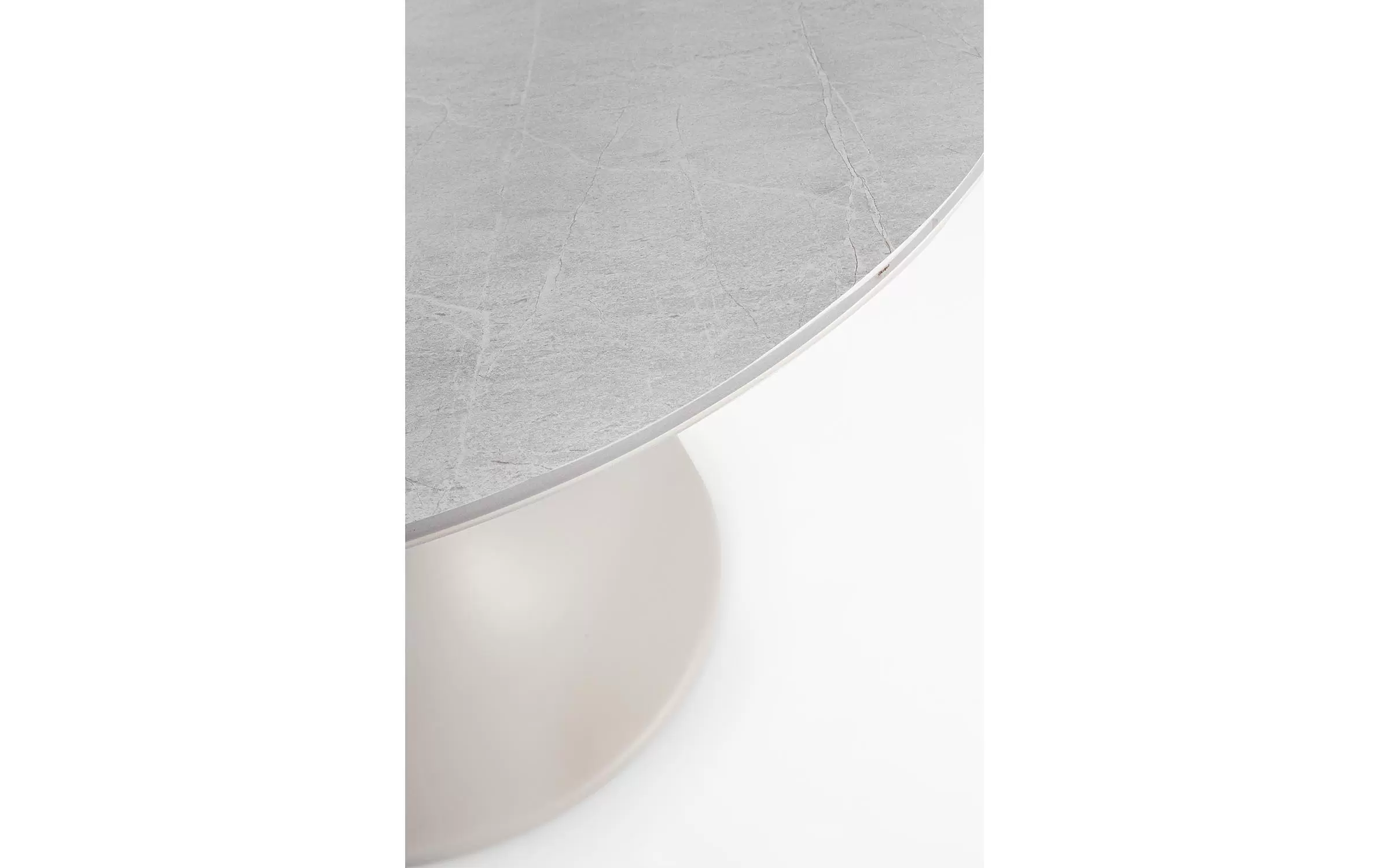 Okrągły stół na jednej stylizowanej nodze wykonanej z aluminium przykryty nowoczesnym blatem z kamienia spiekanego. Grubość blatu 11 mm