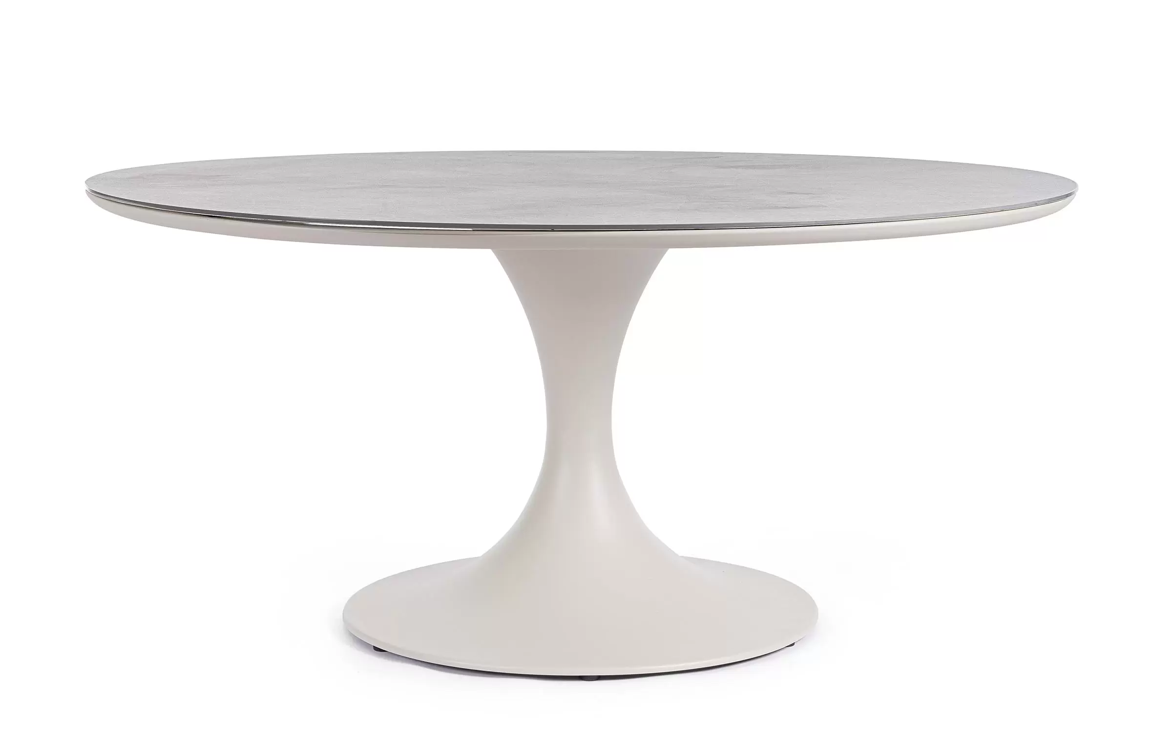 Beżowy okrągły stół na taras aluminiowy ARNOLD śr. 158 cm blat kamienny