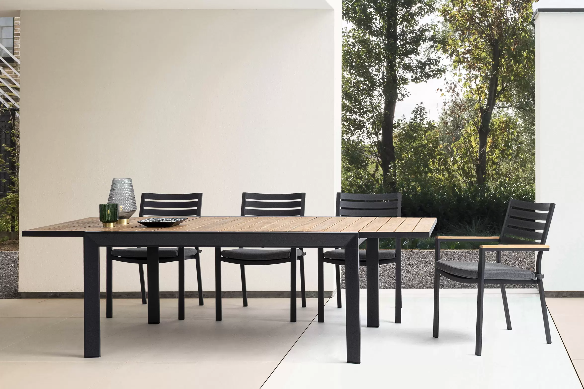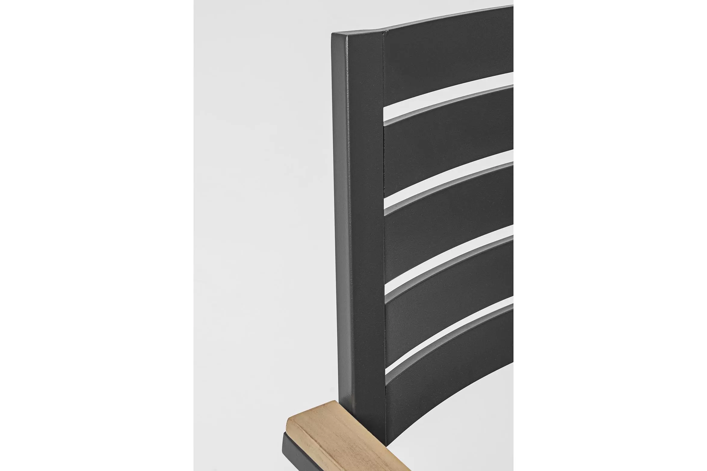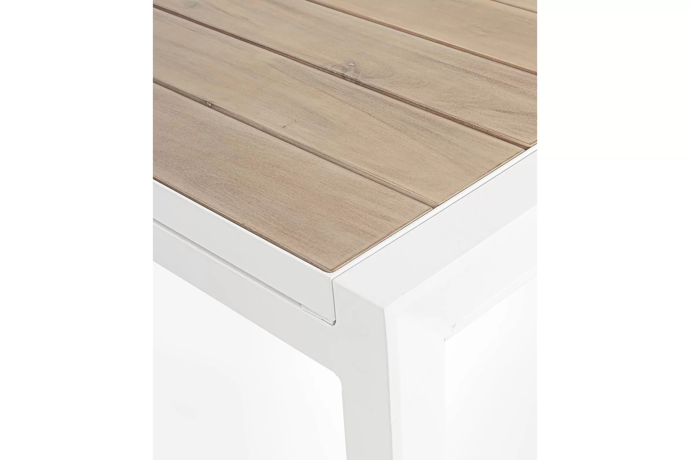 Blat stołu oraz podłokietniki krzeseł aluminiowe z powłoką imitującą drewno z 2 odcieniach.
