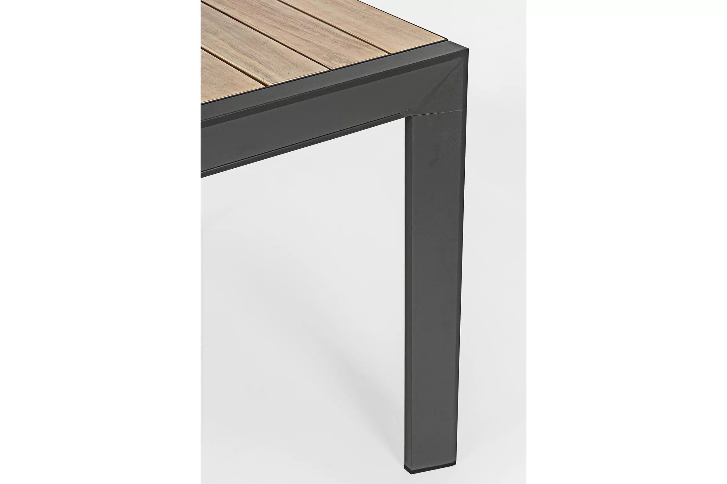 Konstrukcja aluminiowa stołu i mebli malowana proszkowo. "Deseczki" blatu pokryte malowaniem z imitacją drewna (technologia malowania imitująca powierzchnię drewnianą - stosowane także w stolarce okiennej aluminiowej) .