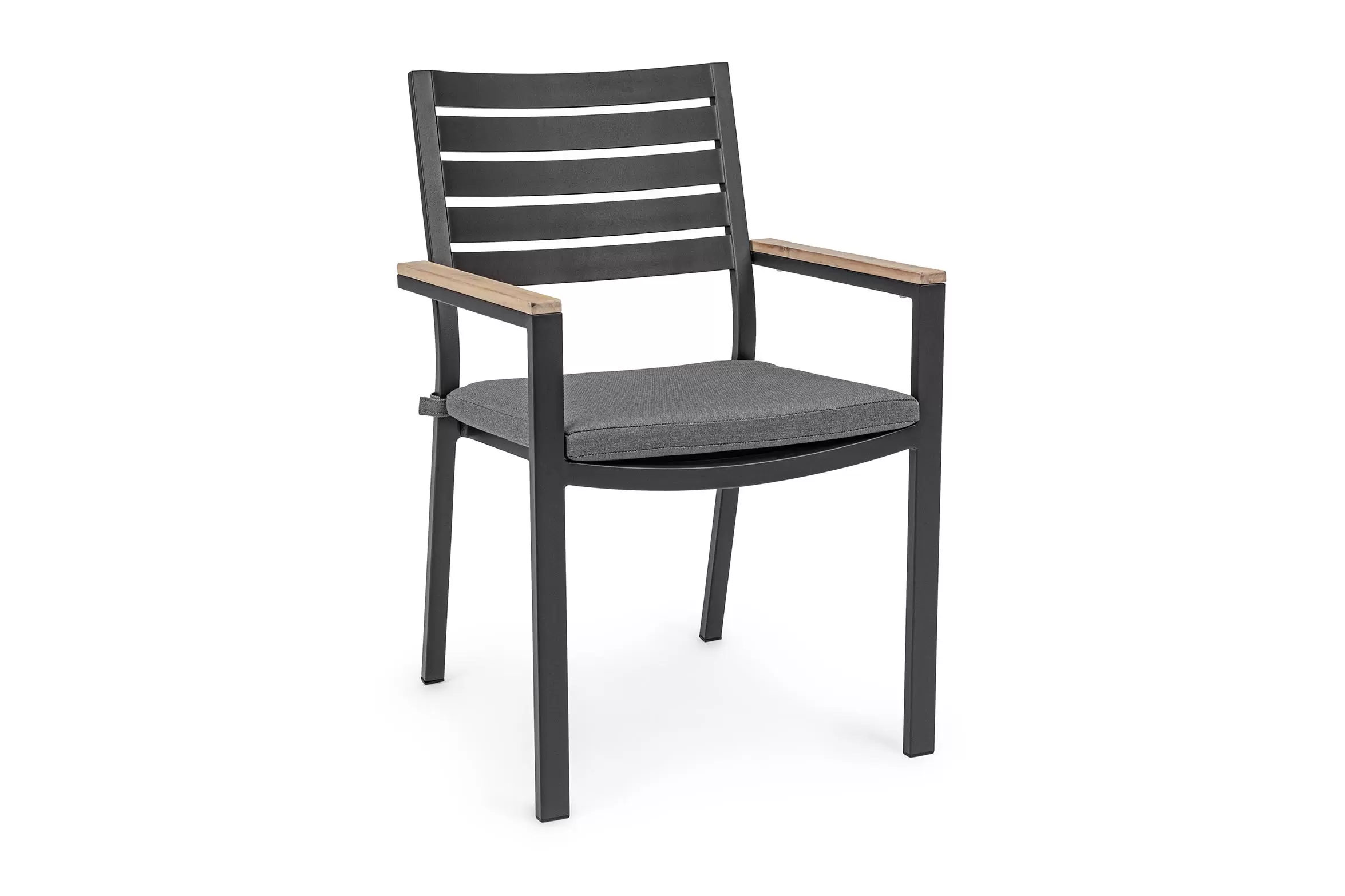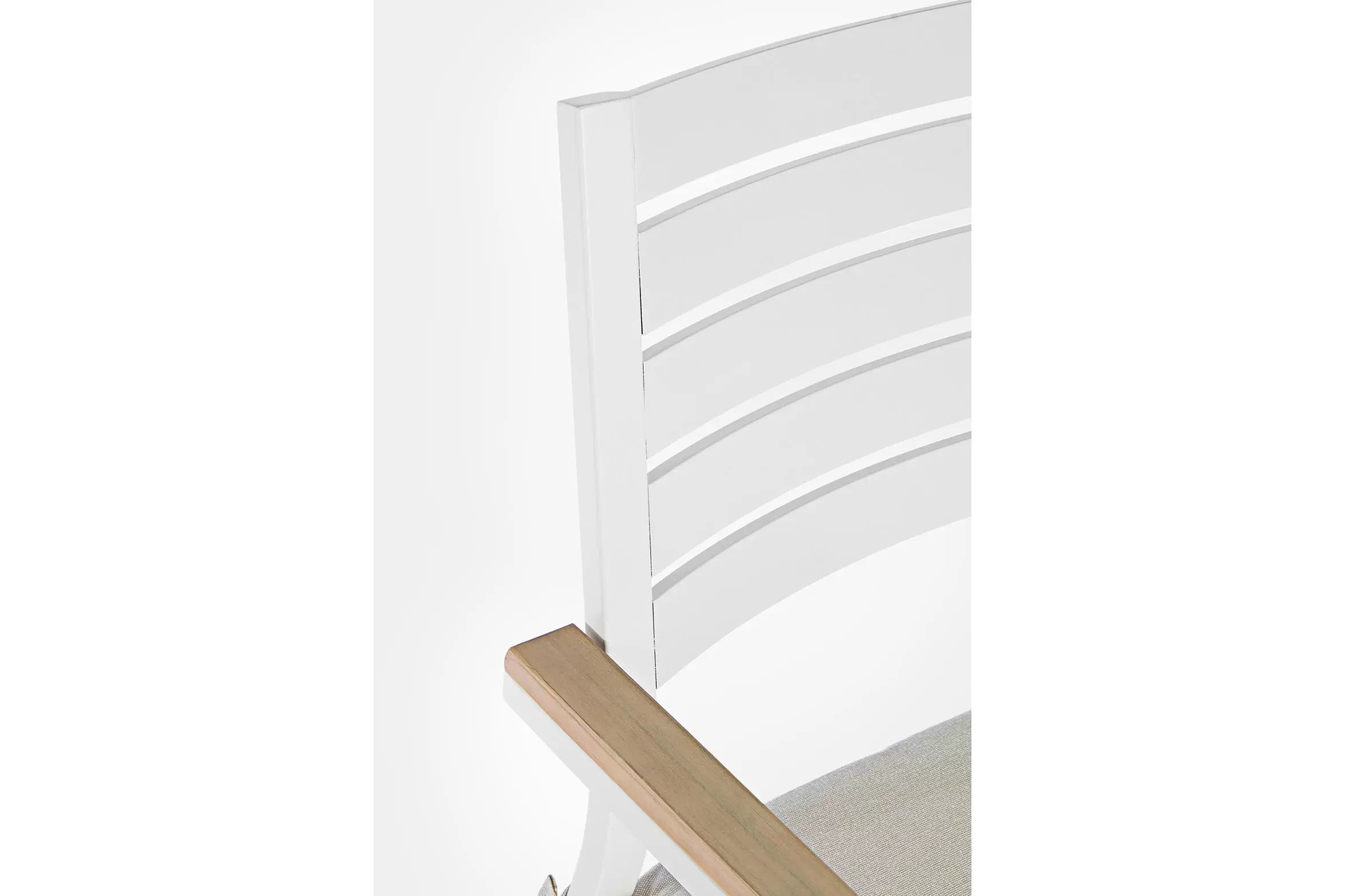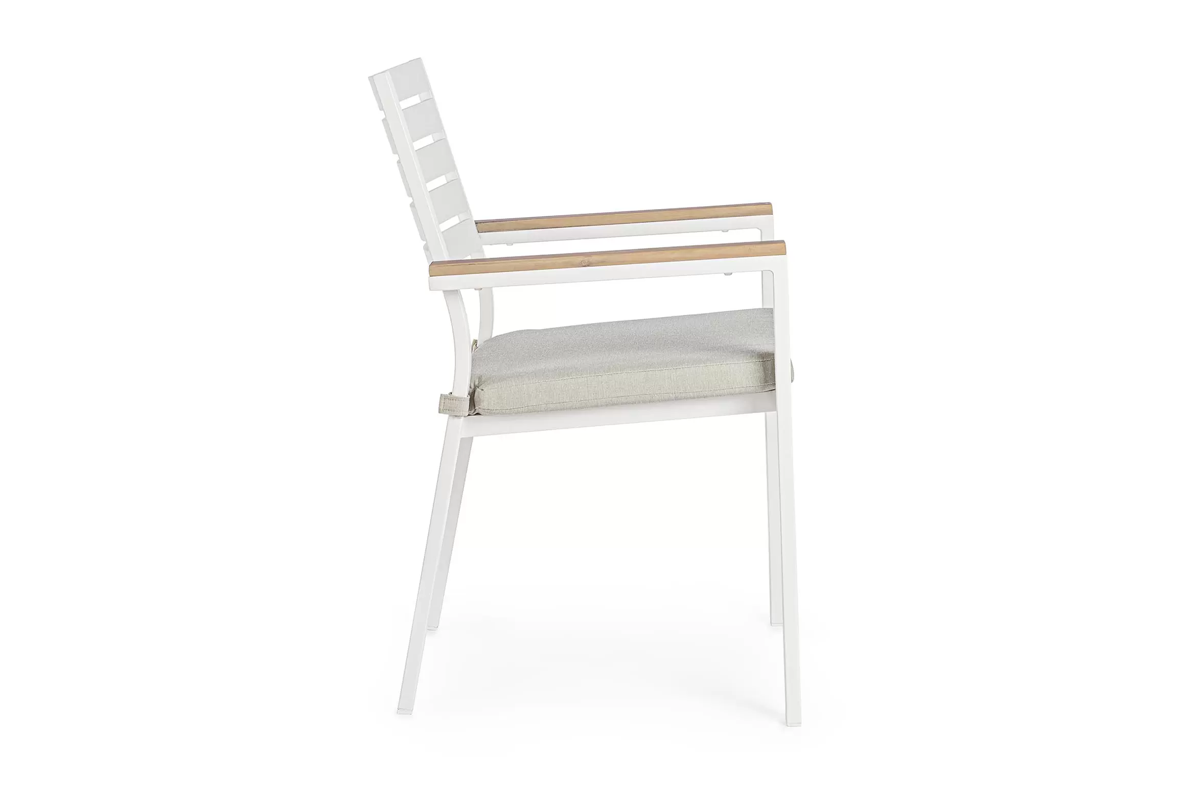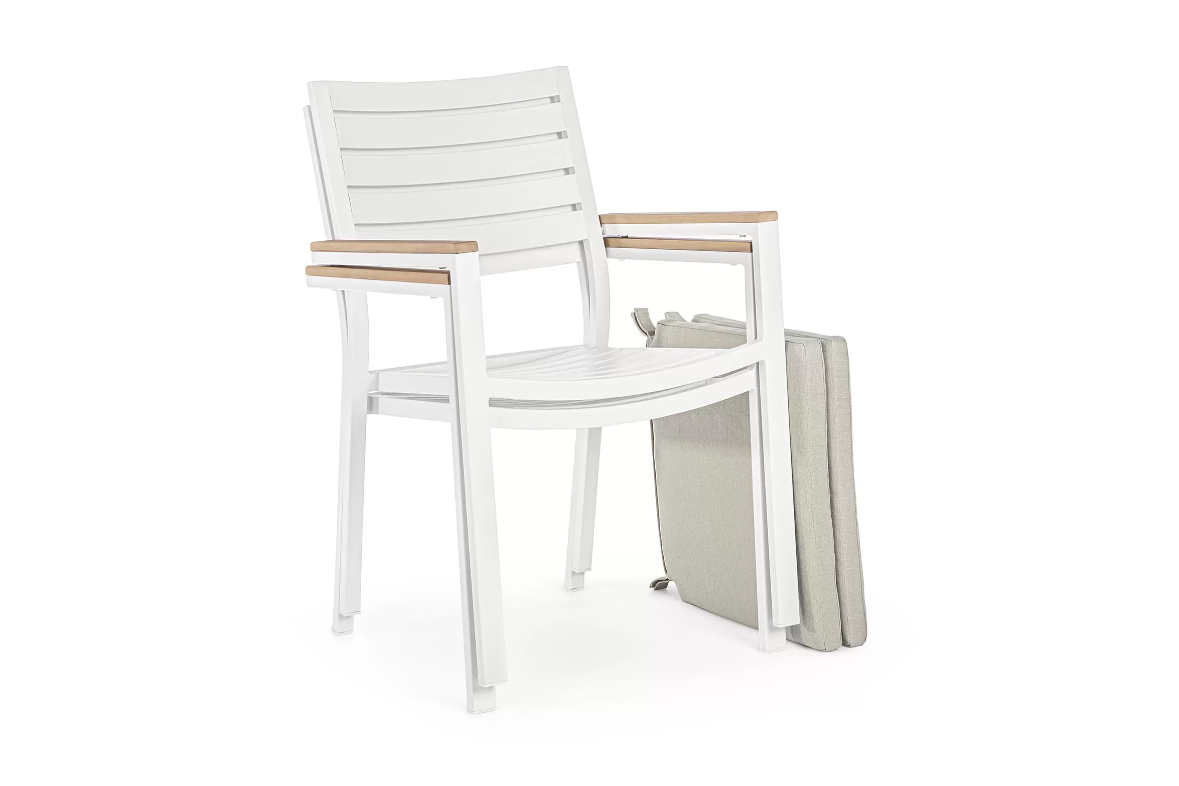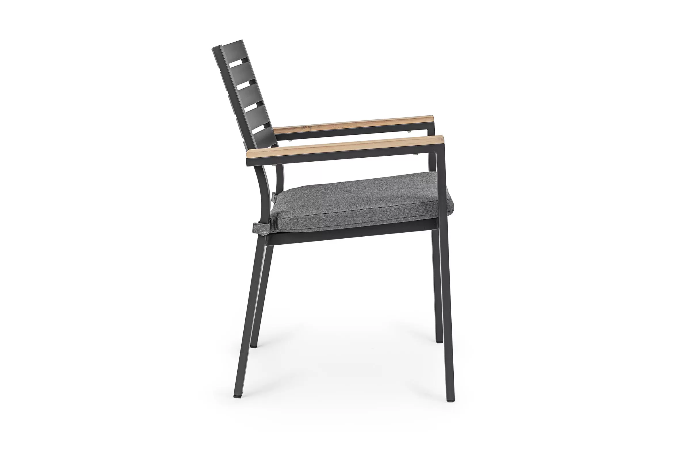 Aluminiowe krzesło ogrodowe z poduszką z podłokietnikami pokrytymi powłoką imitującą drewno.