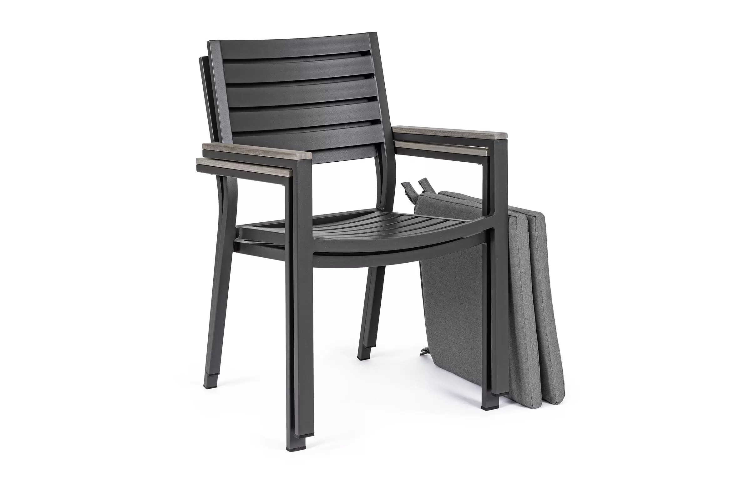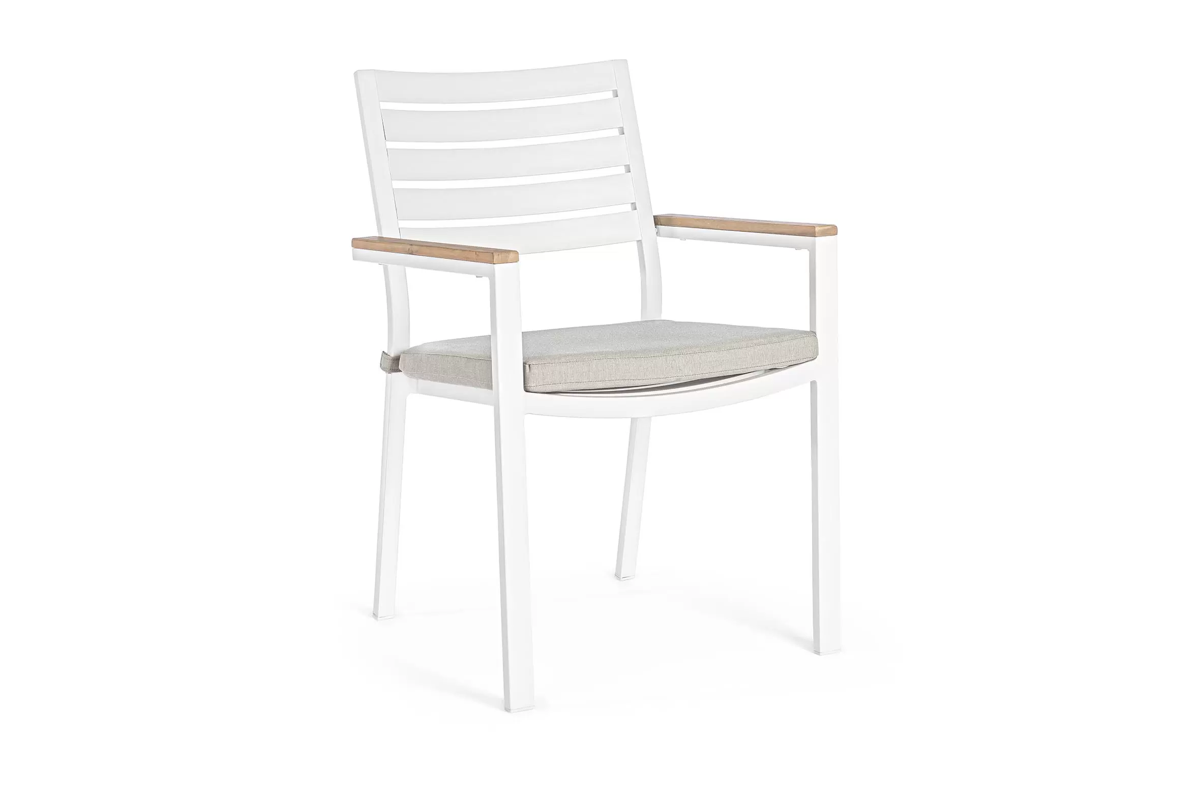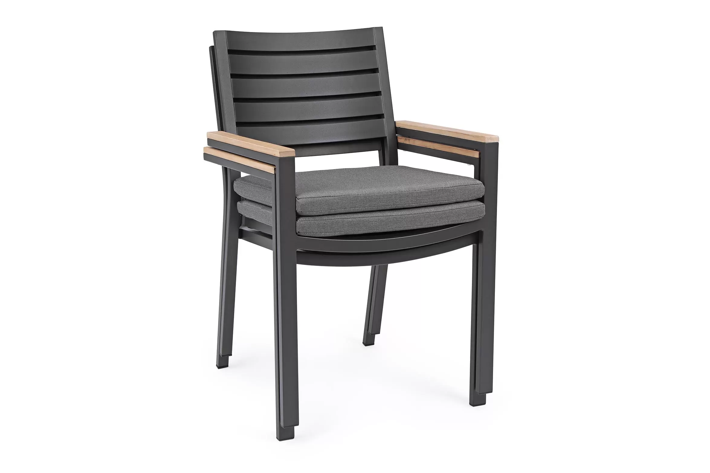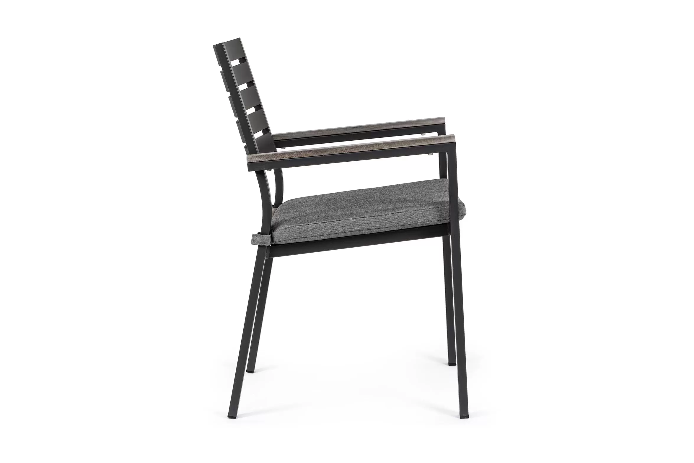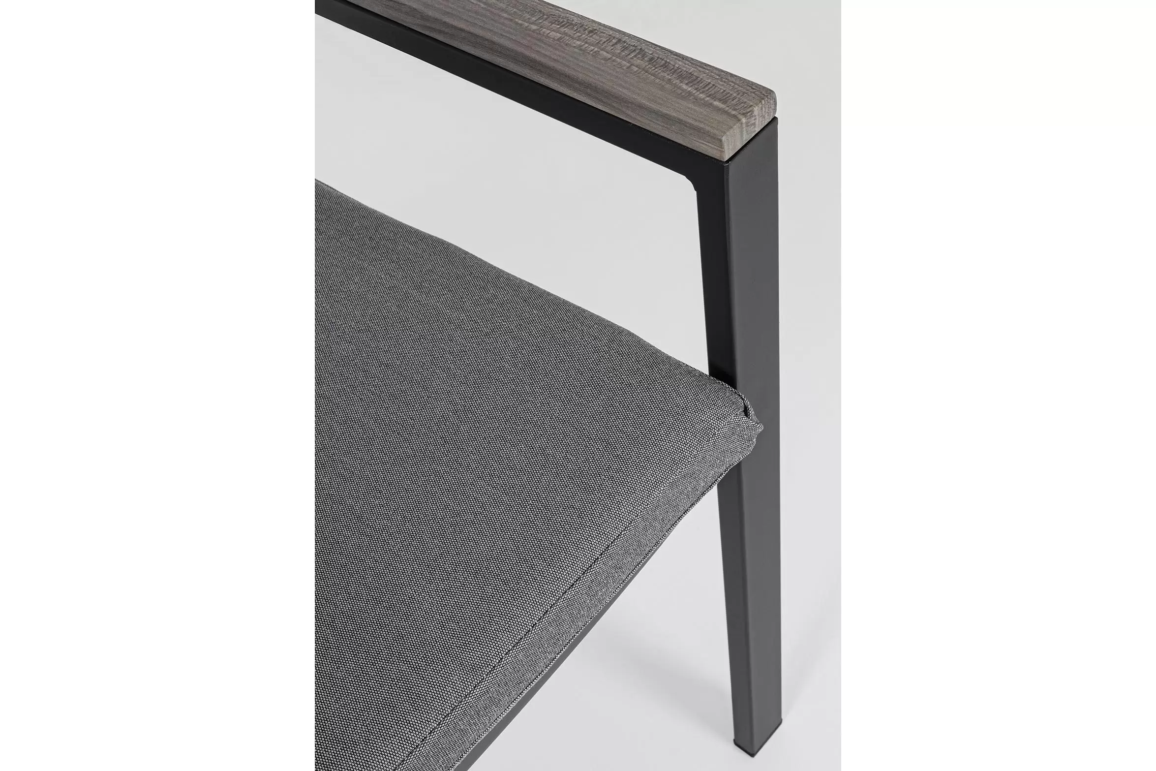 Aluminiowe krzesło ogrodowe z poduszką z podłokietnikami pokrytymi powłoką imitującą drewno.